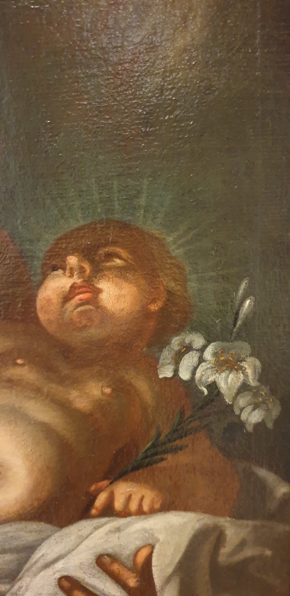 Interessante dipinto del 600 ritraente san Giuseppe con bambino ,dipinto dalla materia brillante ma nello stesso tempo delicato. Di grande effetto il dipinto è minuzioso nella ricerca dei particolari, un dipinto in ottime condizioni dalla bella qualità indiscutibile, di scuola veneta .Ottima la misura che è di cm.95 x 80 e cm.80 x 65 la sola tela . Dipinto di pregio che saprà arricchire di fascino la vostra dimora. Se avete domande non esitate a contattarmi! . Si rilascia ricevuta fiscale a norma di legge e garanzia autenticità con foto. Non dimenticate di guardare tutte le mie altre proposte! Si tratta di un’opera antica e non di banale rifacimento. Pagamenti accettati: bonifico bancario; costo di SPEDIZIONE GRATUITA IN TUTTA EUROPA , packaging altamente professionale.