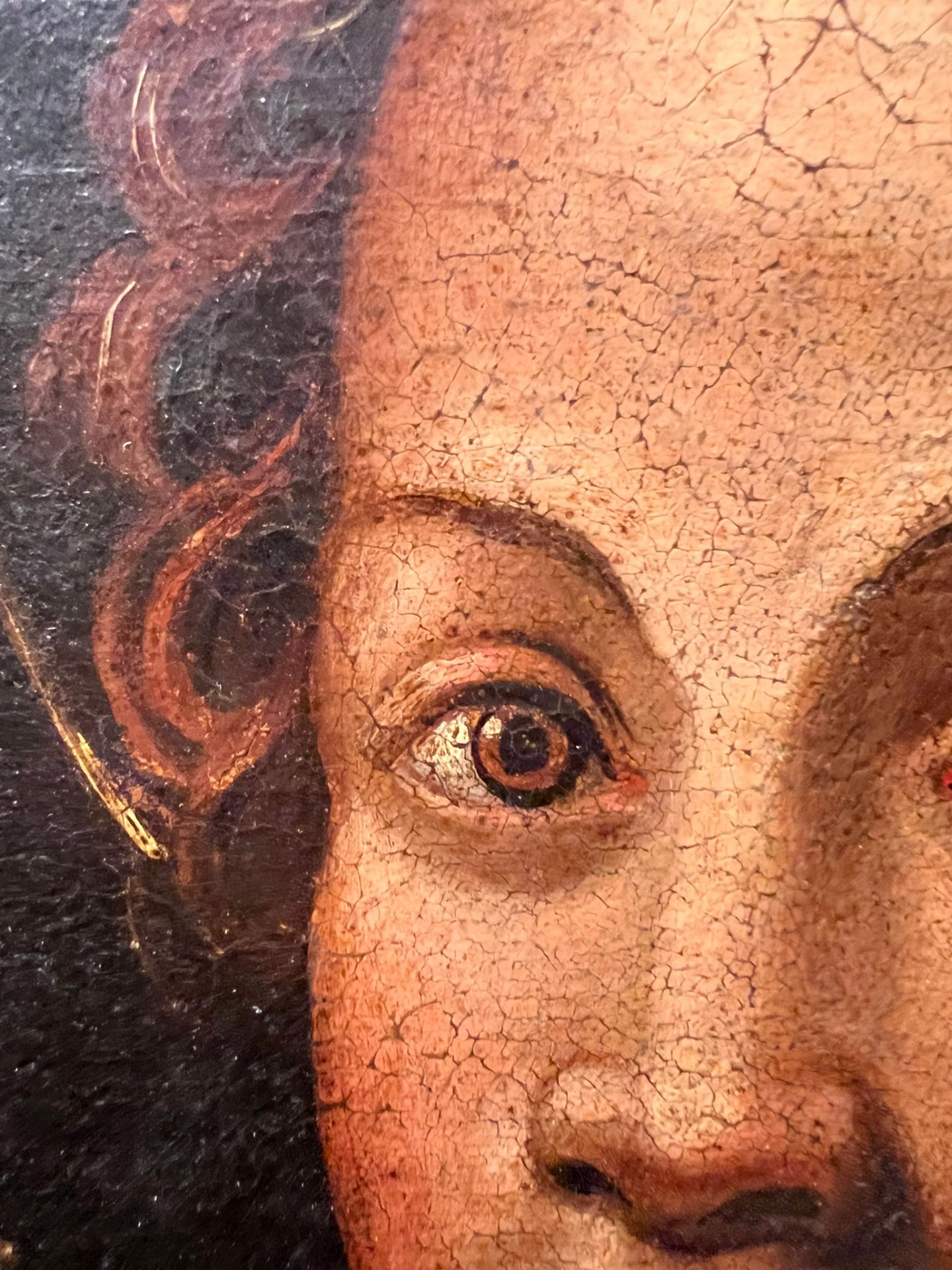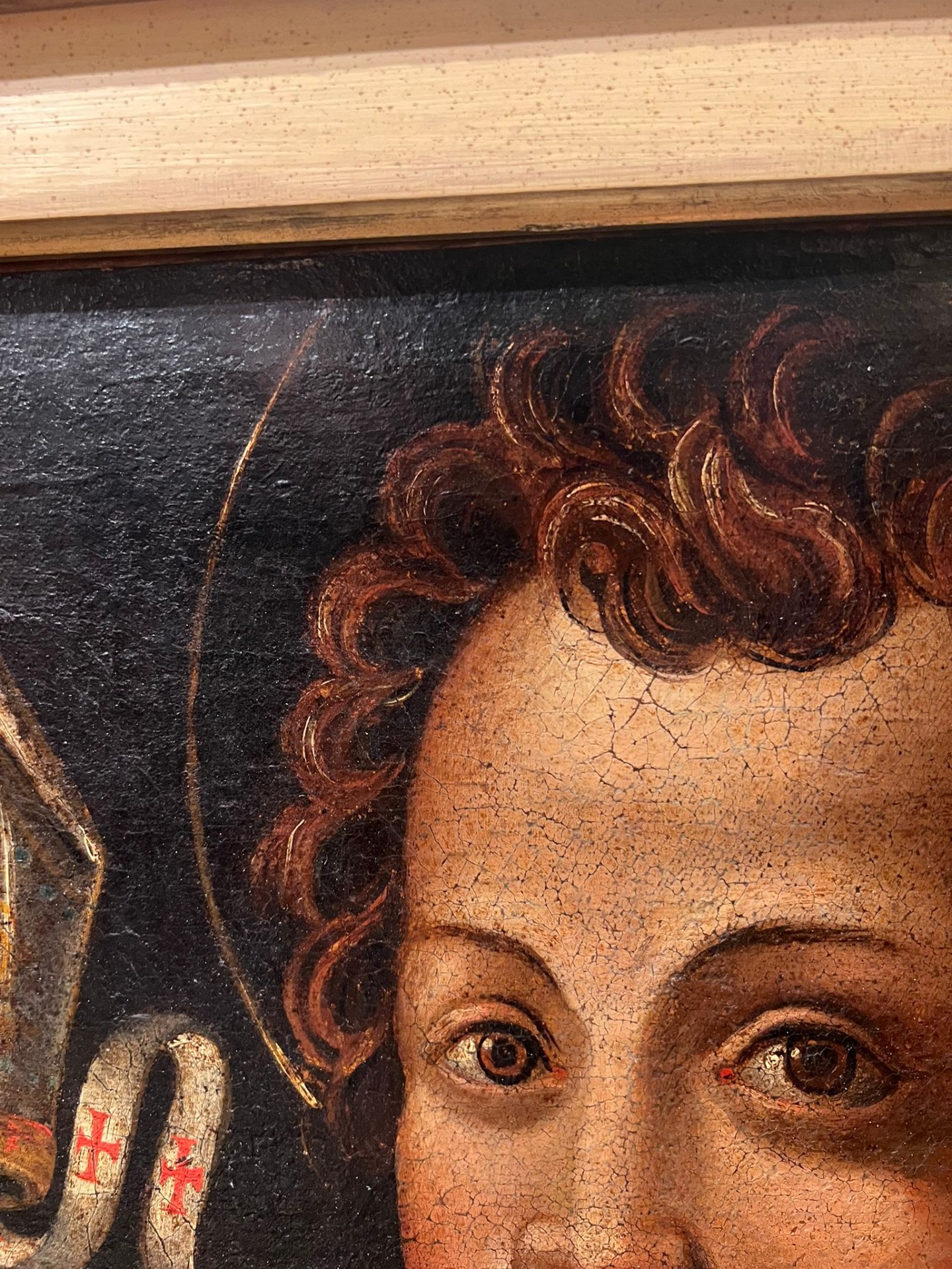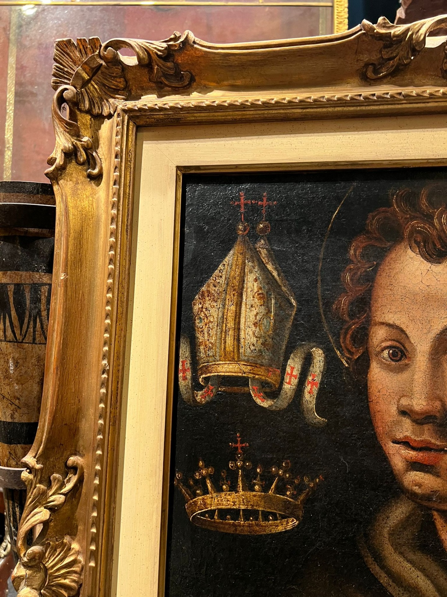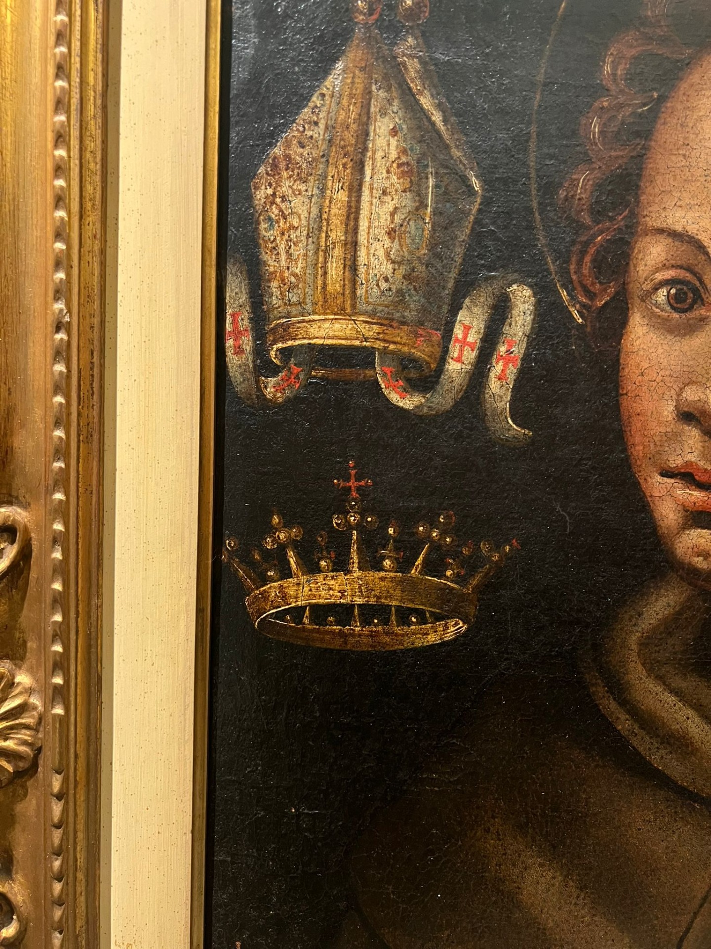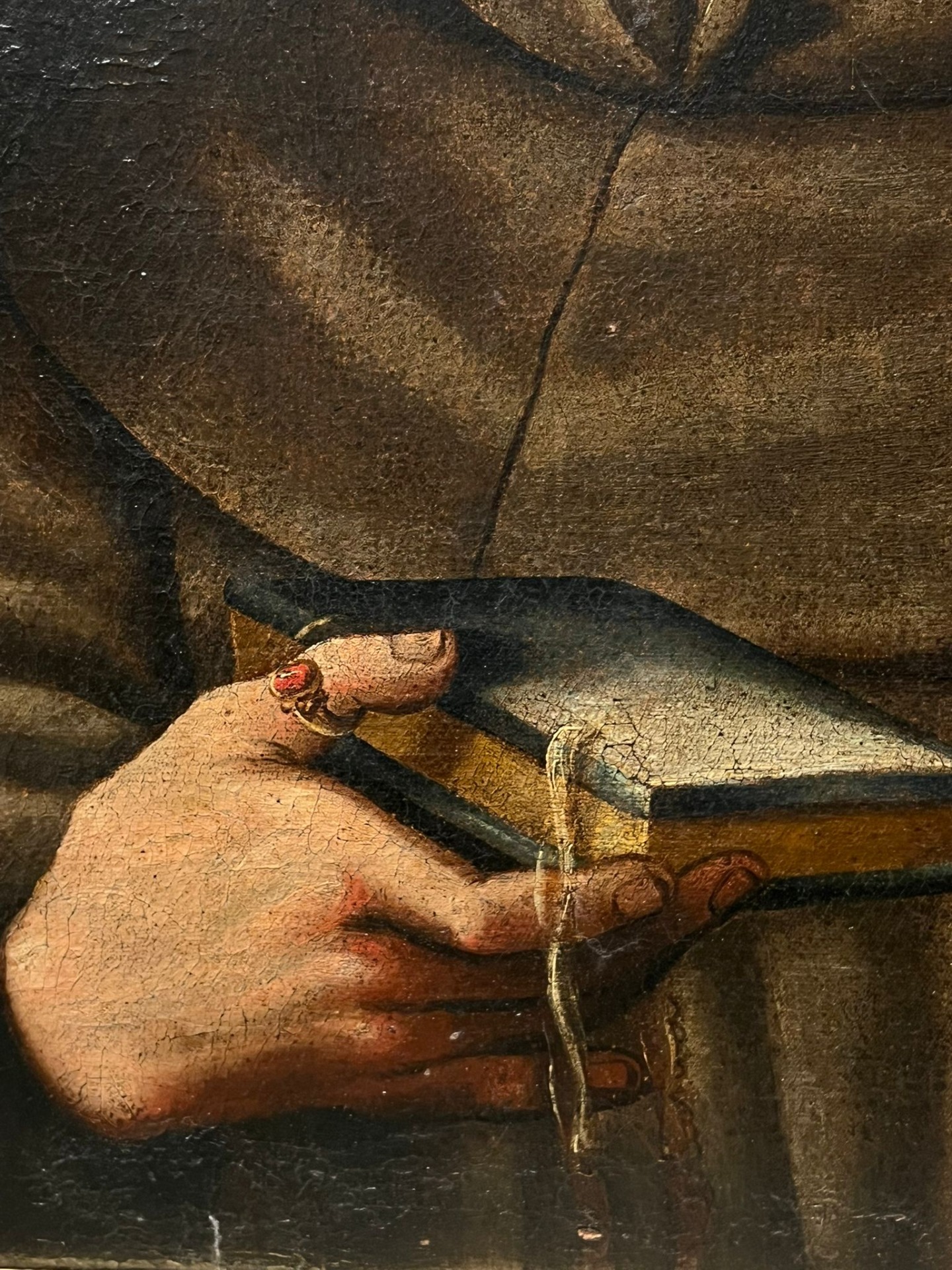 Raro dipinto ad olio su tela seicentesco raffigurante un santo vescovo dell’ordine francescano, identificabile per il saio bruno e il pastorale dorato che emerge sul fondo scuro.Il santo è rappresentato con lo sguardo rivolto verso l’osservatore con un libro nella mano sinistra, simbolo della dottrina e della sapienza spirituale. A sinistra del volto, si distinguono una mitra vescovile e una corona, attributi che alludono alla dignità ecclesiastica e alla santità del personaggio.