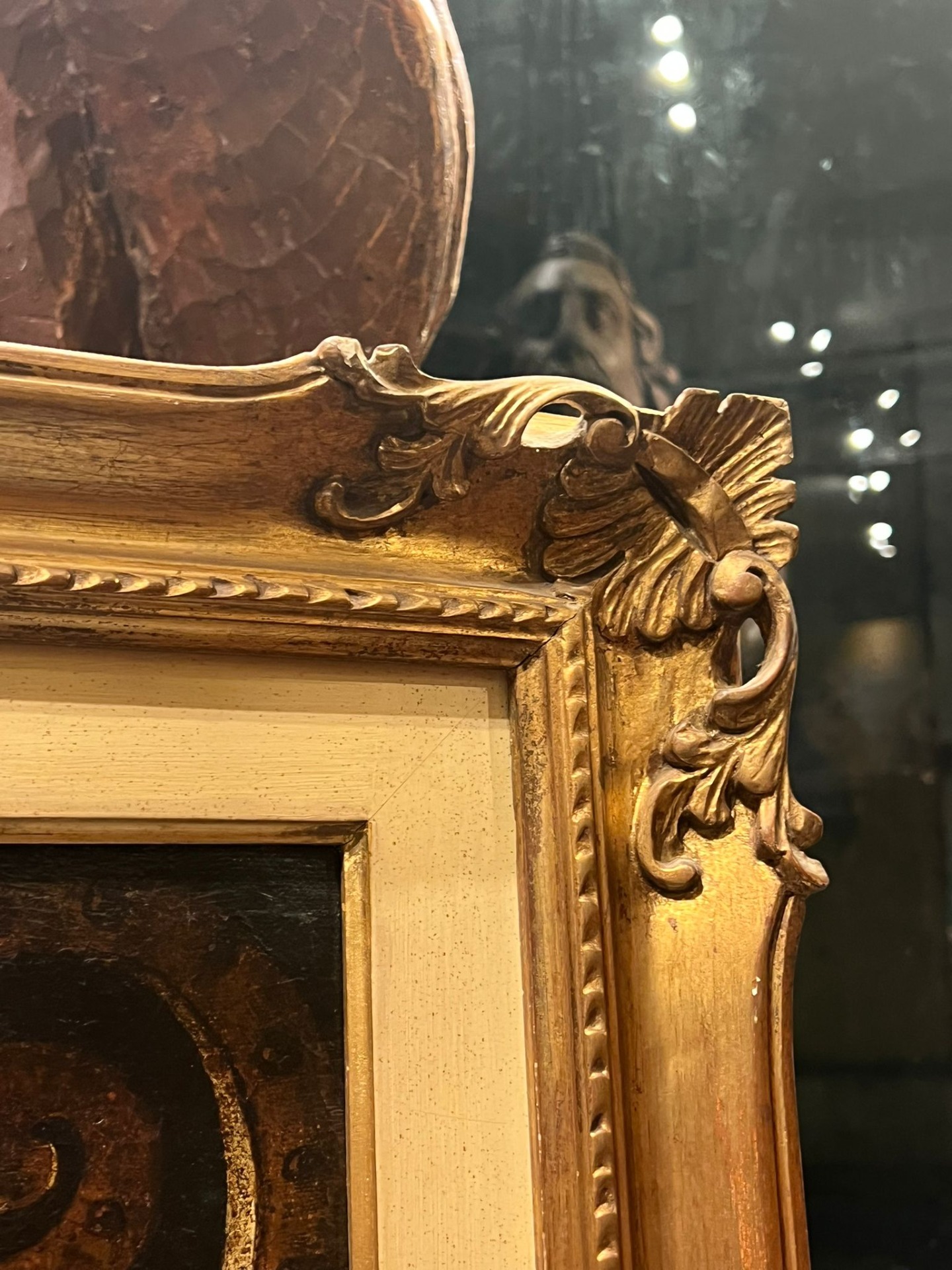 Cornice dorata finemente intagliata con motivi vegetali e conchiglie agli angoli.