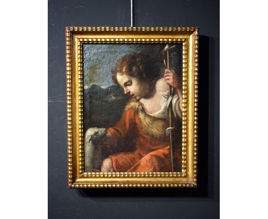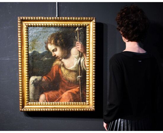 San Giovanni Battista Bambino Scuola Emiliana del '600   Olio su tela Bella cornice dorata   Misure tela cm.  58 x 46 Misure cornice cm. 70 x 58 Ottime condizioni   Un' immagine di grande fascino e particolarmente suggestiva che raffigura il piccolo...