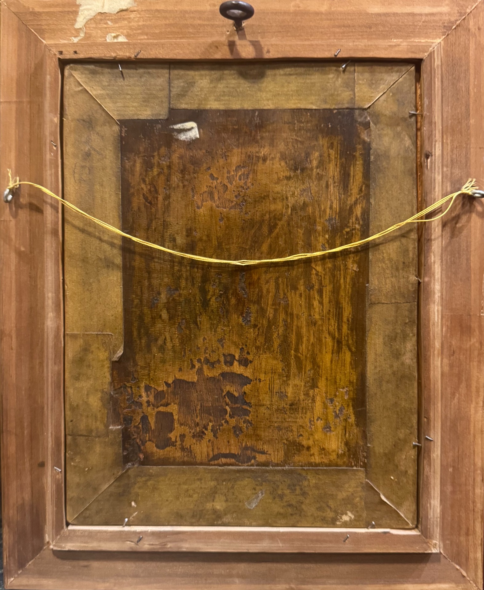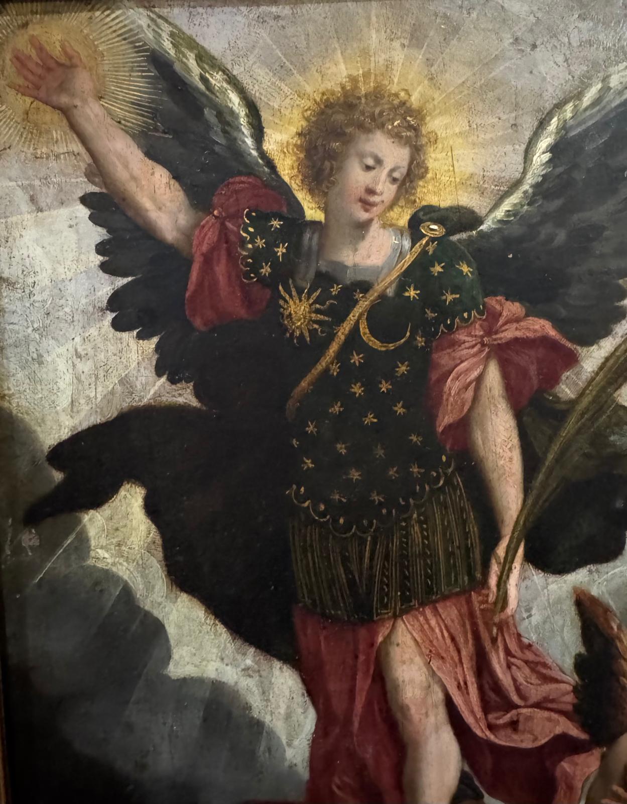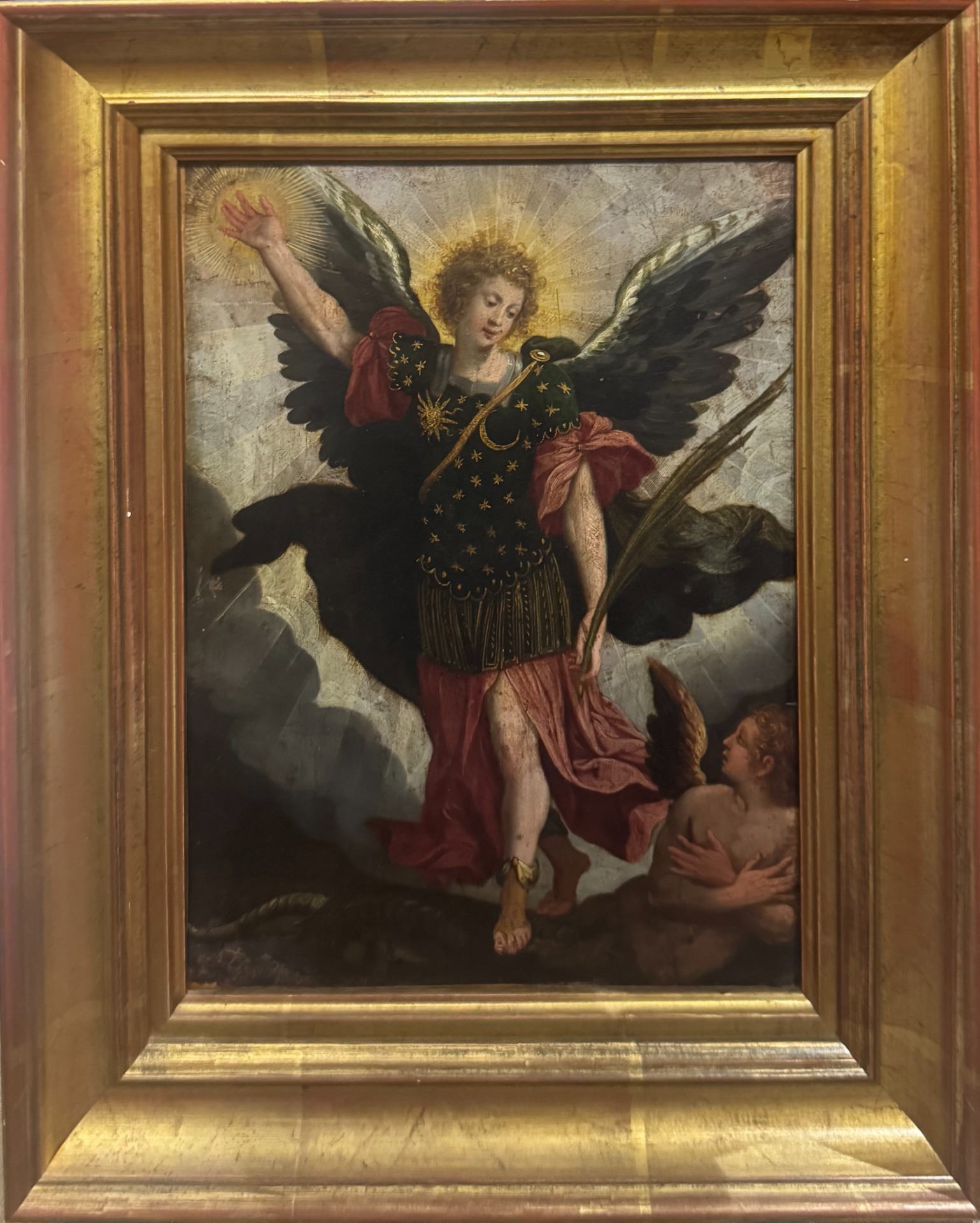 Affascinante dipinto antico ad olio su rame, applicato su tavoletta, raffigurante un maestoso Arcangelo Michele in posa trionfante. L’opera mostra una figura angelica circondata da una luminosità dorata che ne esalta la presenza divina. Il capo è rivolto verso il basso, i lineamenti sono dolci e raffinati, i riccioli dorati e il capo è avvolto da un’aureola. Indossa un’elegante corazza scura impreziosita da stelle dorate e un mantello rosso mosso con delicatezza dal vento. Nella parte inferiore della scena, San Michele domina e schiaccia una creatura demoniaca, simbolo della vittoria del bene sul male. La composizione è ricca di dettagli, dai riflessi sulla corazza alle delicate sfumature del volto, tipiche della pittura sacra tardo manierista. Il rame è attribuito a Bernardino Cesari (1571-1622), maestro e protagonista della scuola romana tra manierismo e primo barocco e fratello del celebre Cavaliere d’Arpino. La qualità del disegno, l’uso della luce radiante e la raffinatezza delle figure rientrano pienamente nel suo linguaggio pittorico.