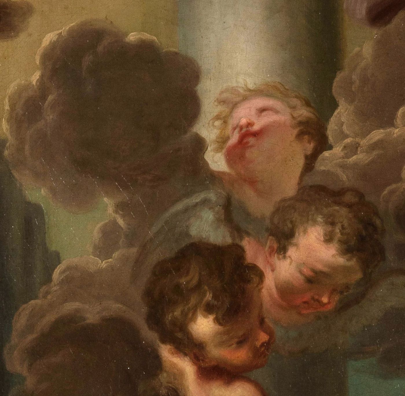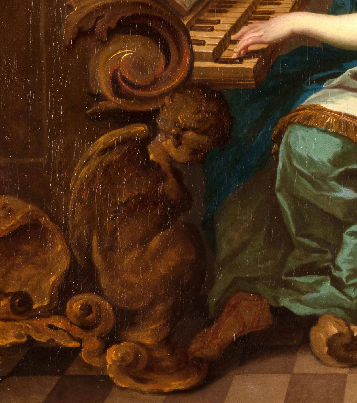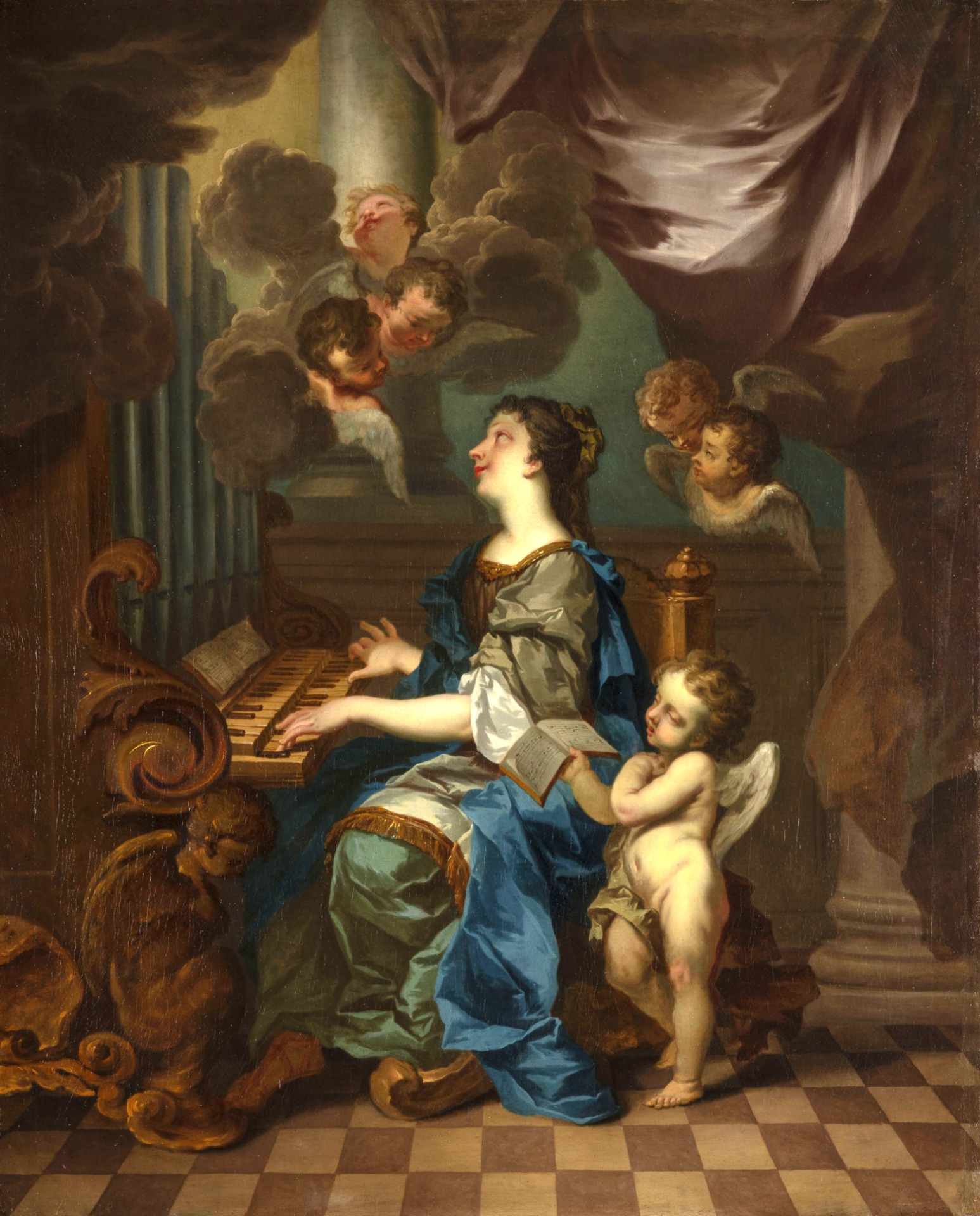 Il pregevole dipinto, in ottimo stato di conservazione, raffigura santa Cecilia mentre suona l’organo, attorniata da putti e cherubini. La santa, con sguardo assente e rivolto verso una luce mistica e divina che traspira da dietro alle canne dell’organo e a soffici nuvole, è vestita da raffinati e preziosi abiti in seta. Accanto a lei un putto le porge lo spartito musicale. La struttura dell’organo e della sedia, in legno intagliato, rispecchiano i dettami stilistici diffusi a Roma in epoca barocca. La pavimentazione a scacchi, distorta prospetticamente, invita lo sguardo dell’osservatore a convergere verso il centro della tela, ove è rappresentato il volto della santa. In secondo piano, due imponenti colonne in marno e un ricco tendaggio inquadrano la scena e fungono da quinta, aumentando la solennità compositiva.