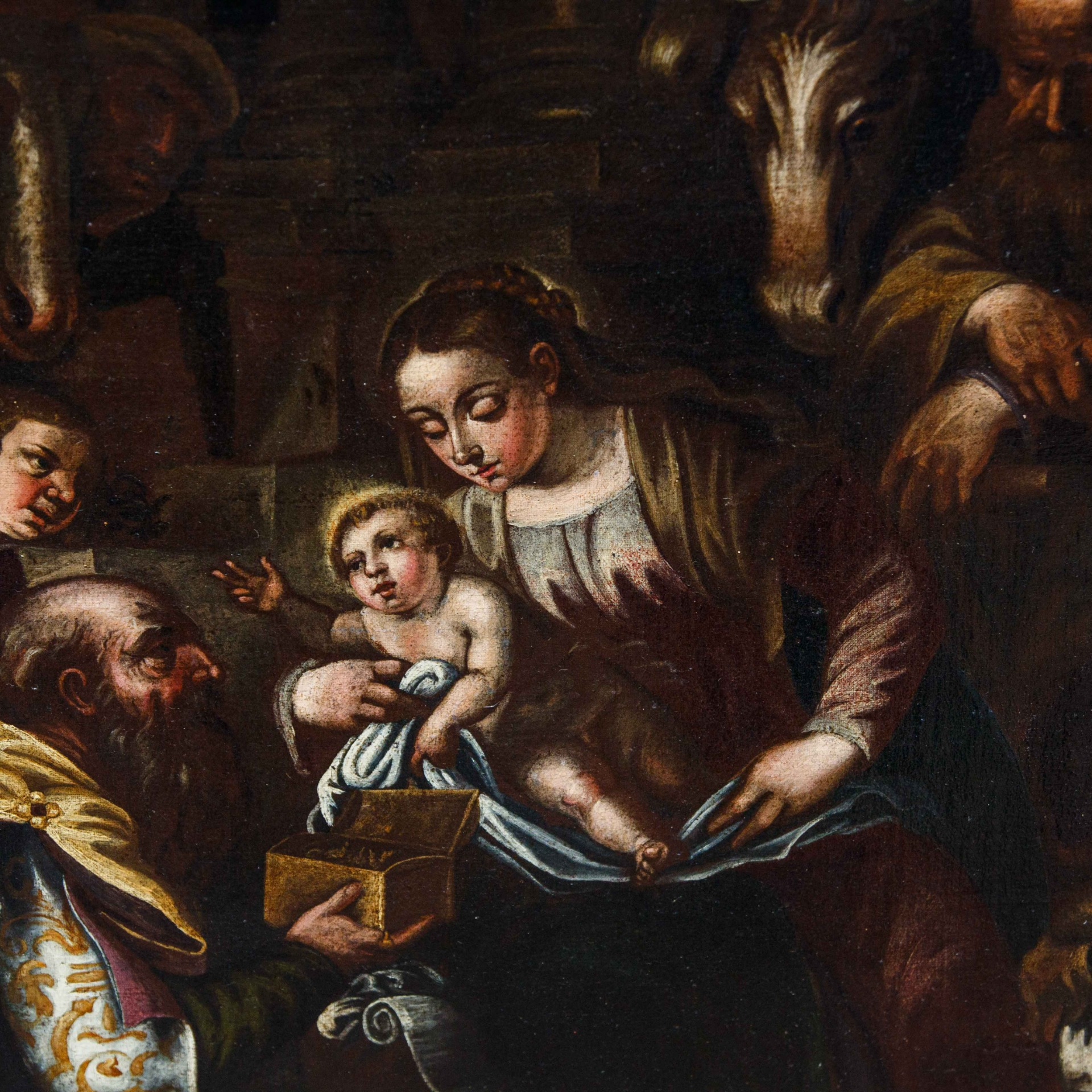 La qui presente Adorazione dei Magi mostra in effetti citazioni dai maestri veneti non solo nella presenza animale ma anche e soprattutto nella costruzione della Vergine con bambino, in posizione leggermente sopraelevata rispetto ai Magi, e l’inginocchiarsi di uno dei Re, probabilmente Melchiorre vista l’anzianità e la scatola d’oro che consegna a Gesù. Questi, infatti, sono citazione dall’Adorazione dei Magi realizzata da Francesco Maffei (Vicenza, 1605 circa – Padova, 1660), presso la Cattedrale di Vicenza che a sua volta riprende L’adorazione dei Magi di Paolo Veronese (1528-1588) alla National Gallery di Londra.