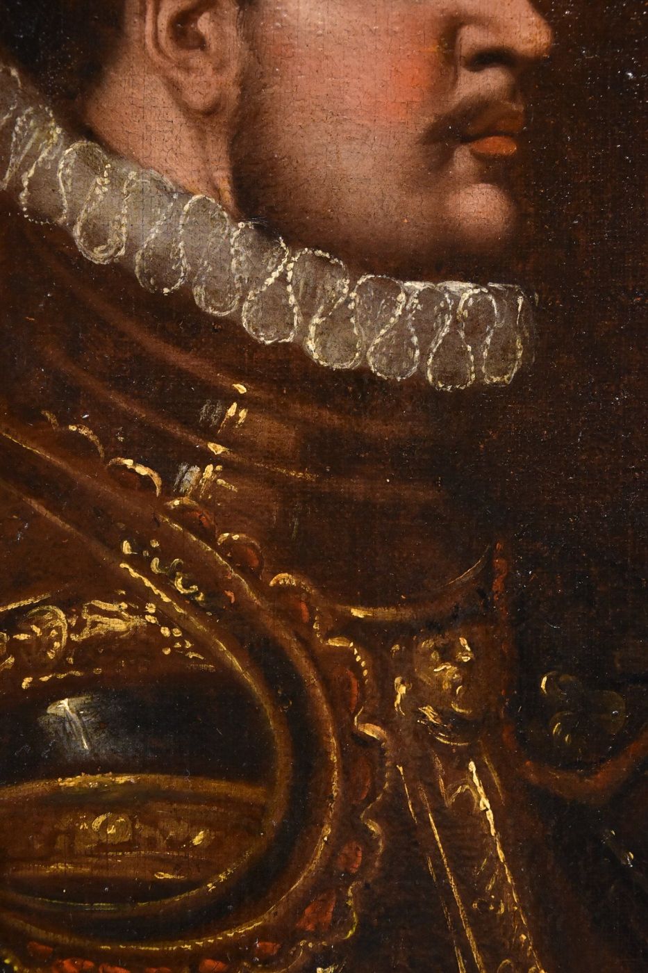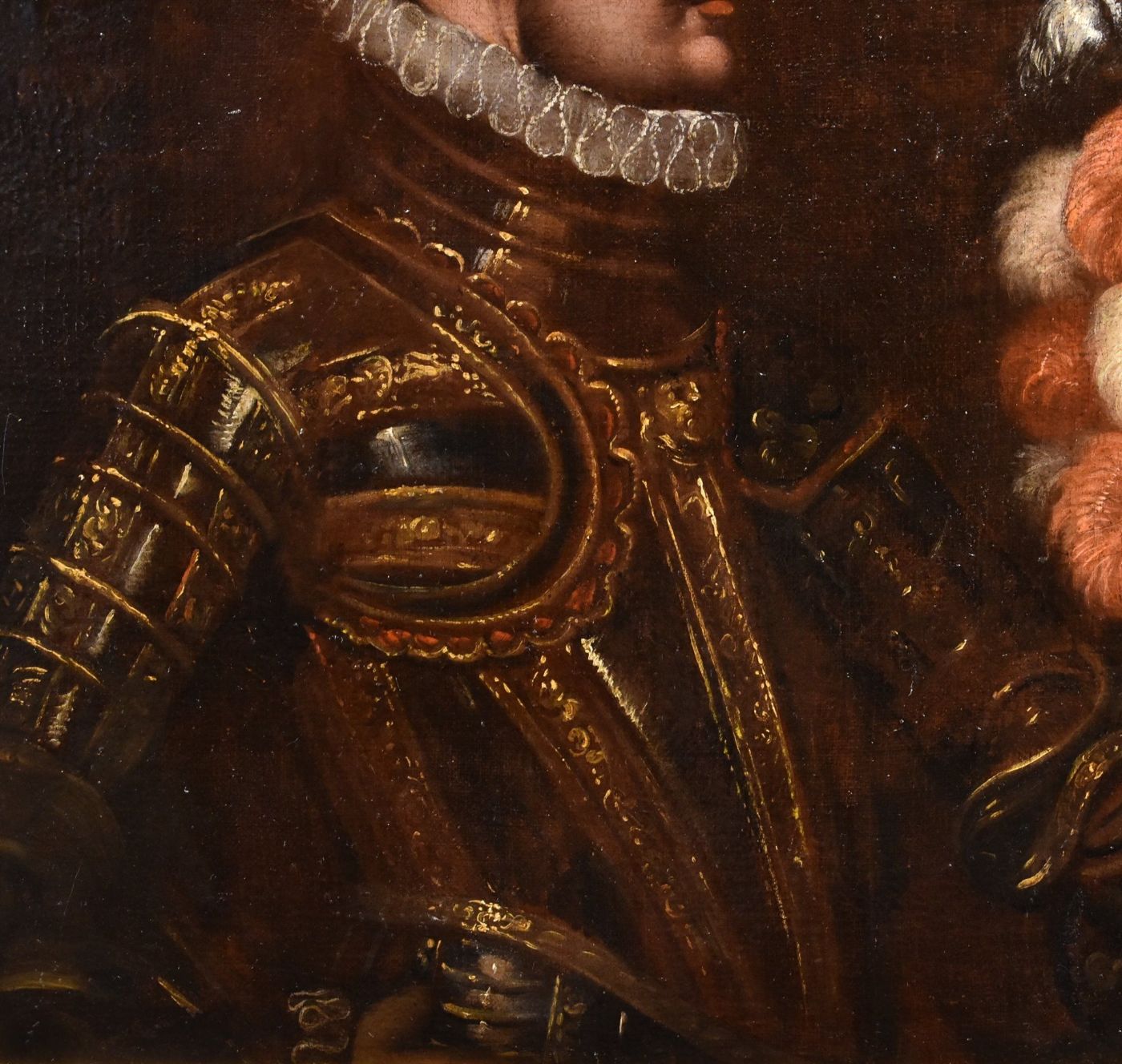 Sebbene venga dato risalto al suo ruolo di cavaliere, la posa è regale, ritratto perfettamente di profilo, affiancato da un elmo piumato poggiato su un tavolo, mentre indossa una ricca armatura cerimoniale.