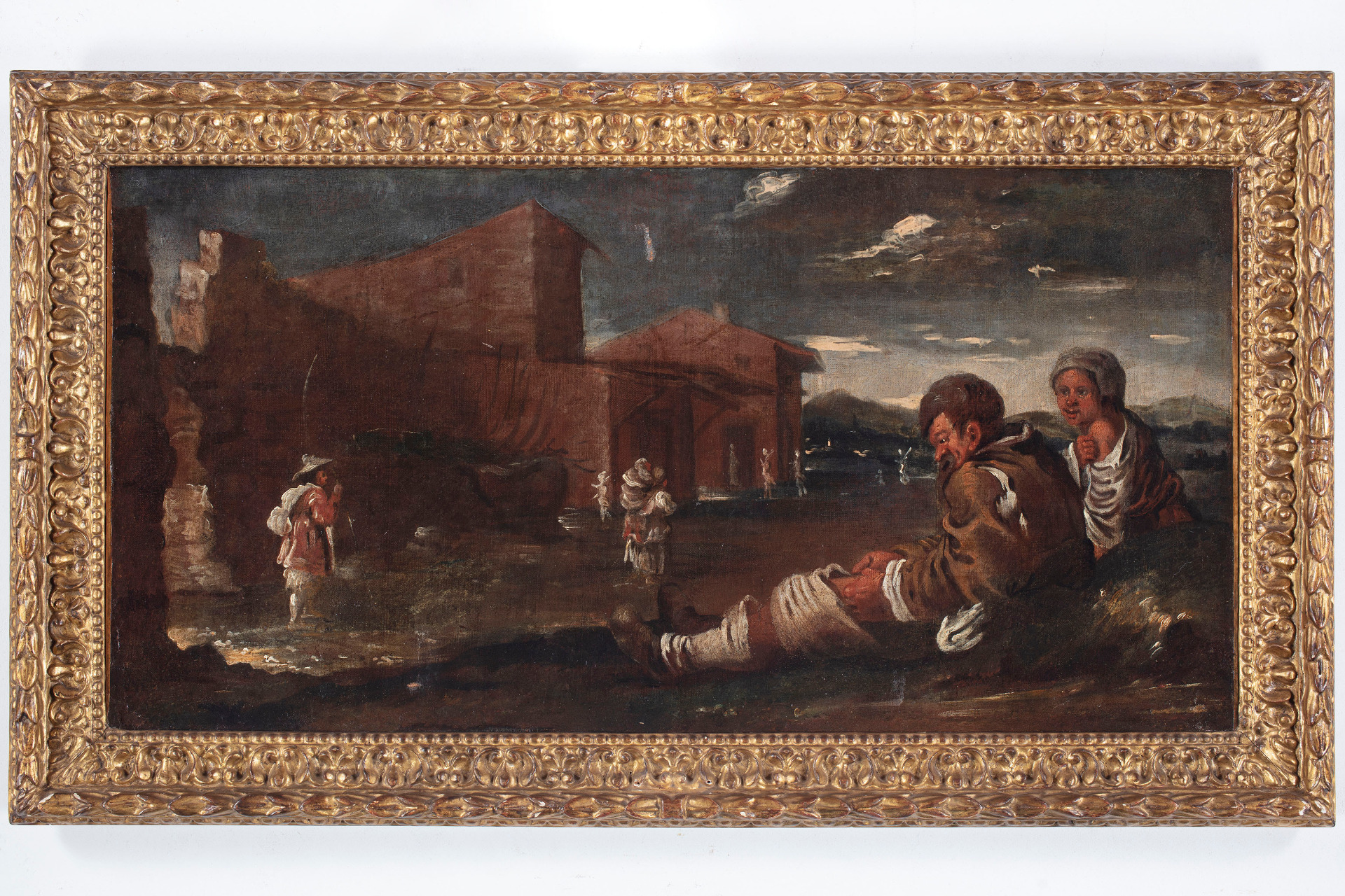 Matteo Ghidoni detto dei Pitocchi (Firenze 1626-Padova 1689) attribuibile a, Coppia di scene popolaresche, olio su tela, misure 38.5x77.5 cm, con cornice misure 50x88 cm.