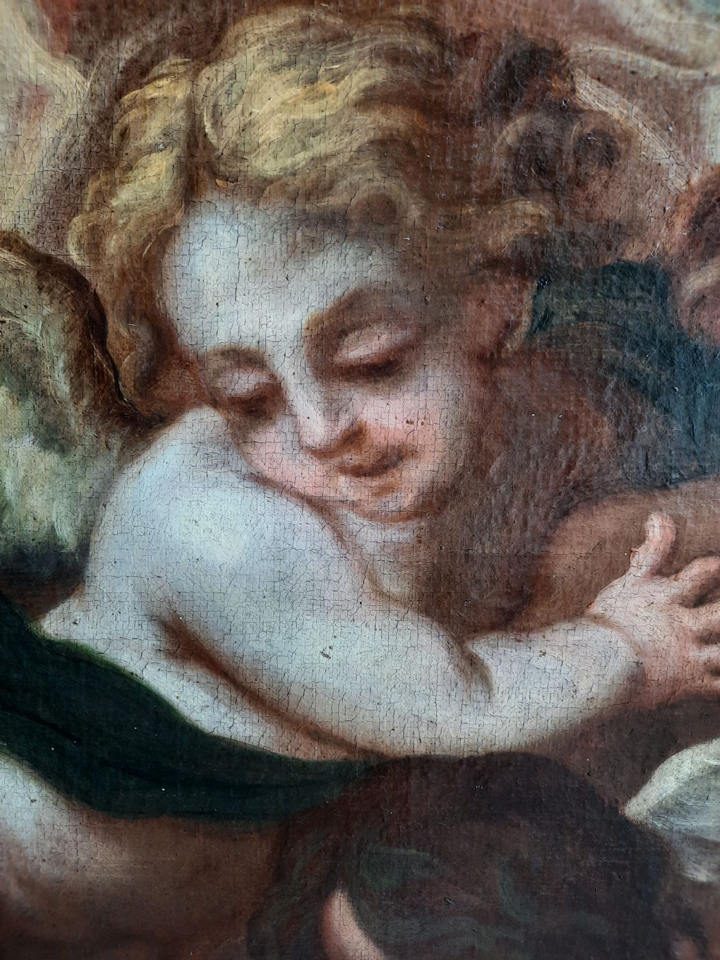 Dipinto in ottime condizioni, di grande maestria e qualità pittorica, opera di un Artista di Scuola italiana primi del sec. XVIII. se non a cavallo.L' Artista dipinge tre angeli sorpresi a guardare dall'alto, la sensazione di grazia che offre la scena è enfatizzata dalle pose aggraziate degli angioletti e dall'uso magistrale della tavolozza.