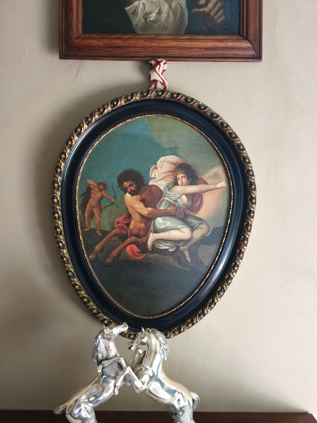 Di grande qualita' questo olio su tela in perfette condizioni, nel mondo di Stefano Pozzi, che narra la storia si Ercole e Dejanira Craqueler uniforme. Bella mano. Cornice antica di forma inusuale . Misura 80x65 cm totale