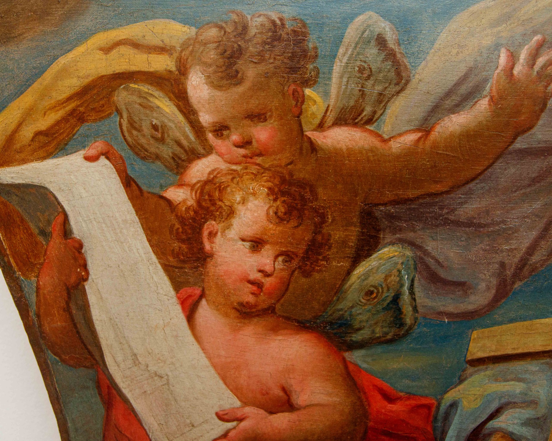 Le due tavole, attribuibili alla scuola emiliana del Settecento, mostrano uno stile tipico dell'epoca, caratterizzato da composizioni dinamiche, figure femminili opulente ed una luce che esalta i panneggi ricchi e gli incarnati morbidi dei cherubini. Si tratta verosimilmente di frammenti di decorazioni più ampie, forse provenienti da una volta affrescata o da una pala d'altare, data la loro forma irregolare e la rappresentazione di figure sospese tra le nuvole. Le figure femminili centrali sono rappresentazioni allegoriche, come era consuetudine nella pittura celebrativa e decorativa del Barocco e del Rococò.