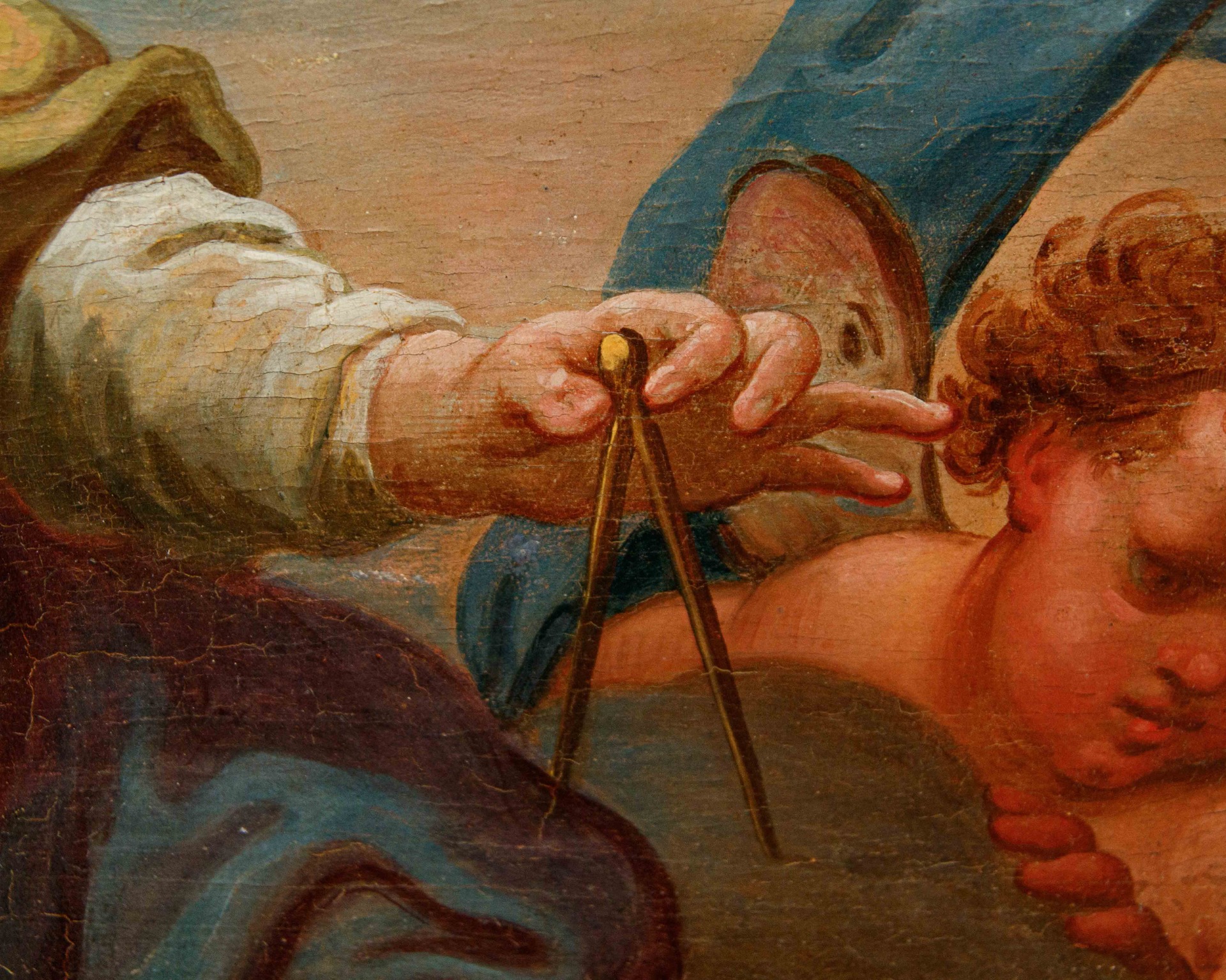 La prima ci mostra un’Allegoria della Geometria o, più in generale, delle Scienze Matematiche presentata solenne, sul suo trono di nubi attorniata da cherubini: l'attributo più distintivo è la grande squadra a forma di "L" che la donna tiene nella mano sinistra appoggiata sul suo grembo, mentre con la destra regge con eleganza un compasso, simbolo ricorrente delle Arti Liberali legate alla misurazione e all'ordine, come l'Astronomia e la Geometria stessa. Il cherubino in primo piano sulla sinistra regge un rotolo srotolato, su cui non sono visibili segni, ma che suggerisce la presenza di calcoli, disegni o formule.
