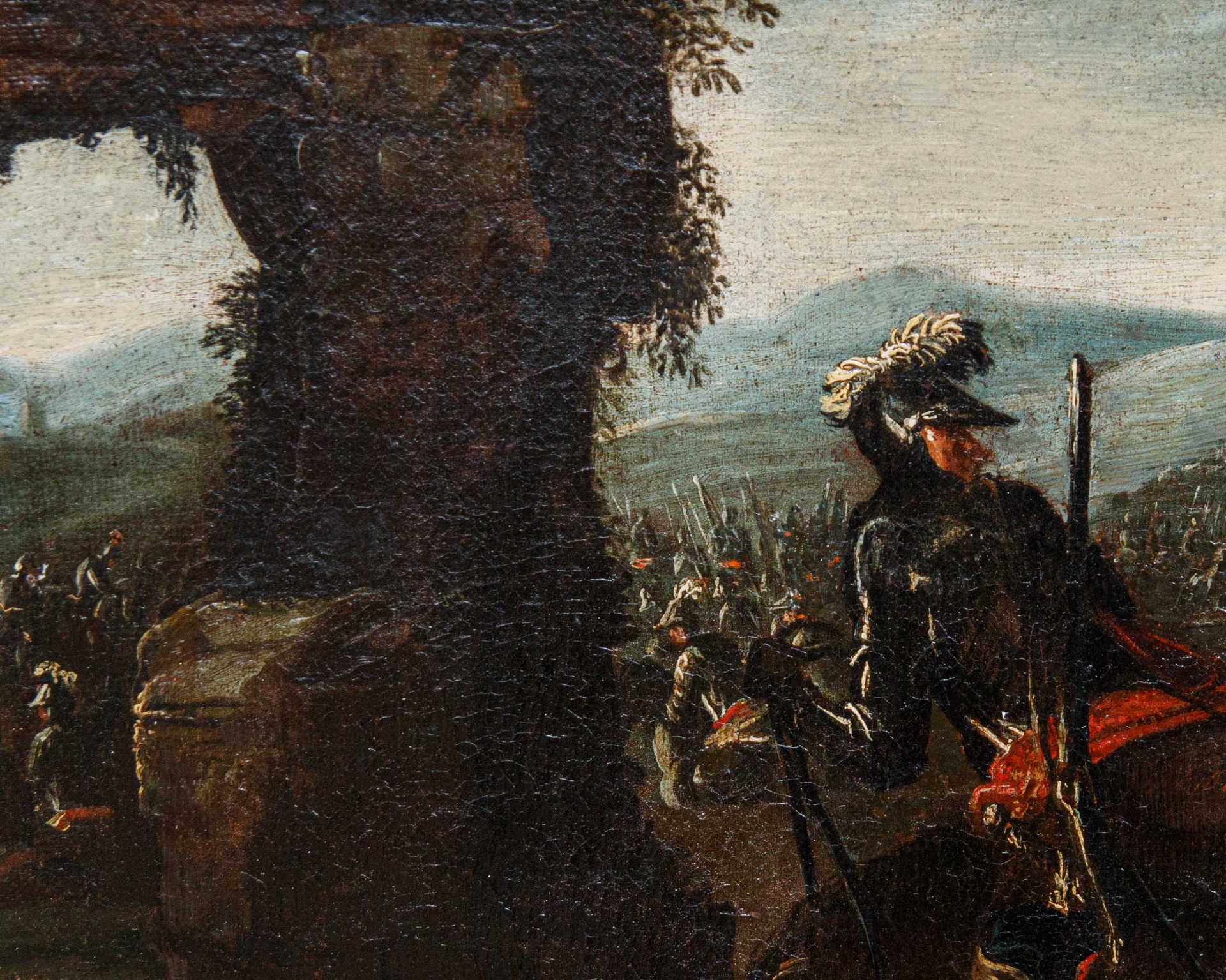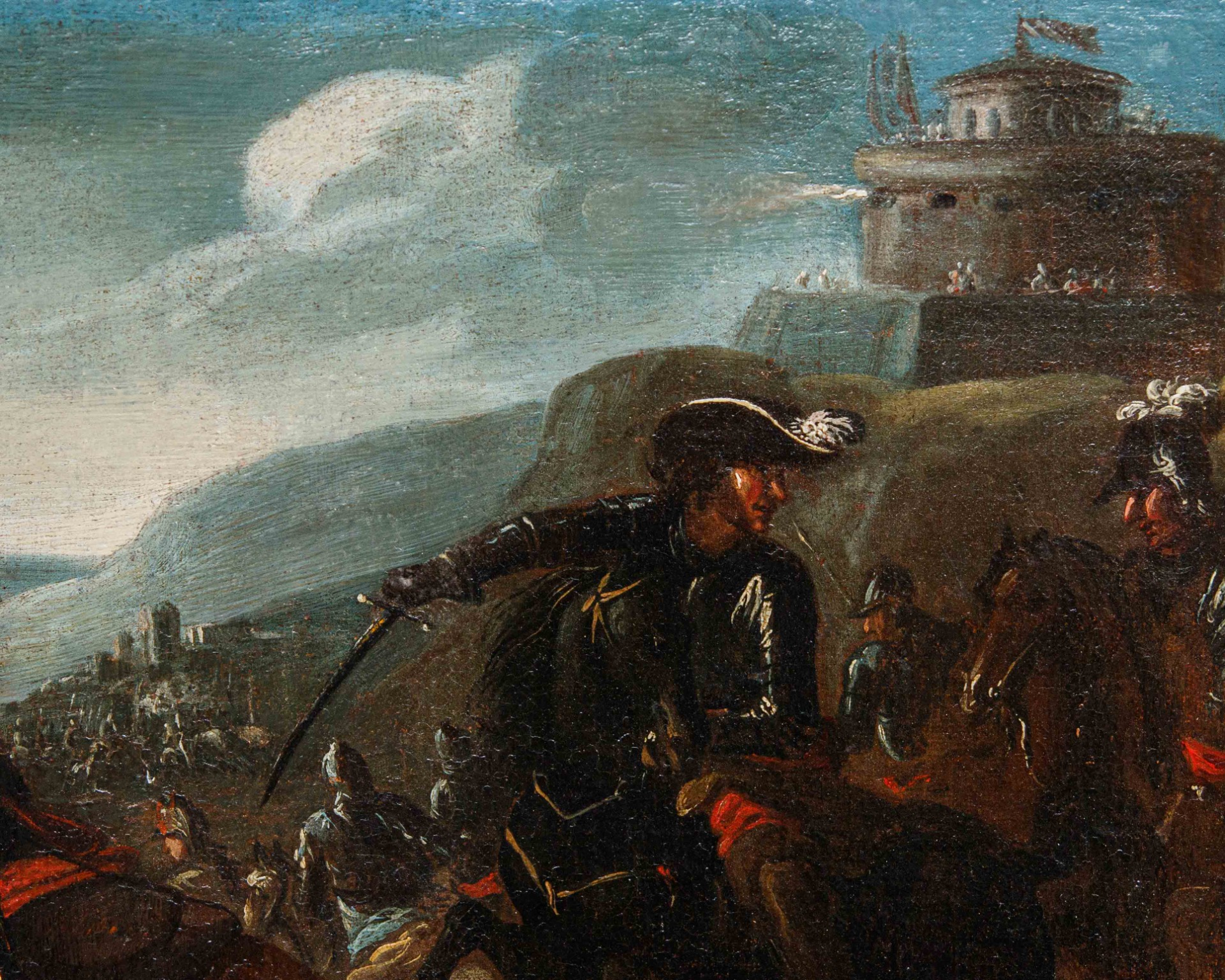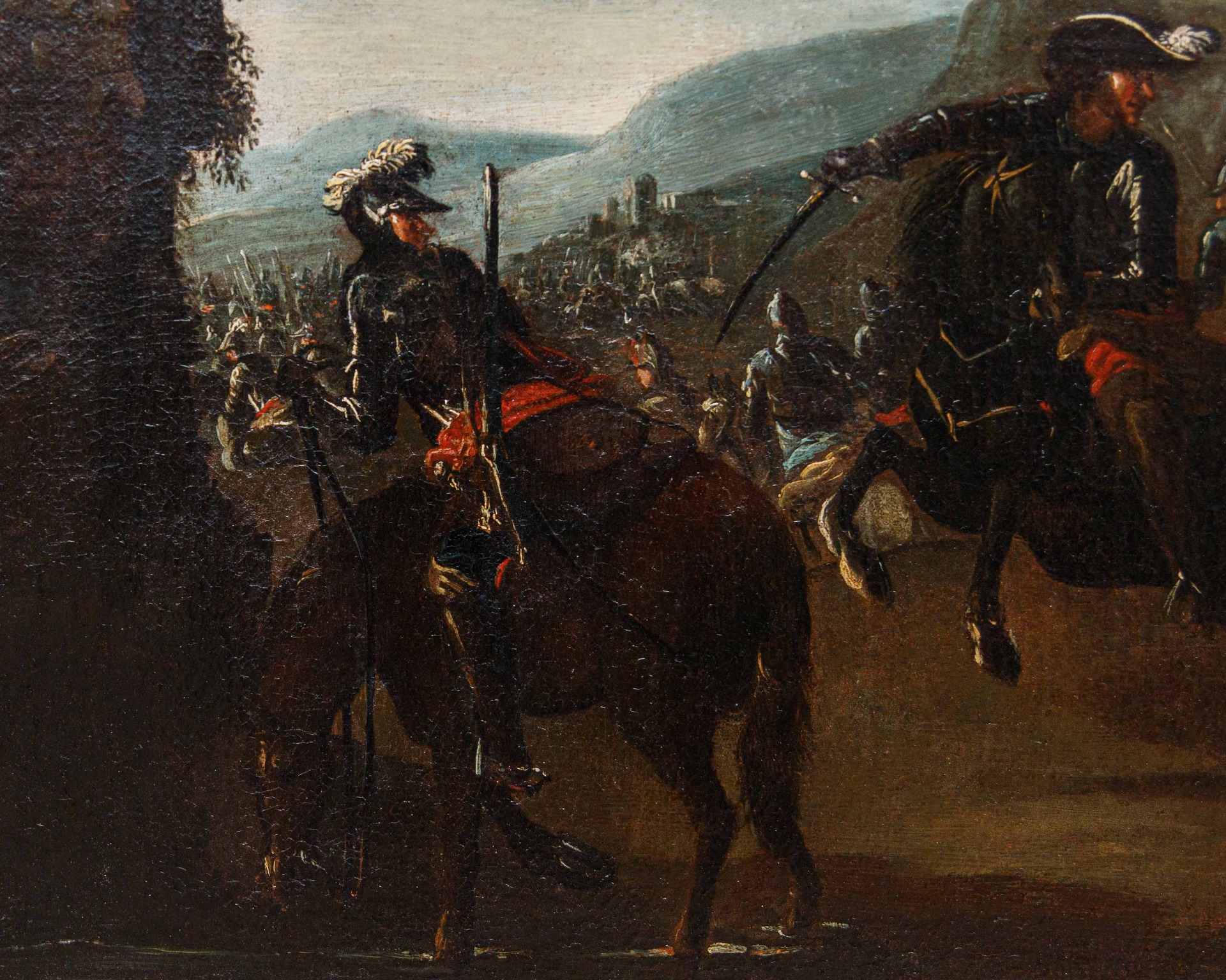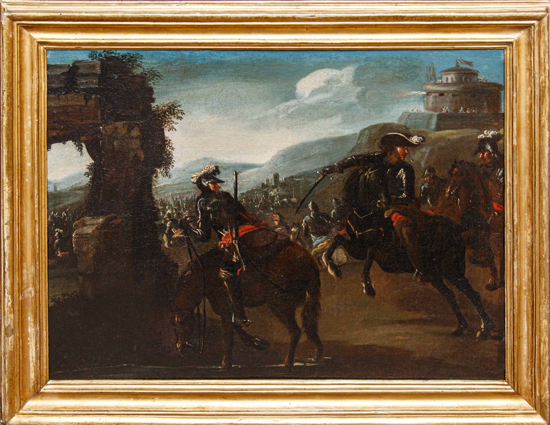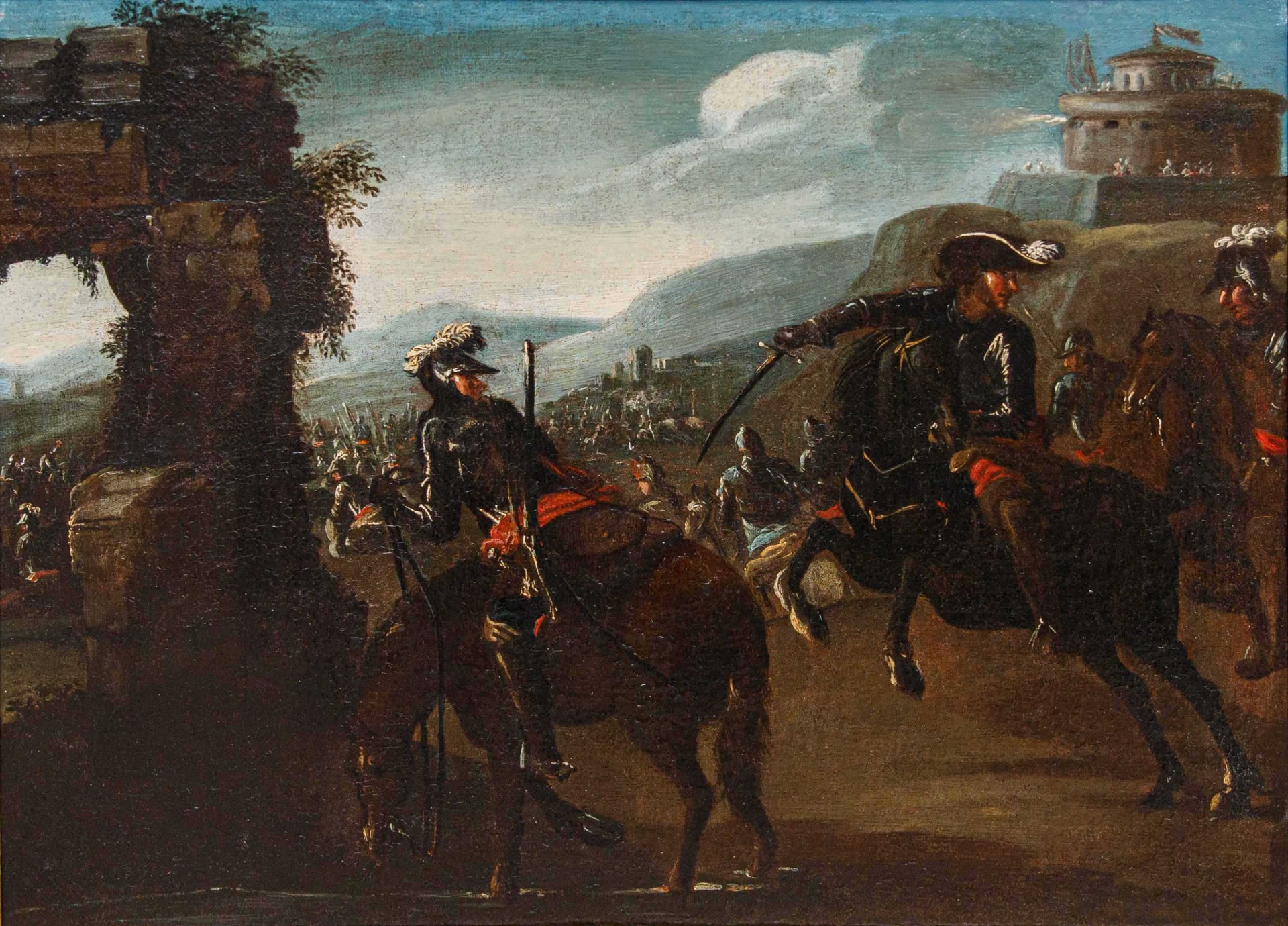 La tela appartiene alla produzione di Girolamo Cenatiempo, pittore su cui si hanno poche informazioni dal punto di vista biografico ma di cui si può ricostruire parzialmente il corpus di opere realizzate, grazie agli studi di Giancarlo Sestieri, che negli anni ha individuato diverse opere riconducibili alla sua mano ricollegandole a quelle già riconosciute in quanto firmate e datate. Le notizie sulla sua vita sono documentate a partire dal 1705, anno in cui risulta iscritto alla confraternita dei Santi Anna e Luca. I primi lavori di cui si ha menzione sono le opere realizzate per la chiesa di San Pietro a Maiella a Napoli, sia tele che affreschi, mentre nel 1709 lo si ritrova in Abruzzo, all'Aquila, dove realizza la Predica di san Bernardino con i santi Giovanni da Capestrano e Giacomo della Marca per la volta del mausoleo di San Bernardino nell'omonima basilica. Al soggiorno aquilano risalgono inoltre un San Benedetto e una Santa Scolastica, oggi nella collezione del museo nazionale d'Abruzzo, oltre che i dipinti realizzati per la cappella della Sacra Famiglia e quella di Sant'Ignazio nella chiesa di Santa Margherita. Due anni più tardi torna a Napoli, dove lavora per le chiese di Santa Maria della Sapienza e per quella del Gesù Vecchio, dove dipinse numerose tele per le varie cappelle per poi fare nuovamente ritorno all’Aquila per una commissione dell’Ordine dei Gesuiti. Proseguì la spola fra l’Aquila e Napoli negli anni successivi, lasciando costanti tracce nei luoghi di culto delle città e del territorio circostante: nel1722 a Napoli, nella chiesa di San Pietro martire, lavora con il fratello Ignazio, anch'egli pittore, ad un ciclo di Episodi della vita di sant'Antonino vescovo di Firenze per la chiesa di San Pietro martire, poi opererà per l'aquilana basilica di San Bernardino, e realizzerà la Madonna in gloria ed i Santi Massimo e Giorgio per l'abside della cattedrale dei Santi Massimo e Giorgio. Sono ancora numerose le commissioni ricevute negli anni seguenti, spesso in collaborazione con altri artisti all’interno dei cantieri ecclesiastici, sebbene molte modificate o danneggiate nel corso del tempo; va sicuramente citata la Crocifissione di Sant’Andrea proveniente dal Duomo di Fidenza e oggi nella Galleria Nazionale di Parma. La vicenda critica concernente la riscoperta di Girolamo nella veste di battaglista inizia con Federico Zeri, nella cui fototeca si conservano le immagini di due 'Battaglie antiche' (olio su tela, cm 100X178), già nella galleria antiquaria San Giorgi di Roma, dove sul retro si legge: 'Hieronimus Cenatiempo f. 1718. Allievo del Solimena'. È grazie a queste foto che il Sestieri nel 1999 diede corpo ad una prima catalogazione atta a 'individuare uno specialista passato sotto silenzio'. Gerolamo Cenatiempo, allievo del Solimena ed attivo a Napoli nella prima metà del Settecento, era noto per i suoi quadri sopra citati, mentre la produzione nel campo della battaglia passò sotto silenzio fino all’età moderna. Si vedano come termini di confronto stilistico alcuni dipinti inediti raffiguranti scene belliche ed assedi a fortificazioni, che permettono una più ampia ricostruzione della linea battaglista del suo corpus pittorico, tendente ad avvicinarsi alle opere di Ciccio Graziani del quale ripropone aggrovigliati scontri di cavalleria ampliati in un più grande formato. L’apertura spaziale sullo sfondo, la fortezza di Montalcino sul culmine della collina a destra e le rovine sono elementi che si ritrovano nelle ambientazioni delle altre scene belliche rappresentate dal Cenatiempo, il quale restituisce perfettamente la concitazione e la frenesia ella battaglia anche attraverso i movimenti sovrapposti, repentini e contorti dei soldati e delle loro cavallerie, come nel caso dei due cavalieri in primo piano. All’opacità dei toni dello sfondo fan da contrasto i colori vivaci e i riflessi di luce che compongono le figure emergenti dal fondo, rese con una tridimensionalità più evidente grazie una stesura più corposa e consistente, composta da rapidi tocchi che delineano le forme del corpo con dinamicità e volume.