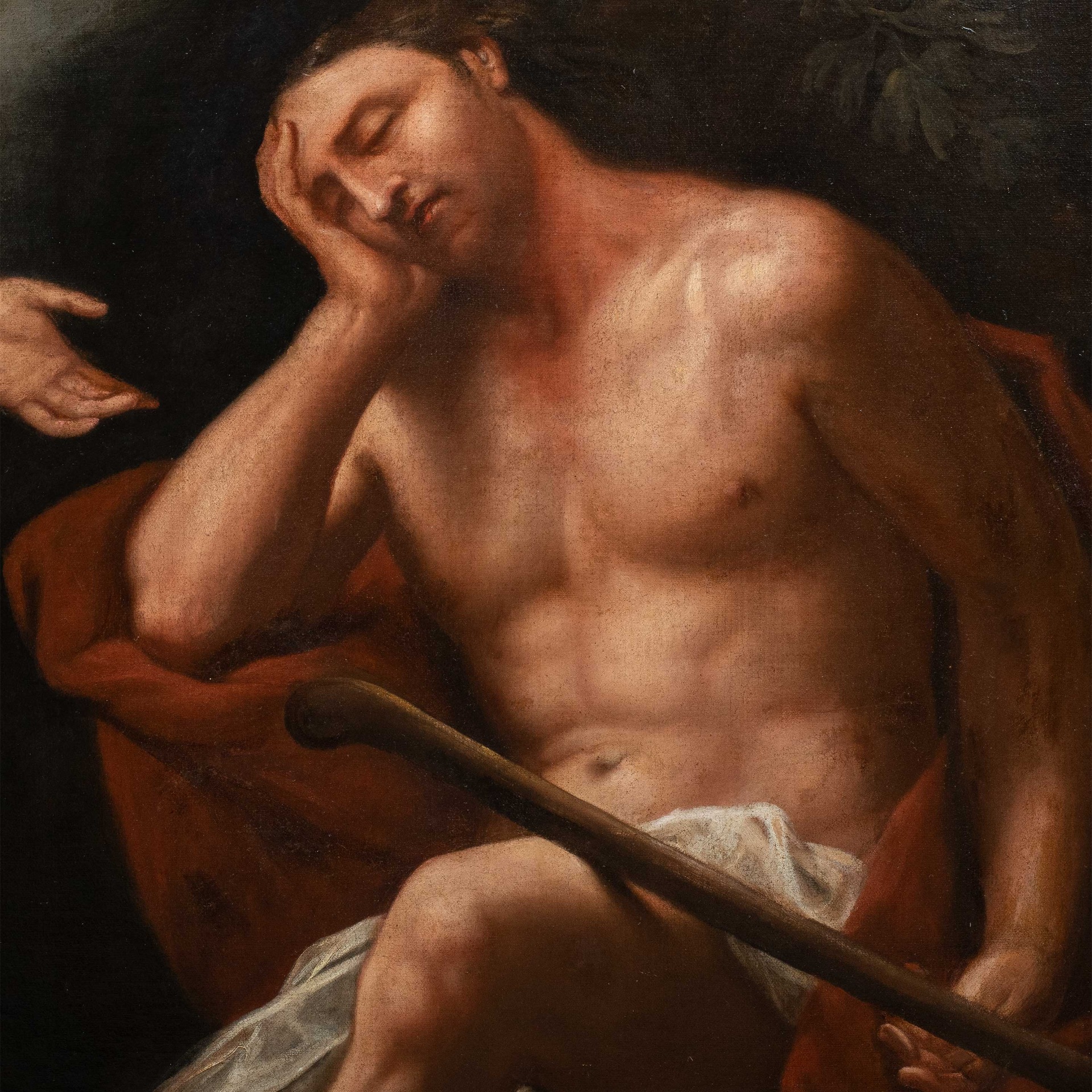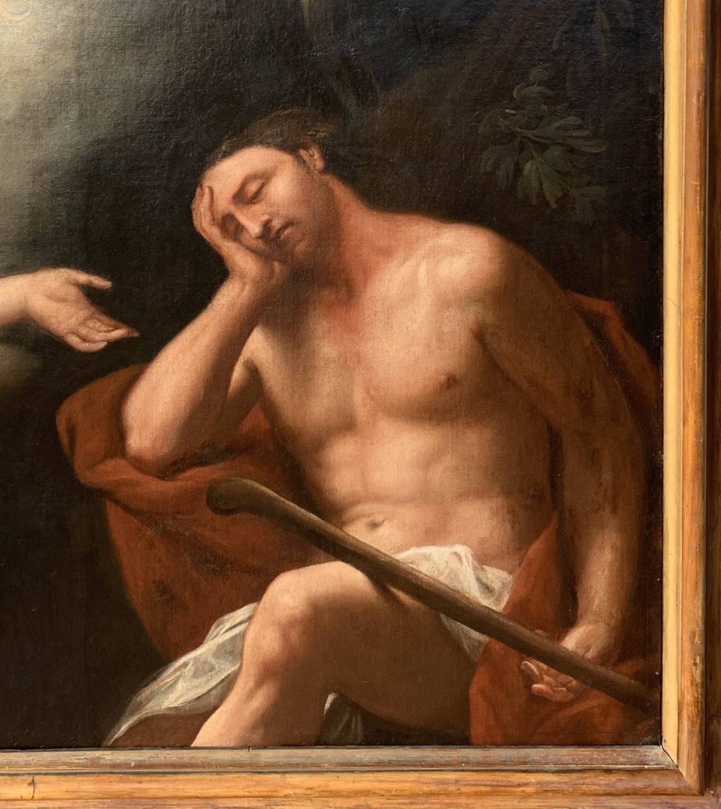 Olio su tela, in cornice in legno intagliato e laccato.