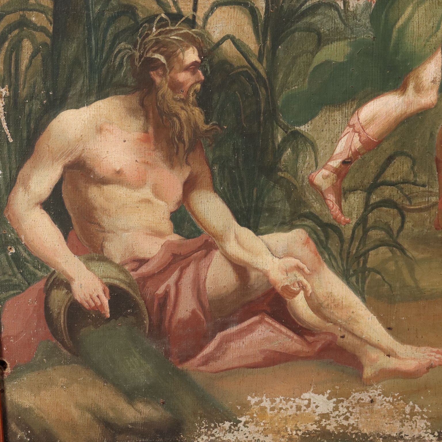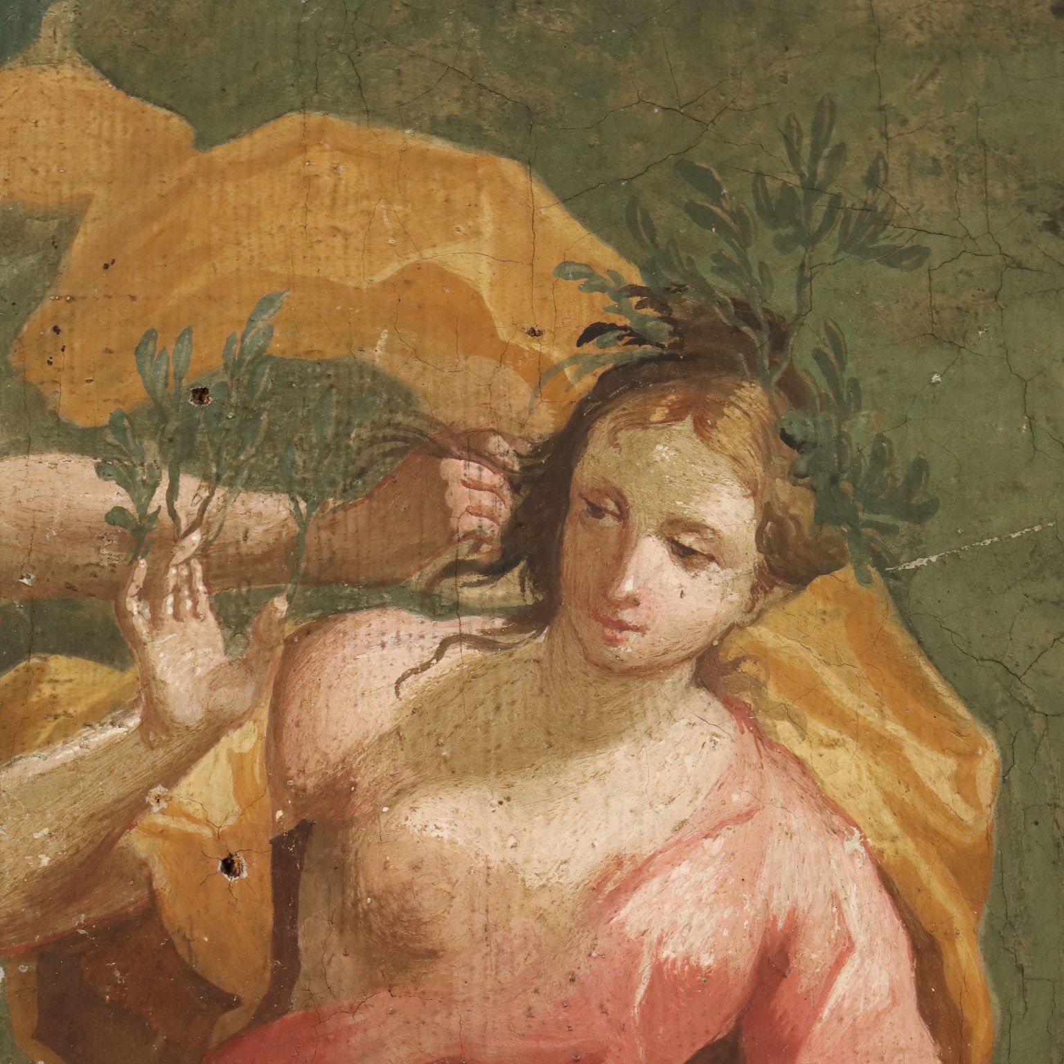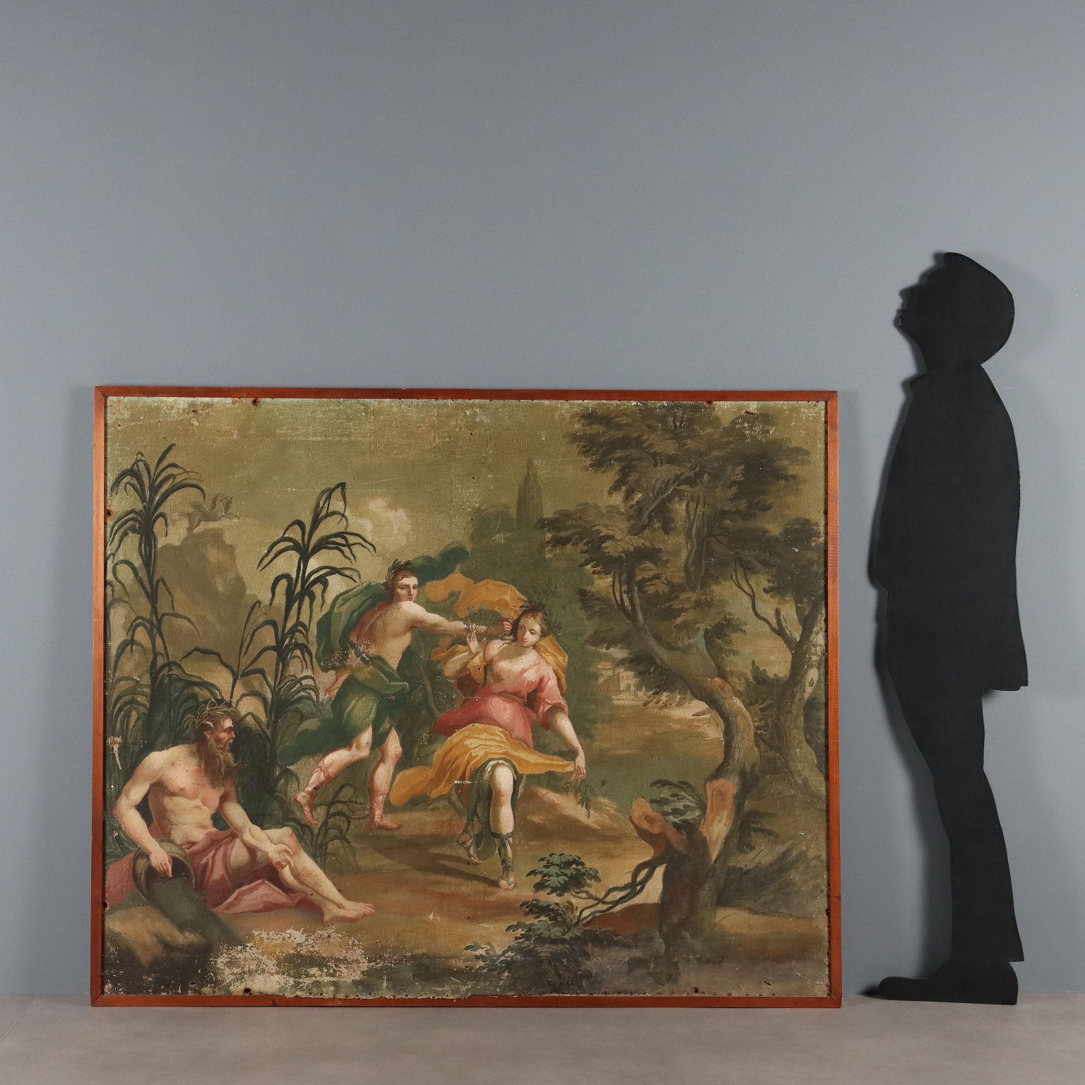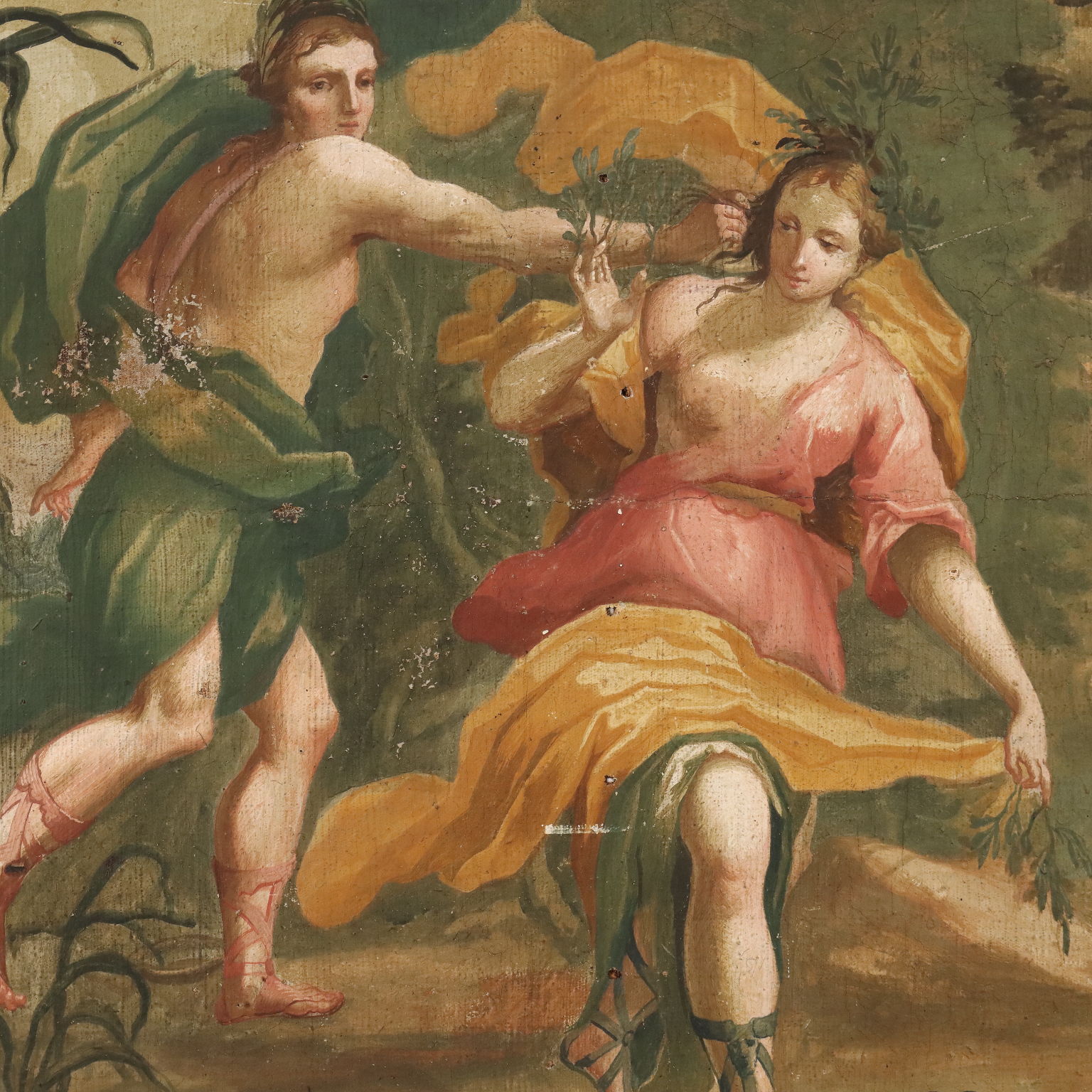 Olio su tela. Scuola toscana del XVIII secolo. La grande scena racconta la storia tragica di Apollo e Dafne, raccontata nelle Metamorfosi di Ovidio. Secondo il mito il dio Apollo, avendo schernito Cupido, viene da lui colpito con una freccia d'amore che lo fa innamorare della ninfa Dafne, colpita invece d auna freccia di piombo, capace di far finire l'amore. Apollo colpito dalla freccia si innamora perdutamente di Dafne e corre verso di lei, ma la ninfa respinge il dio e scappa. Per evitare di essere presa Dafne chiede al padre Peneo, divinità eponime del fiume Peneo, di essere trasformata per non doversi sottomettere ad Apollo. Peneo ascolta la sua richiesta e quando Apollo sta per afferrarla, Dafne si trasforma in un albero di alloro, pianta che da quel momento diventa sacra al dio. L'opera presenta in alcune parti vicinanze ai modi pittorici di Giuseppe Zocchi (1711 -1767), a cui l'autore ha probabilmente guardato in particolare nella rappresentazione degli alberi e della vegetazione. La tela presenta diverse cadute di colore, soprattutto in basso a sinistra, ed una serie di fori (di dimensioni diverse lungo i bordi e al centro) causati da precedenti chiodi messi a rinforzo. In cornice.