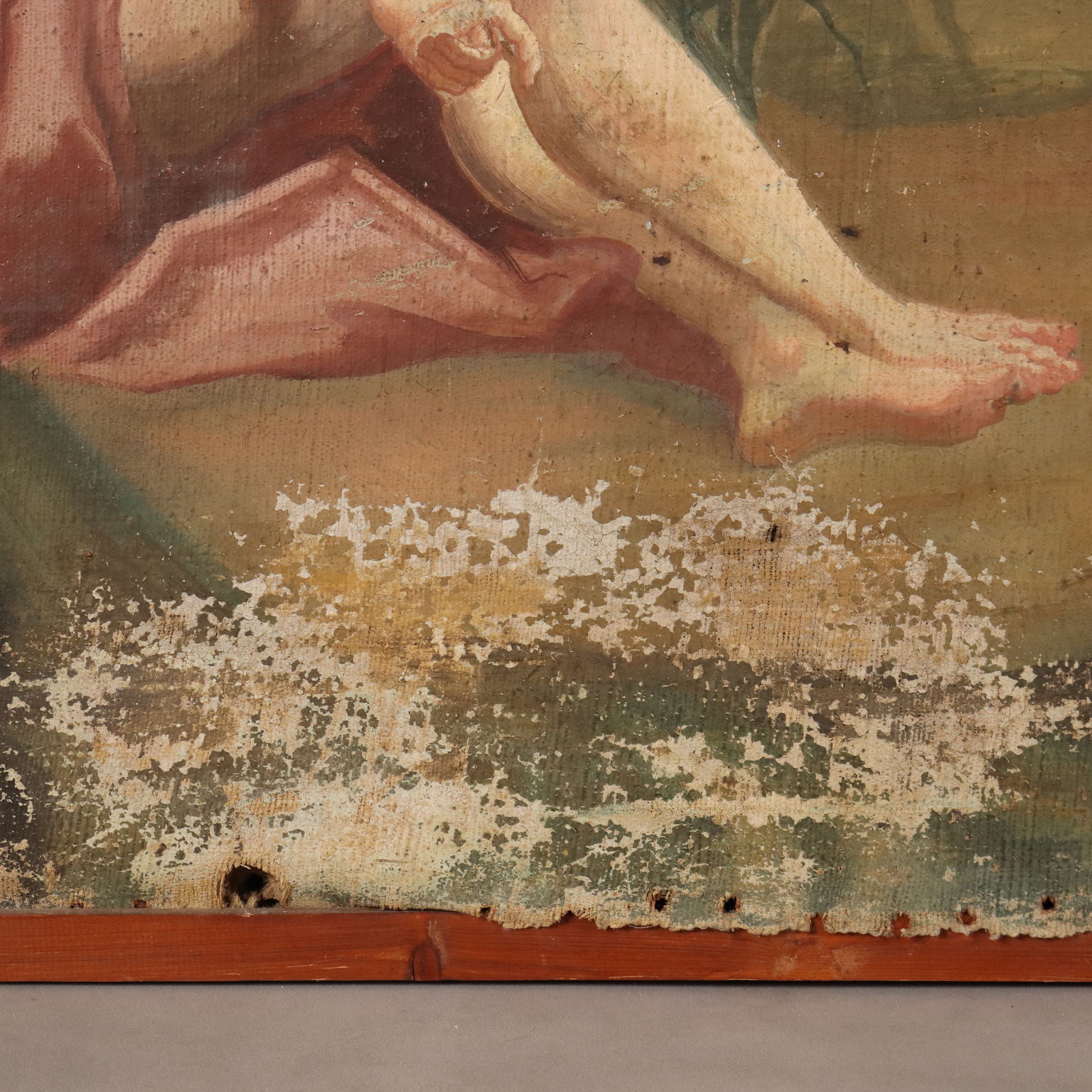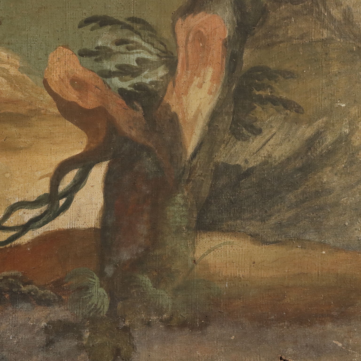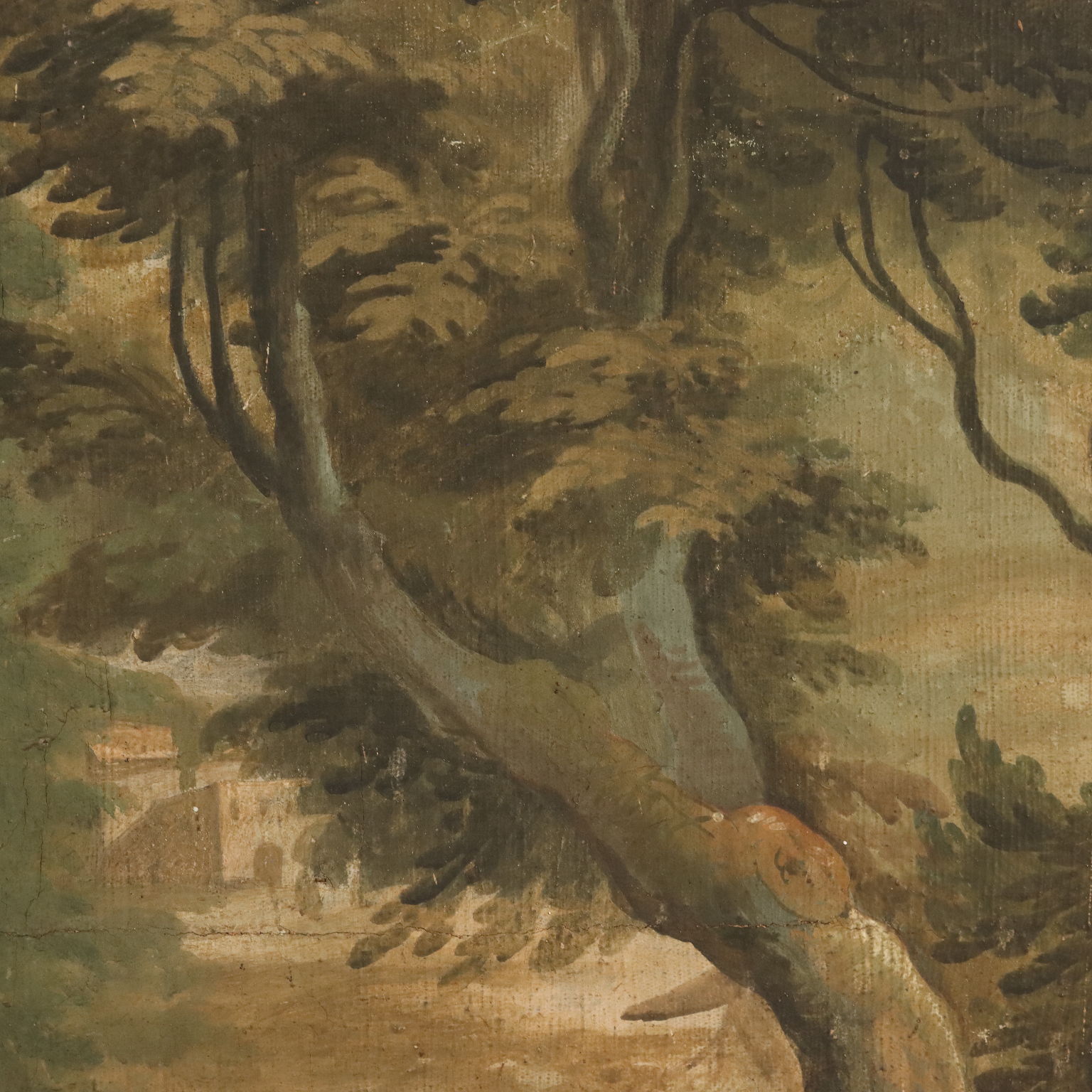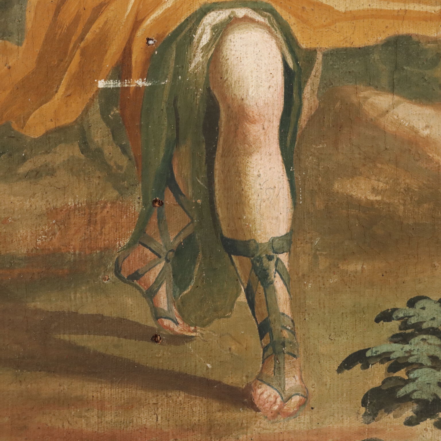 Olio su tela. Scuola toscana del XVIII secolo. La grande scena racconta la storia tragica di Apollo e Dafne, raccontata nelle Metamorfosi di Ovidio. Secondo il mito il dio Apollo, avendo schernito Cupido, viene da lui colpito con una freccia d'amore che lo fa innamorare della ninfa Dafne, colpita invece d auna freccia di piombo, capace di far finire l'amore. Apollo colpito dalla freccia si innamora perdutamente di Dafne e corre verso di lei, ma la ninfa respinge il dio e scappa. Per evitare di essere presa Dafne chiede al padre Peneo, divinità eponime del fiume Peneo, di essere trasformata per non doversi sottomettere ad Apollo. Peneo ascolta la sua richiesta e quando Apollo sta per afferrarla, Dafne si trasforma in un albero di alloro, pianta che da quel momento diventa sacra al dio. L'opera presenta in alcune parti vicinanze ai modi pittorici di Giuseppe Zocchi (1711 -1767), a cui l'autore ha probabilmente guardato in particolare nella rappresentazione degli alberi e della vegetazione. La tela presenta diverse cadute di colore, soprattutto in basso a sinistra, ed una serie di fori (di dimensioni diverse lungo i bordi e al centro) causati da precedenti chiodi messi a rinforzo. In cornice.