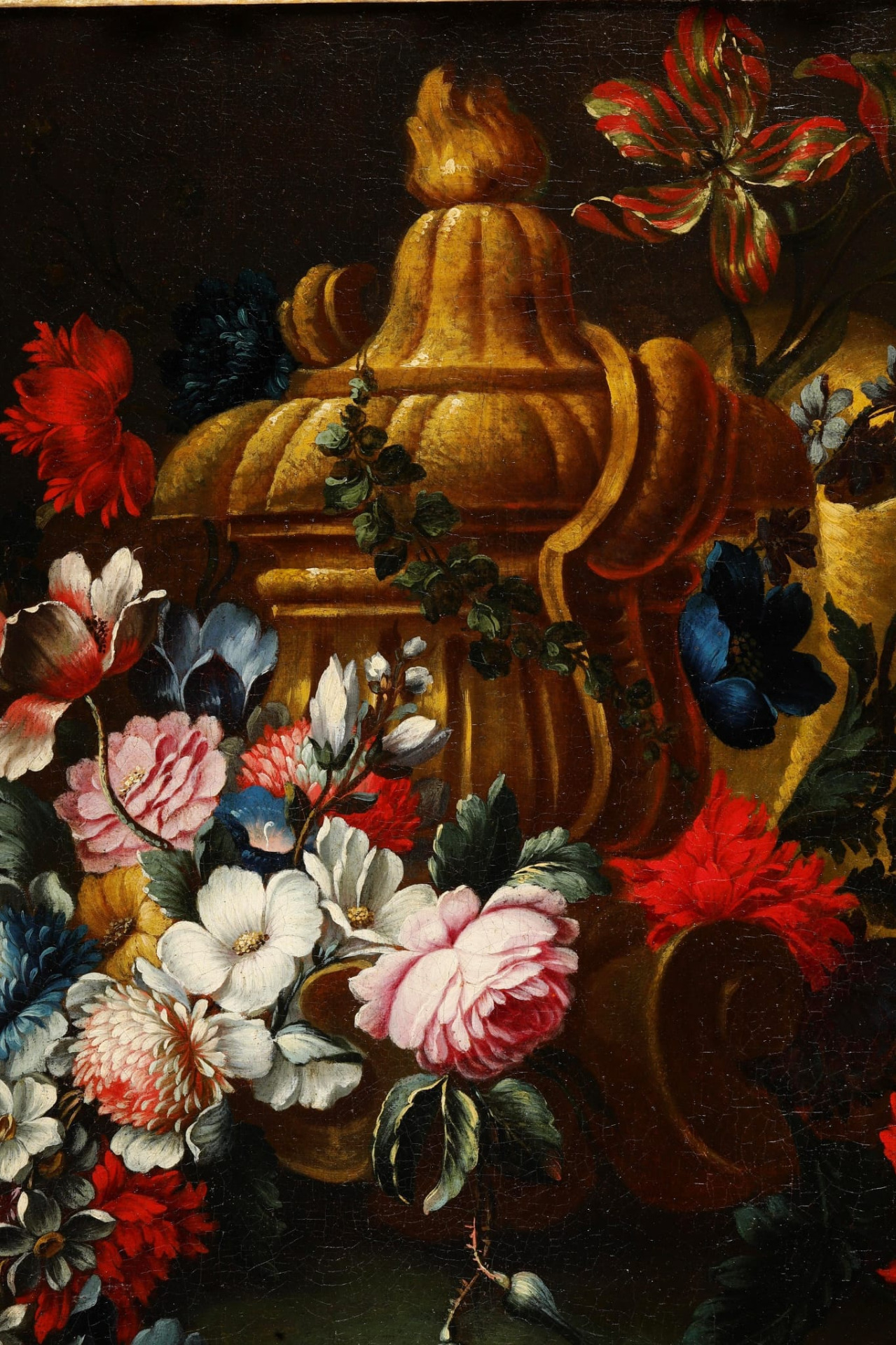 Natura morta di fiori di scuola piemontese del XVIII secolo, olio su tela, misure 98x74 cm, con cornice 112x88 cm.
