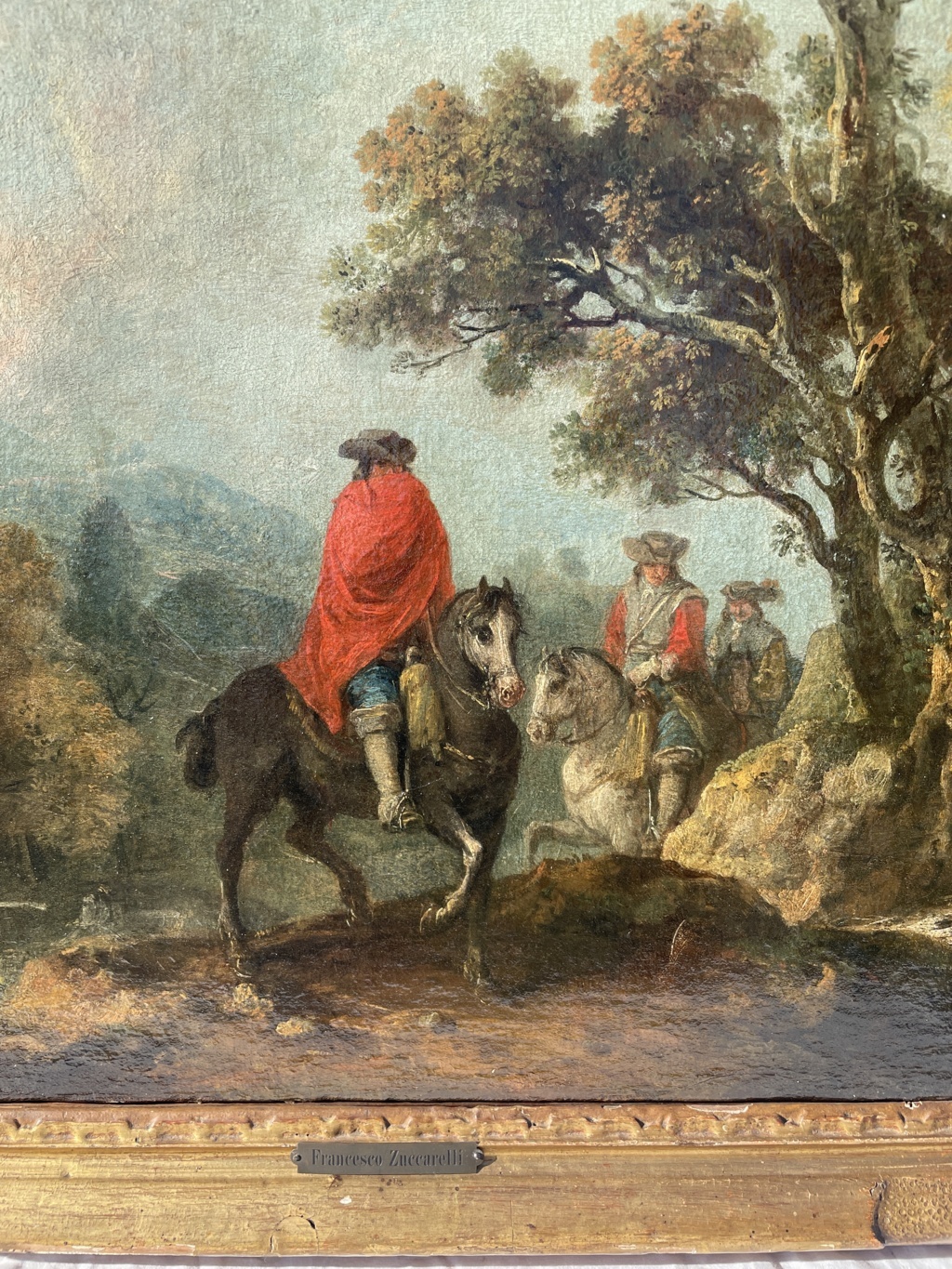 Nel nostro dipinto ritroviamo un’iconografia unica nella produzione del Maestro, che posiziona al centro del paesaggio un misterioso cavaliere coperto da un mantello rosso ed altri due personaggi a cavallo al suo seguito. Essi sono inseriti in un paesaggio collinare ideato, dove Zuccarelli posiziona alcuni dei suoi elementi tipici quali il ruscello che scorre tra le rocce, la vegetazione dalle fronde quasi evanescenti ed il paese con la chiesetta sullo sfondo.
