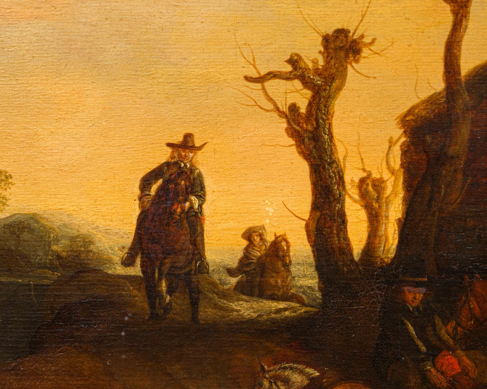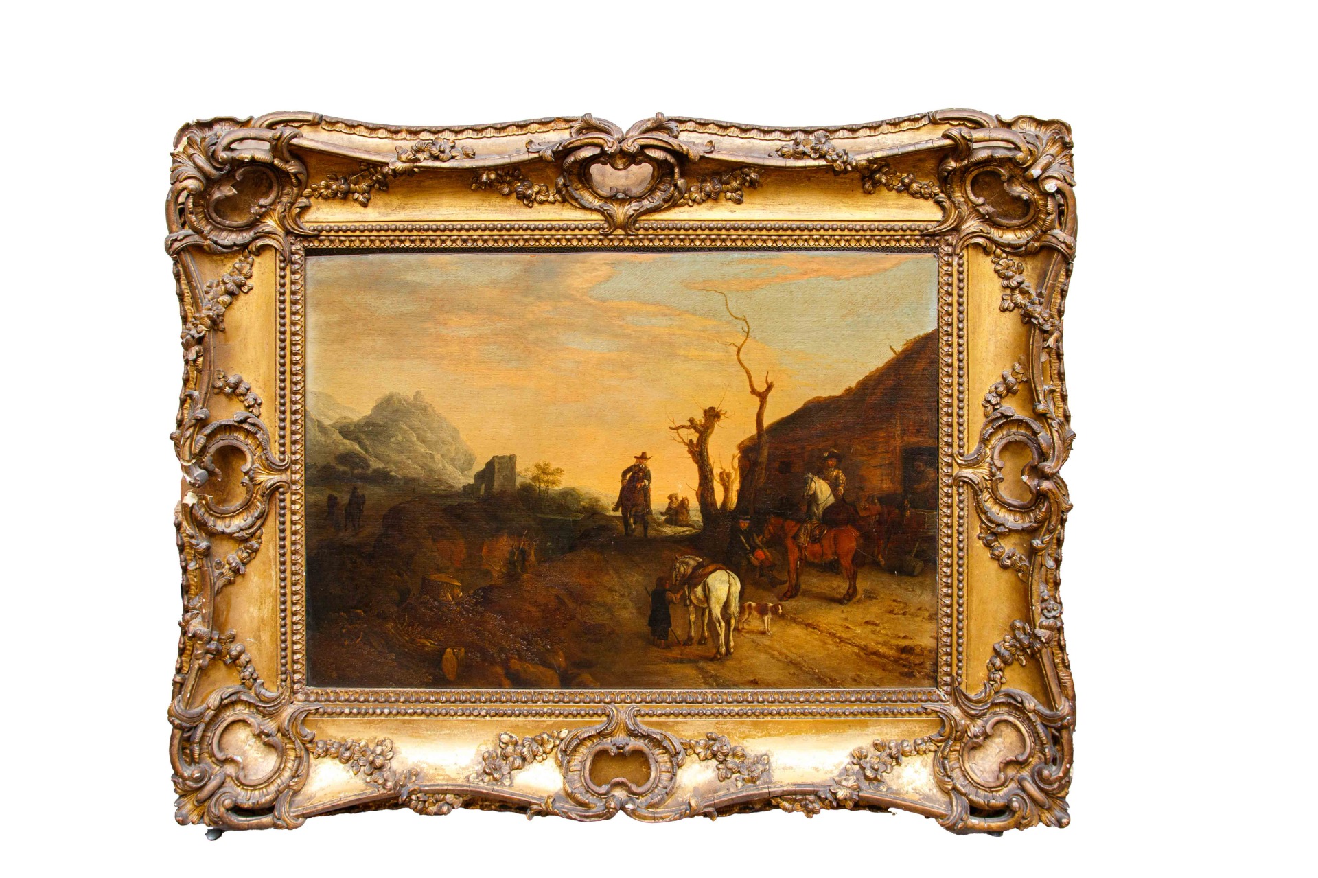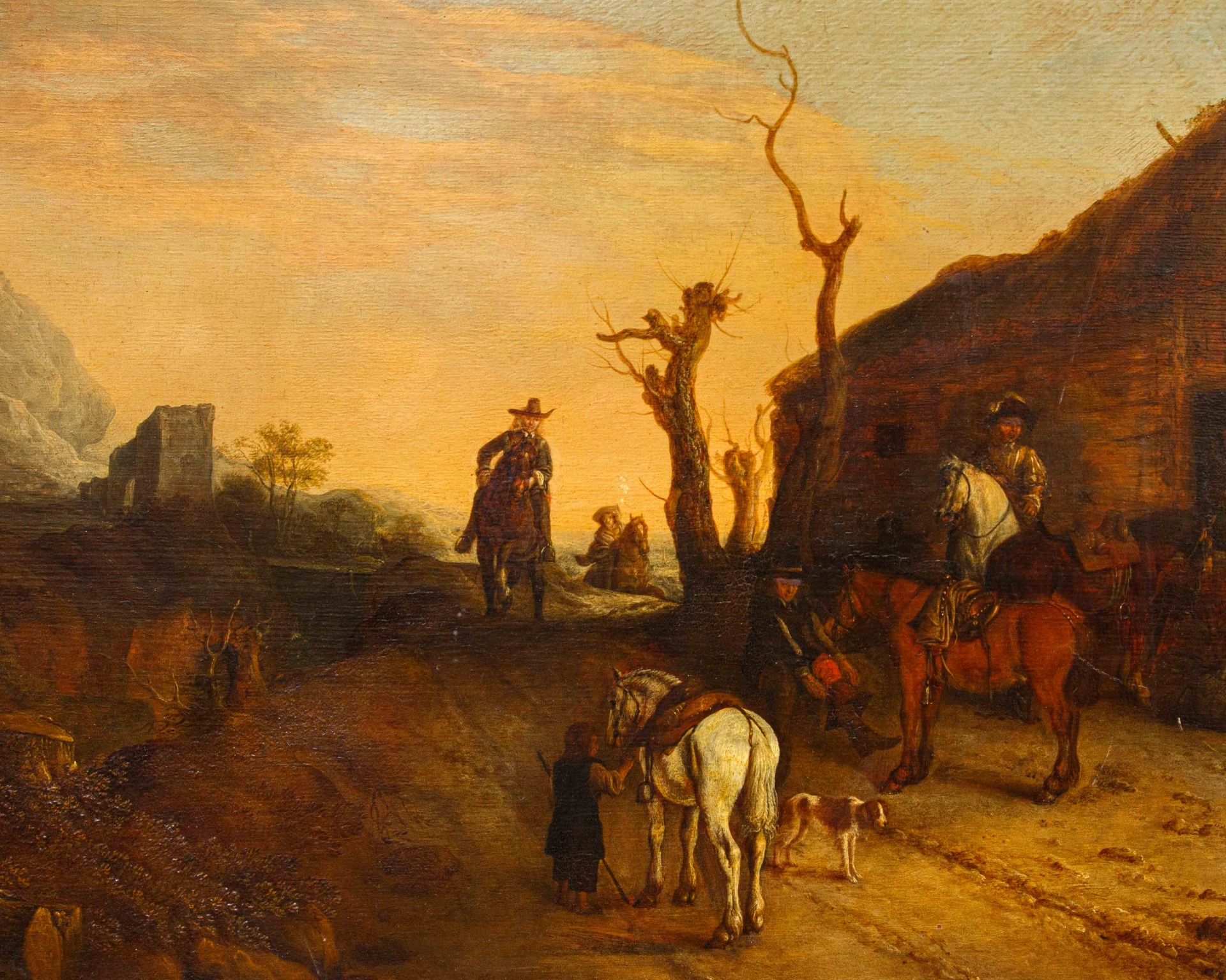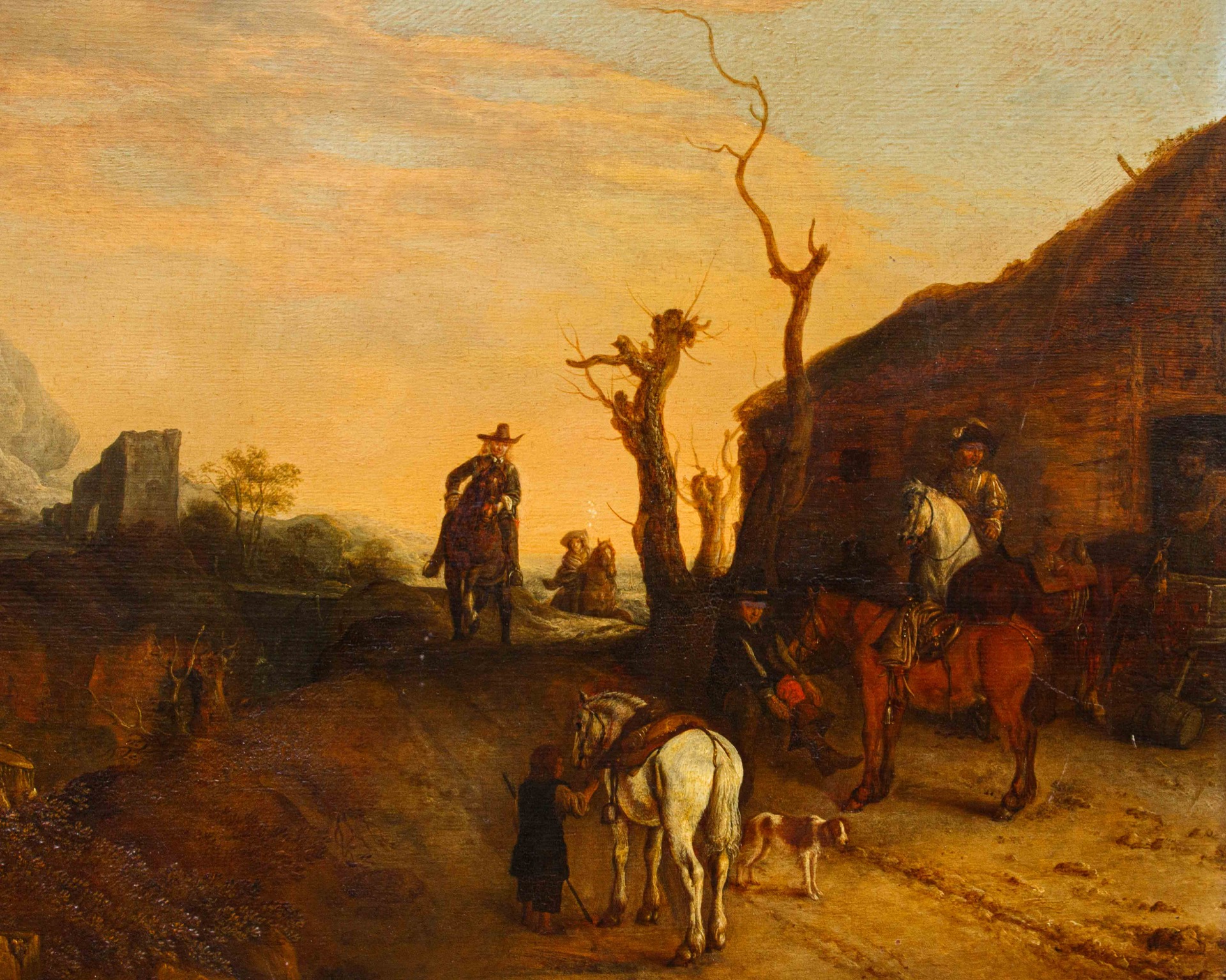 Le caratteristiche principali di questa opera sono l'ampiezza ariosa del panorama ed il senso della luminosità diffusa che ricordano appunto i migliori fiamminghi del passato ma con una leggera nota neoclassica. Il motivo paesistico anche nelle accensioni più fantasiose ha sempre nella pittura fiamminga uno spunto reale e quindi una dimensione verace ed umana; in questo dipinto possiamo notare quanto la natura che ci è intorno e nella quale noi ci perdiamo sia forte, vigorosa e quasi ostile alla figura umana. Le sagome dei viandanti, definite con pochi rapidi tratti, si perdono all’interno di un paesaggio sconfinato e a tratti respingente. Tra la fine del Seicento ed il principio del Settecento, il tema iconografico della sosta o del passaggio di cavalieri e viandanti trova grande diffusione, così come risulta essere attestato dai dipinti di Adam Pynacker, Nicholas Berchem e Johann Heinrich Roos.