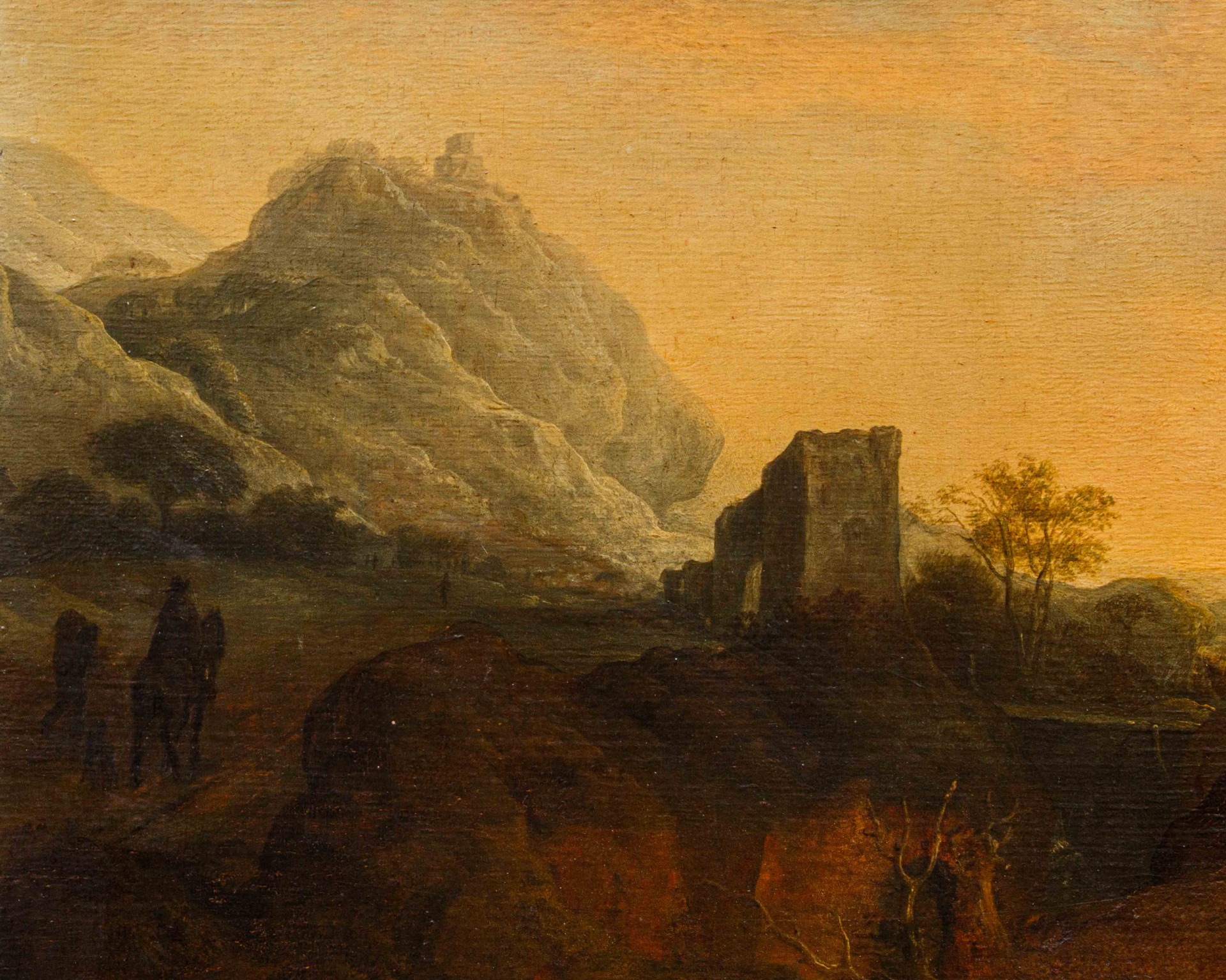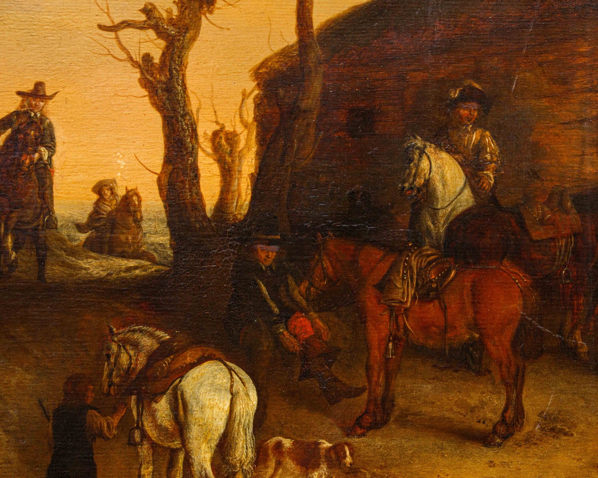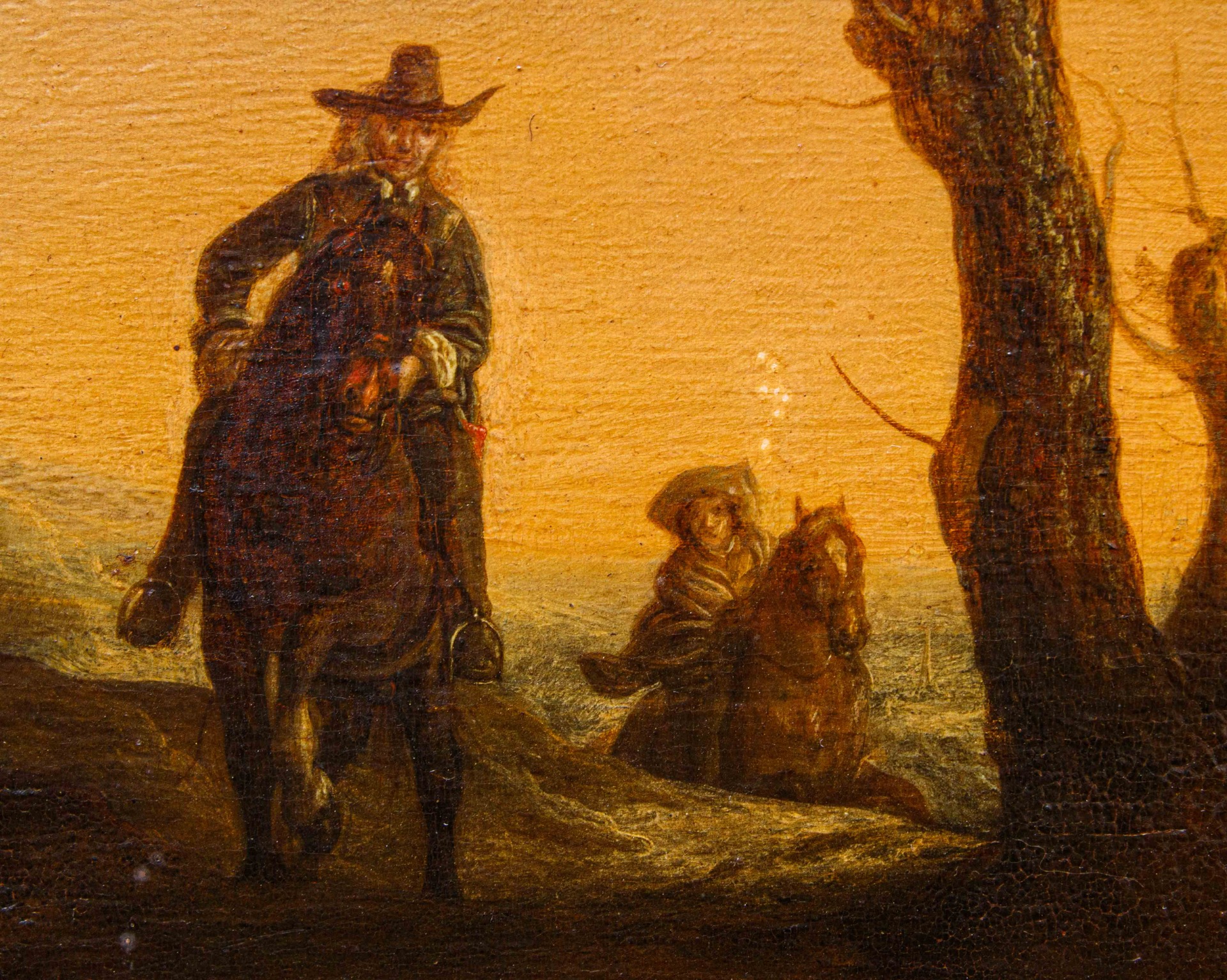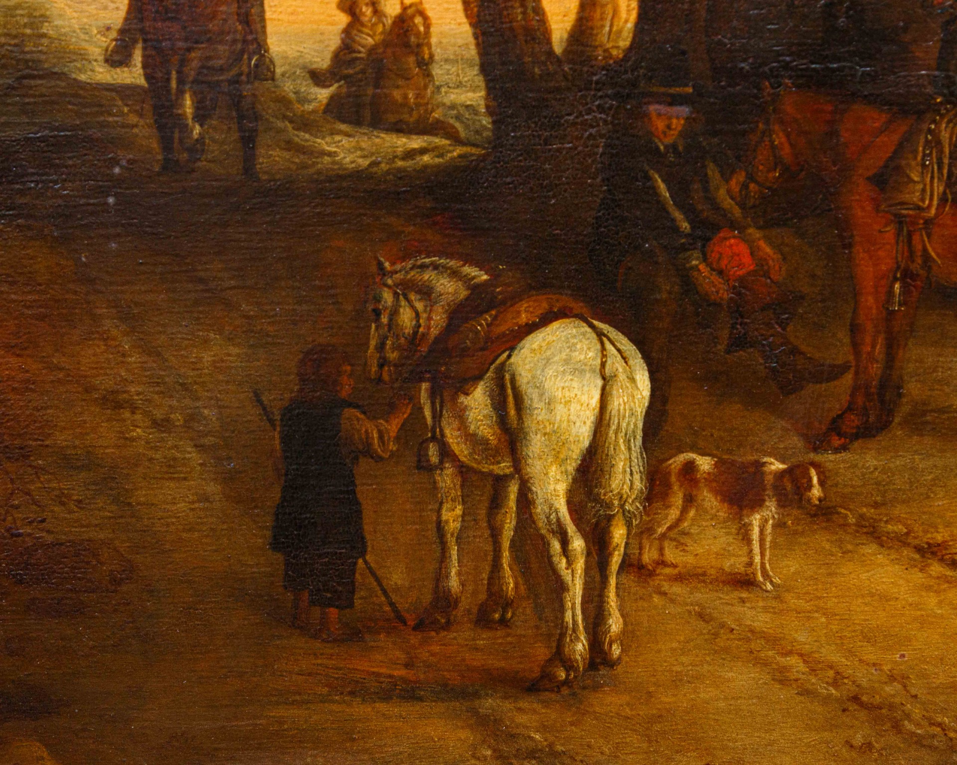 Le caratteristiche principali di questa opera sono l'ampiezza ariosa del panorama ed il senso della luminosità diffusa che ricordano appunto i migliori fiamminghi del passato ma con una leggera nota neoclassica. Il motivo paesistico anche nelle accensioni più fantasiose ha sempre nella pittura fiamminga uno spunto reale e quindi una dimensione verace ed umana; in questo dipinto possiamo notare quanto la natura che ci è intorno e nella quale noi ci perdiamo sia forte, vigorosa e quasi ostile alla figura umana. Le sagome dei viandanti, definite con pochi rapidi tratti, si perdono all’interno di un paesaggio sconfinato e a tratti respingente. Tra la fine del Seicento ed il principio del Settecento, il tema iconografico della sosta o del passaggio di cavalieri e viandanti trova grande diffusione, così come risulta essere attestato dai dipinti di Adam Pynacker, Nicholas Berchem e Johann Heinrich Roos.