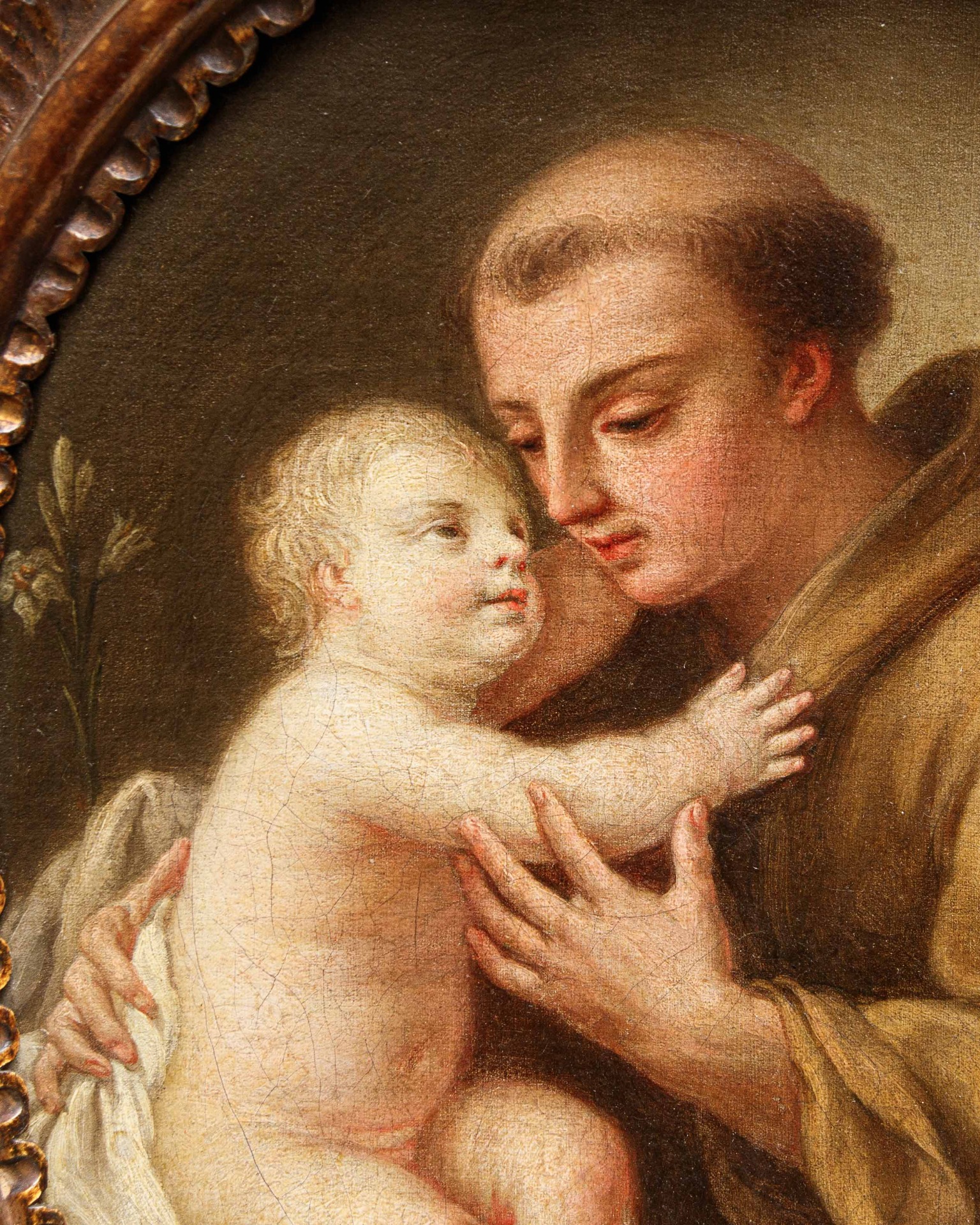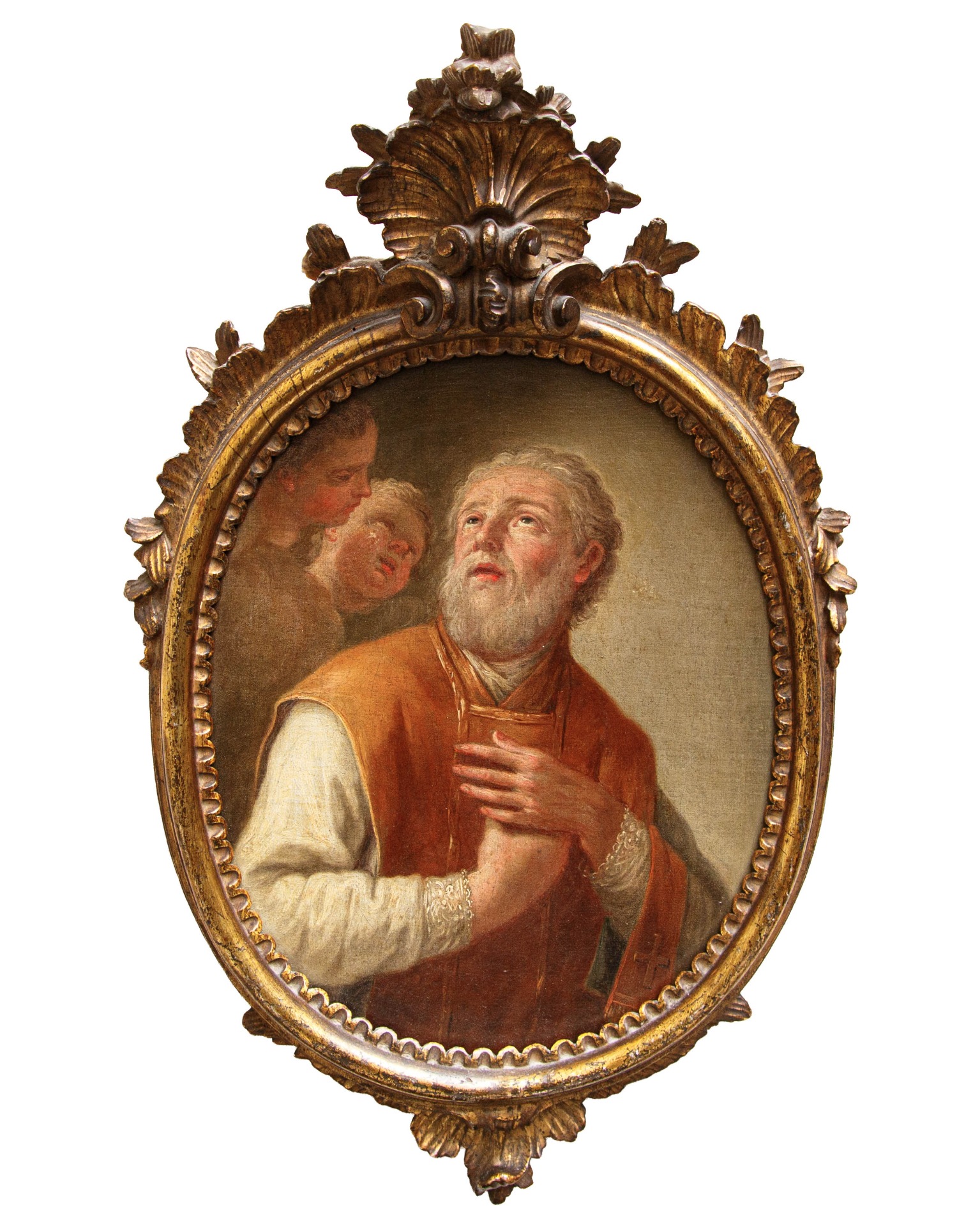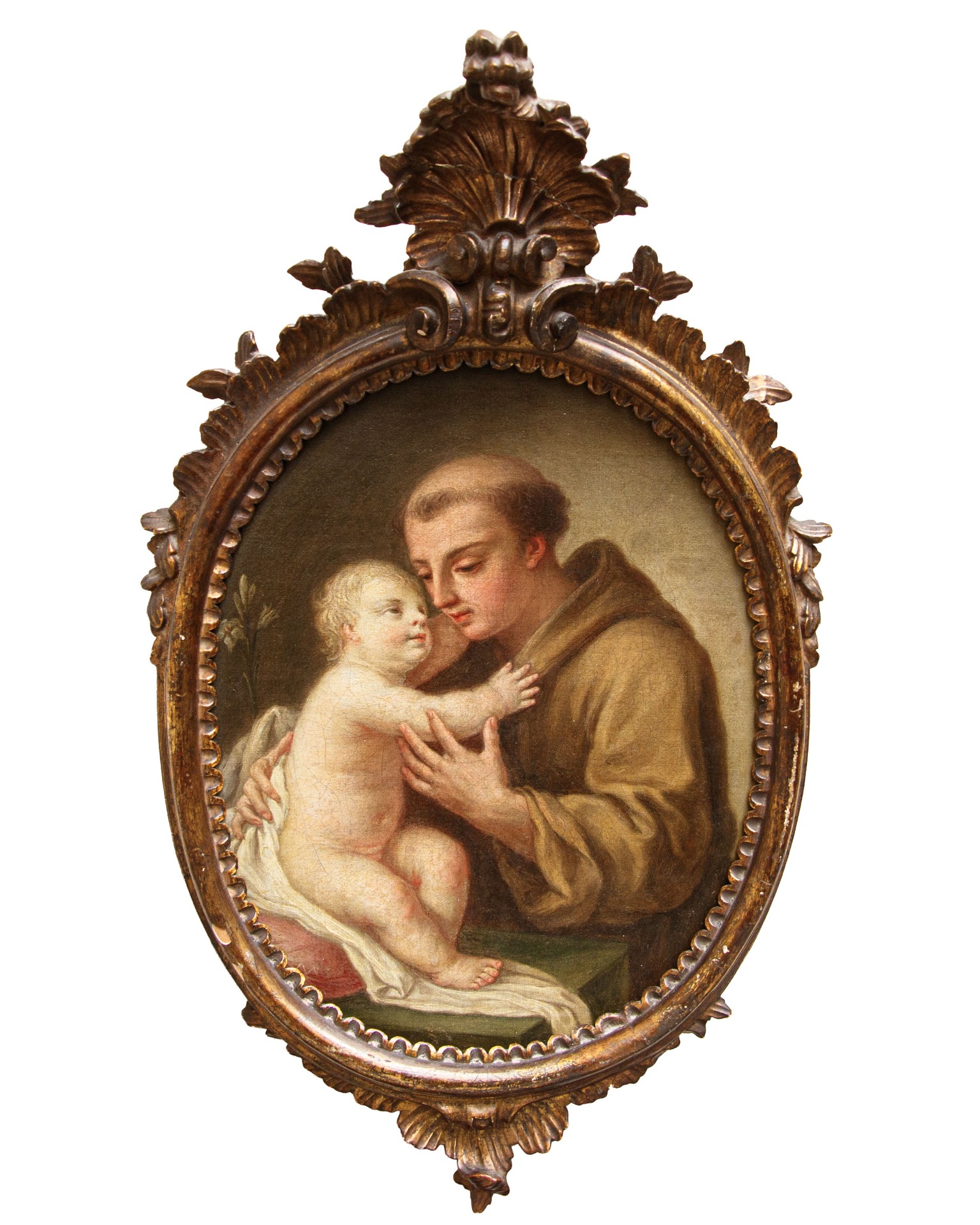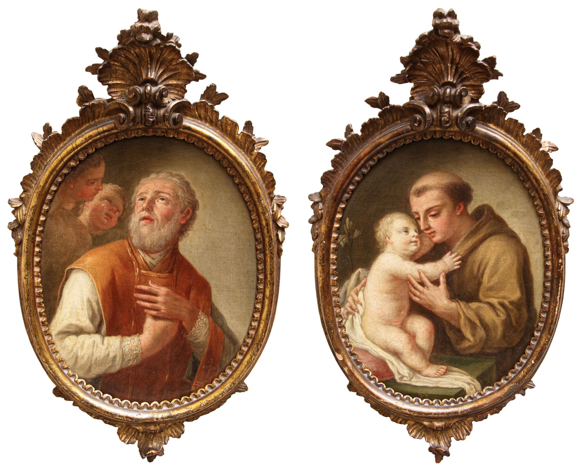 I due ovali entro cornici dorate e intagliate a motivi floreali e fitomorfi raffigurano due santi a mezza figura su uno sfondo neutro dalle tonalità grige ma rischiarate da una luce calda, inerente al divino e alla santità. Il primo è San Filippo Neri, il quale non viene rappresentato con tutti i suoi attributi, come il libro o il giglio, ma la cui identità si può riconoscere grazie alla pianeta dorata, paramento con cui viene solitamente raffigurato sebbene il colore tipico sia il rosso. Questo abito sacro poteva essere realizzato con diverse fogge e materiale ma quello solitamente utilizzato dal santo fu così apprezzato da divenire un modello a sé stante; questo si legò dunque anche all’immagine sacra di Filippo Neri, la cui identità può essere ricostruita in questo caso anche grazie allo sguardo estatico rivolto verso l’alto, da cui giungono le teste di due puttini che lasciano intendere parzialmente la visione della Madonna con il Bambino, figure che venivano accompagnate e sostenute da angeli e putti entro nubi e raggi luminosi nelle raffigurazioni artistiche, come quella, appunto, della Visione di San Filippo Neri di Guido Reni. Per quanto riguarda l’altro ovale, esso rappresenta Sant’Antonio da Padova, raffigurato come un frate giovane con il saio e il Bambino Gesù in braccio, rappresentazione legata alla sua visione della Madonna e di Gesù bambino poco prima della morte. Appartenente all’Ordine francescano e di origine lusitana, egli incontrò personalmente San Francesco e si impegnò nella diffusione della vera dottrina viaggiando lungamente ma lasciando a Padova le tracce più rilevanti della sua attività evangelica e teologica. Il legame fra queste due figure, oltre alla santità, sta forse nel fatto che entrambi sono ripresi nel momento in cui stanno avendo un contatto diretto con il divino attraverso la visione della Madonna o del Bambino. Per quanto riguarda il periodo di esecuzione di questi due ex voto, riservati dunque alla devozione privata, la forma ovale della tela e la delicata resa pittorica, luminosa e leggera, suggeriscono una collocazione nel XVIII secolo. Dal punto di vista geografico si può invece trovare riscontro nella produzione napoletana dei primi decenni del Settecento, in cui ancora influiscono gli esempi di Luca Giordano, considerando la coesistenza di diverse istanze provenienti da molteplici scuole e artisti con cui Giordano e più in generale il movimento artistico napoletano entrarono in contatto nel corso del Seicento. In questo caso notiamo in maggior misura un certo classicismo, piano e misurato, mutuato dagli esempi classicisti di Guido Reni, Poussin e Maratta.