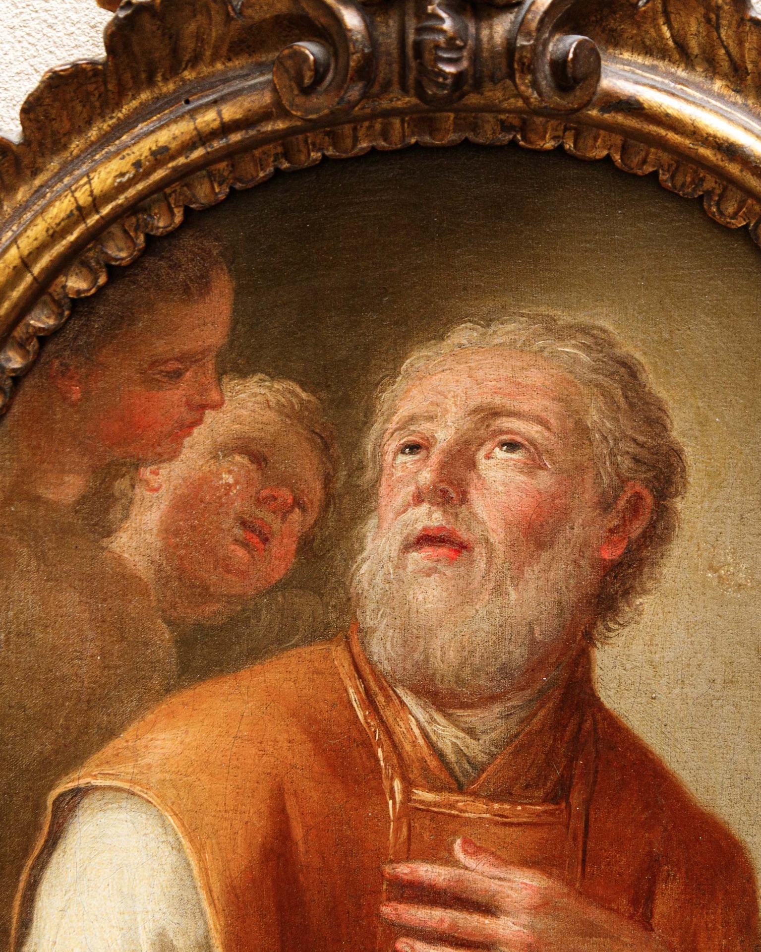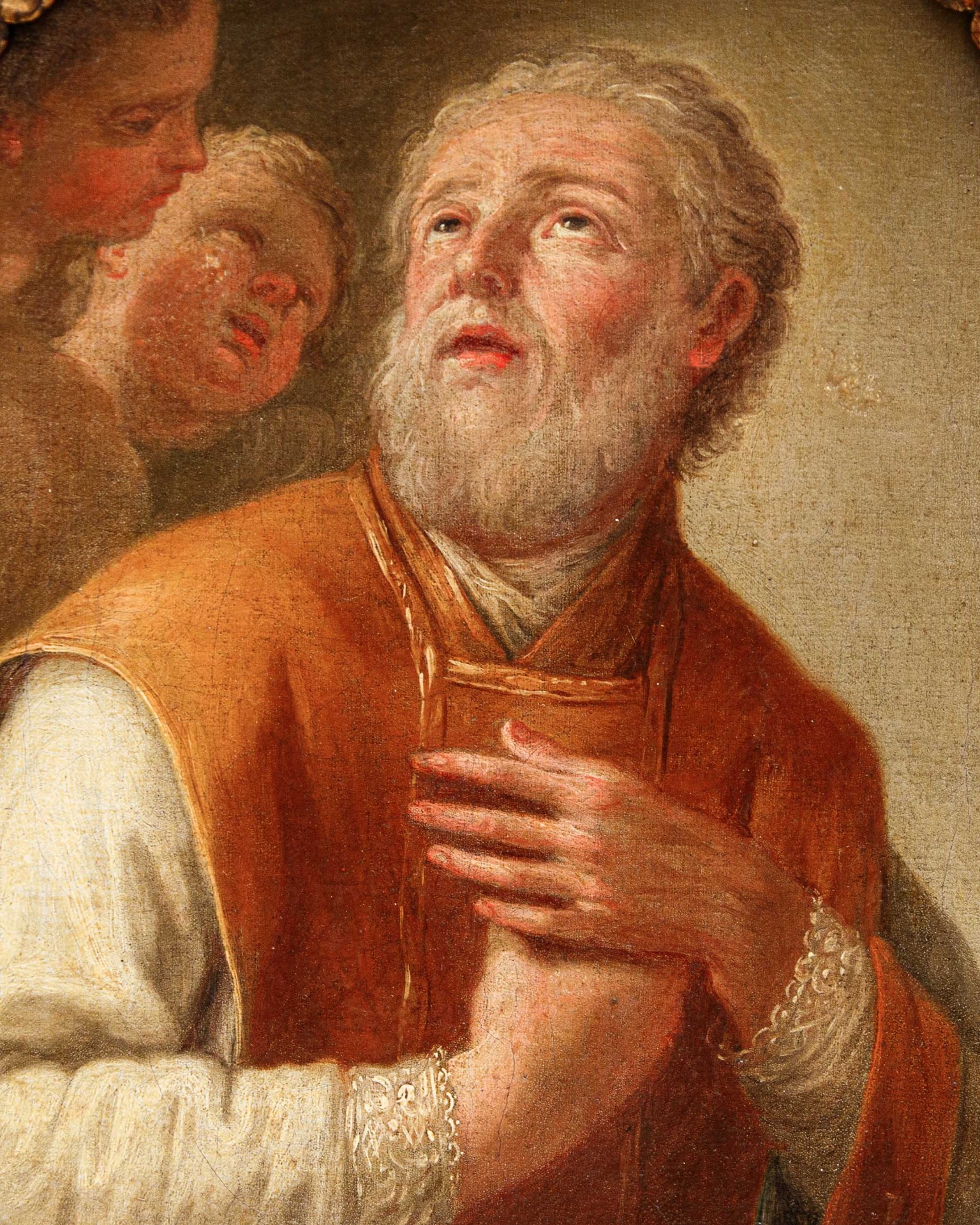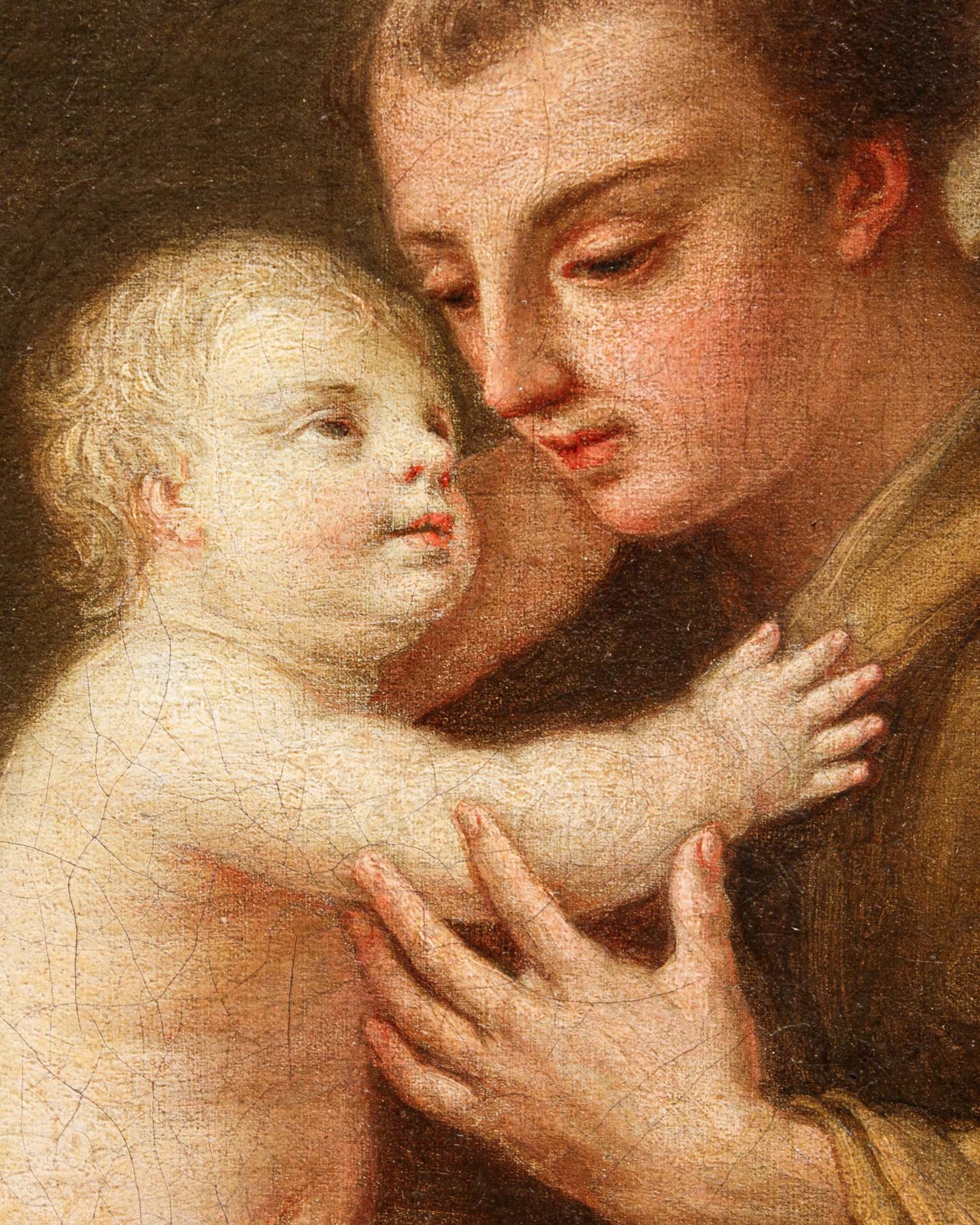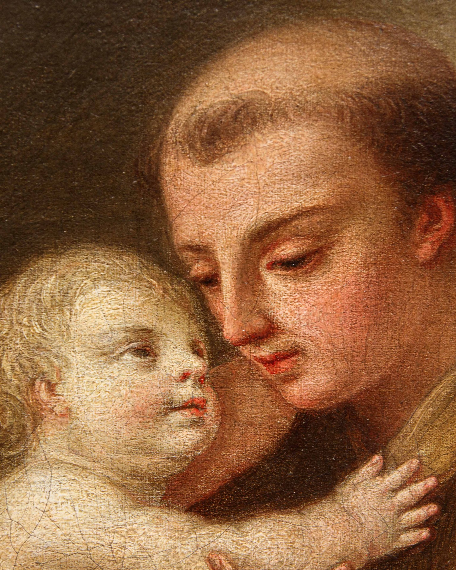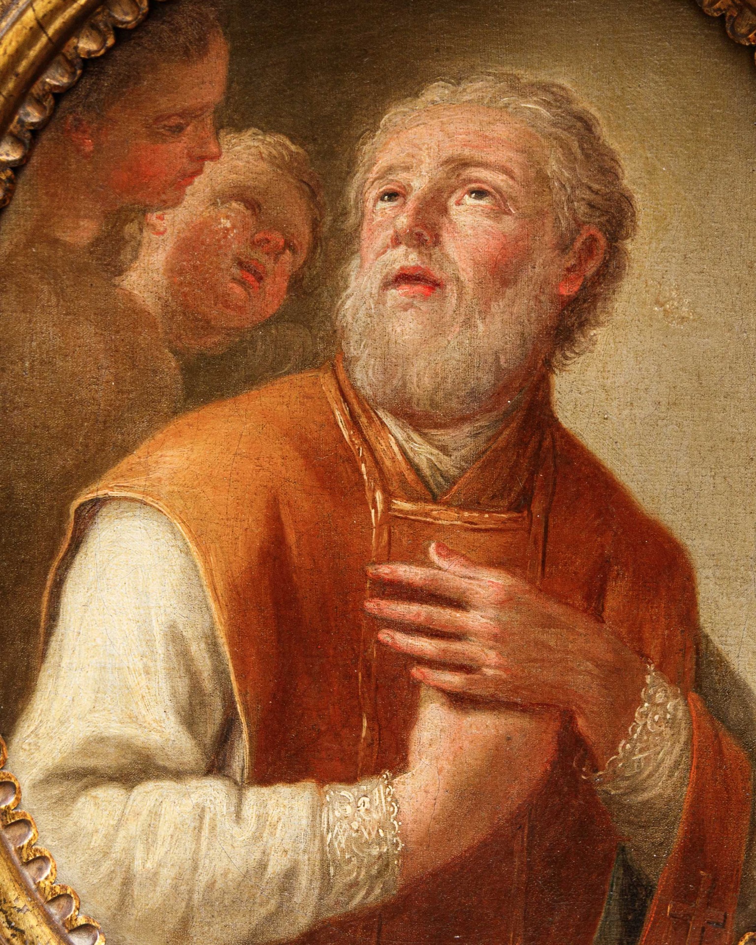 I due ovali entro cornici dorate e intagliate a motivi floreali e fitomorfi raffigurano due santi a mezza figura su uno sfondo neutro dalle tonalità grige ma rischiarate da una luce calda, inerente al divino e alla santità. Il primo è San Filippo Neri, il quale non viene rappresentato con tutti i suoi attributi, come il libro o il giglio, ma la cui identità si può riconoscere grazie alla pianeta dorata, paramento con cui viene solitamente raffigurato sebbene il colore tipico sia il rosso. Questo abito sacro poteva essere realizzato con diverse fogge e materiale ma quello solitamente utilizzato dal santo fu così apprezzato da divenire un modello a sé stante; questo si legò dunque anche all’immagine sacra di Filippo Neri, la cui identità può essere ricostruita in questo caso anche grazie allo sguardo estatico rivolto verso l’alto, da cui giungono le teste di due puttini che lasciano intendere parzialmente la visione della Madonna con il Bambino, figure che venivano accompagnate e sostenute da angeli e putti entro nubi e raggi luminosi nelle raffigurazioni artistiche, come quella, appunto, della Visione di San Filippo Neri di Guido Reni. Per quanto riguarda l’altro ovale, esso rappresenta Sant’Antonio da Padova, raffigurato come un frate giovane con il saio e il Bambino Gesù in braccio, rappresentazione legata alla sua visione della Madonna e di Gesù bambino poco prima della morte. Appartenente all’Ordine francescano e di origine lusitana, egli incontrò personalmente San Francesco e si impegnò nella diffusione della vera dottrina viaggiando lungamente ma lasciando a Padova le tracce più rilevanti della sua attività evangelica e teologica. Il legame fra queste due figure, oltre alla santità, sta forse nel fatto che entrambi sono ripresi nel momento in cui stanno avendo un contatto diretto con il divino attraverso la visione della Madonna o del Bambino. Per quanto riguarda il periodo di esecuzione di questi due ex voto, riservati dunque alla devozione privata, la forma ovale della tela e la delicata resa pittorica, luminosa e leggera, suggeriscono una collocazione nel XVIII secolo. Dal punto di vista geografico si può invece trovare riscontro nella produzione napoletana dei primi decenni del Settecento, in cui ancora influiscono gli esempi di Luca Giordano, considerando la coesistenza di diverse istanze provenienti da molteplici scuole e artisti con cui Giordano e più in generale il movimento artistico napoletano entrarono in contatto nel corso del Seicento. In questo caso notiamo in maggior misura un certo classicismo, piano e misurato, mutuato dagli esempi classicisti di Guido Reni, Poussin e Maratta.