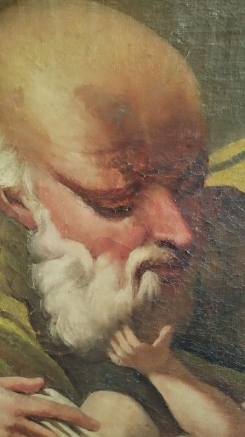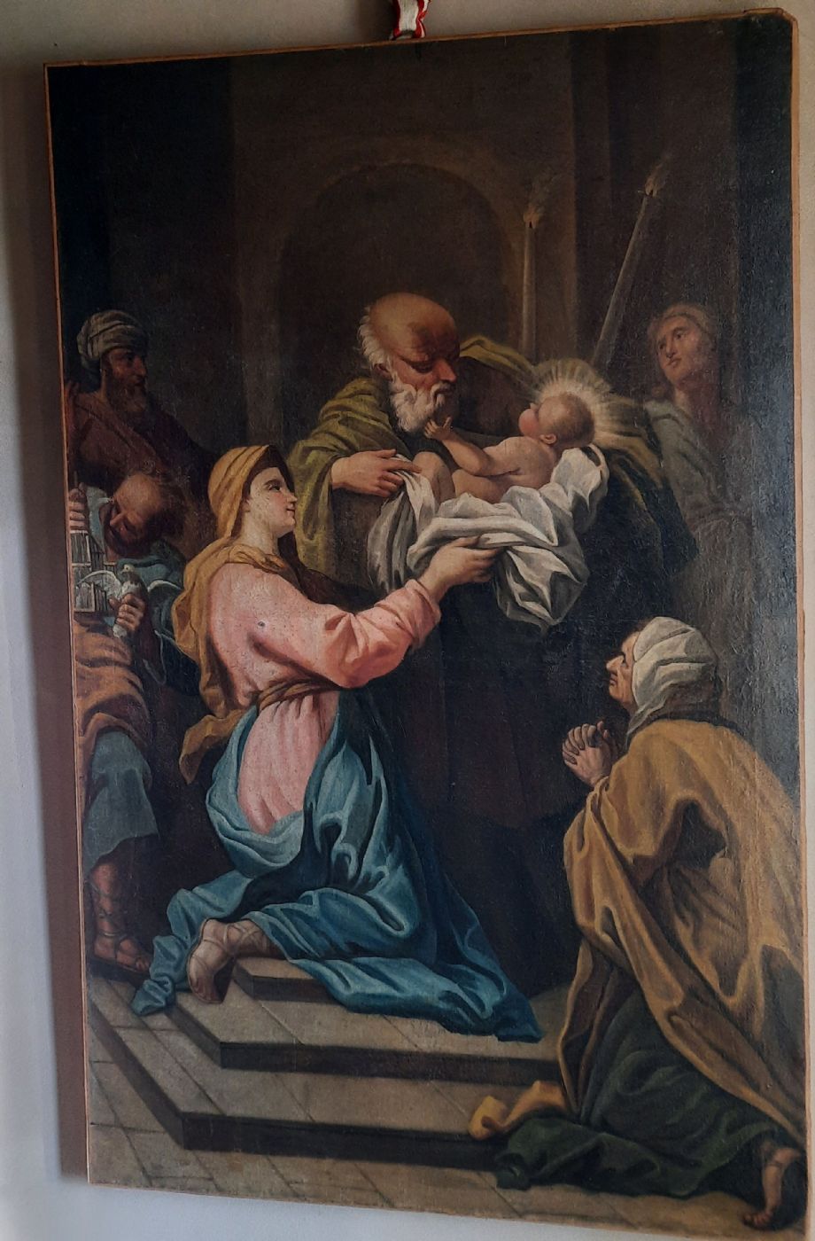 Bellissimo dipinto veneto, olio su tela della prima meta' del '700. La scena narrata e' quella della rappresentazione al tempio, i colori utilizzati sono morbidi e delicati come del resto le pose delle figure e delle vesti. La scena e' quasi sognata, evanescente, ma al tempo stesso cattura per la presenza scenica imponente e dirompente. Presenti forti richiami con alcune opere del Caravaggio, che probabilmente il pittore utilizza come modello durante la composizione dell' opera. misure circa 160x100cm La pittura e' da ricercare nella tecnica del Brentana.