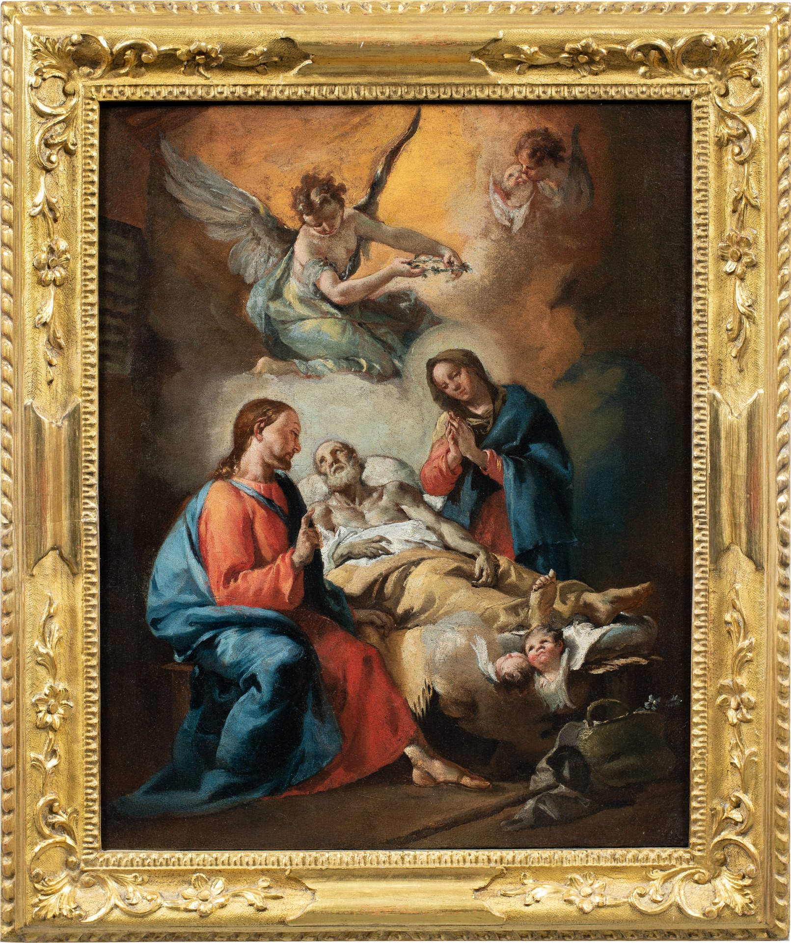Francesco Zugno (Venezia 1709 - Venezia 1787) - Transito di S. Giuseppe. 61 x 48 cm senza cornice, 76 x 63 cm con cornice. Olio su tela, in cornice in legno intagliato e dorato. - Ringraziamo il prof. Francesco Magani per aver confermato l’attribuzione del dipinto con una scheda critica....