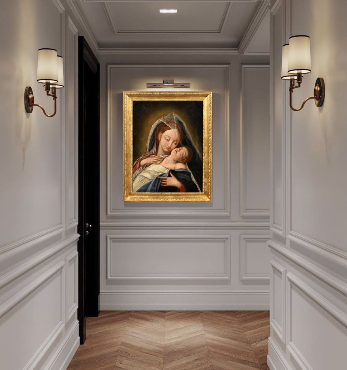 Questa delicata raffigurazione della Madonna in adorazione del Bambino esibisce tutta la dimensione umana e la dolcezza dell’atmosfera materna: Maria stringe a se in un tenero abbraccio il bambino addormentato, che sfiora la sua guancia, avvolto e protetto dal manto e addirittura da un lembo del velo della madre.