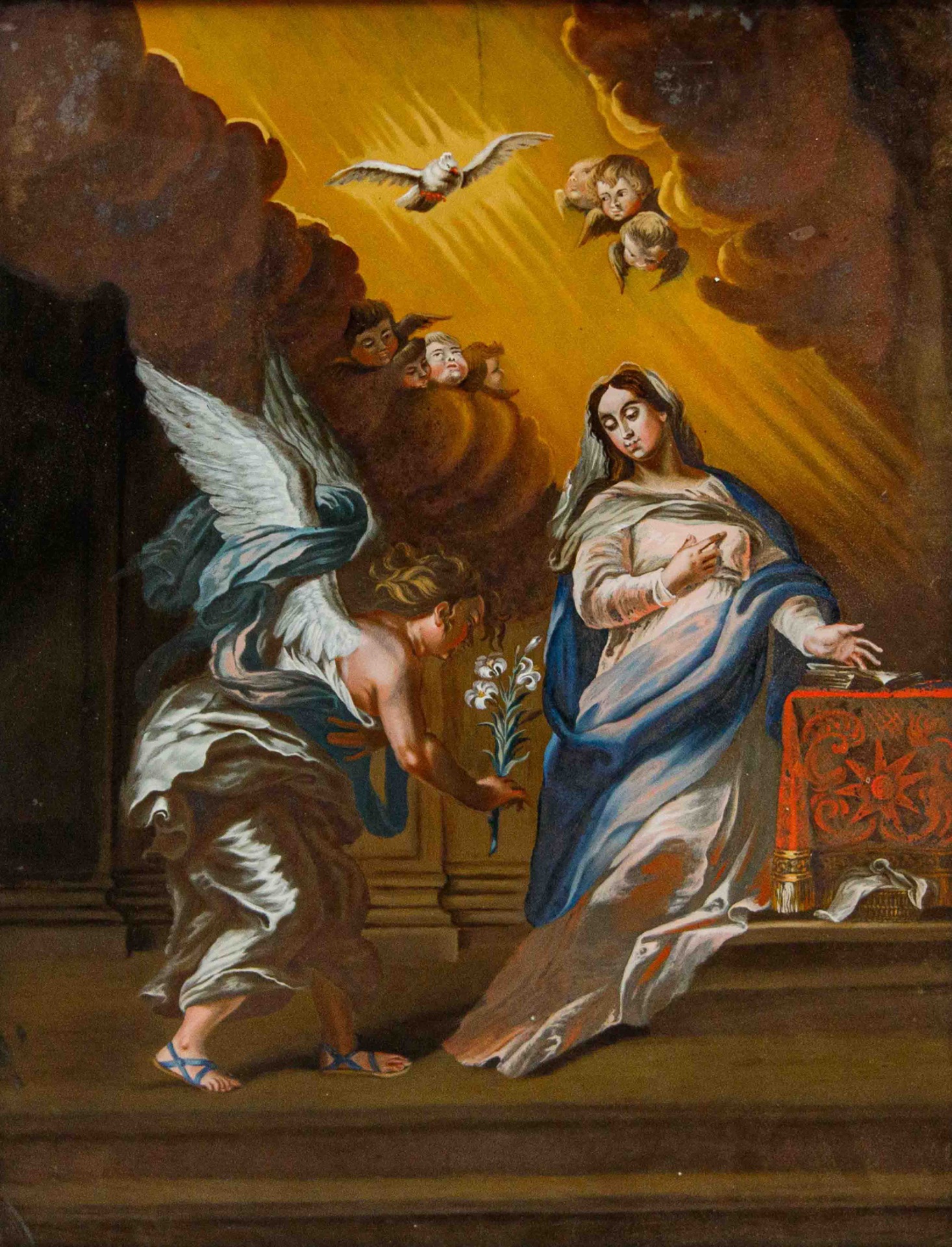 Seguace di Franz Thaddaus Menteler II (1715 - 1794), Svizzera centrale, ca. 1780 Annunciazione Olio su vetro rovesciato, cm 44 x 35 Con cornice, cm 51 x 42 Pubblicato in: Georg Staffelbach: Storia della pittura su vetro di Lucerna dagli inizi ai giorni nostri, Lucerna Con Ars...