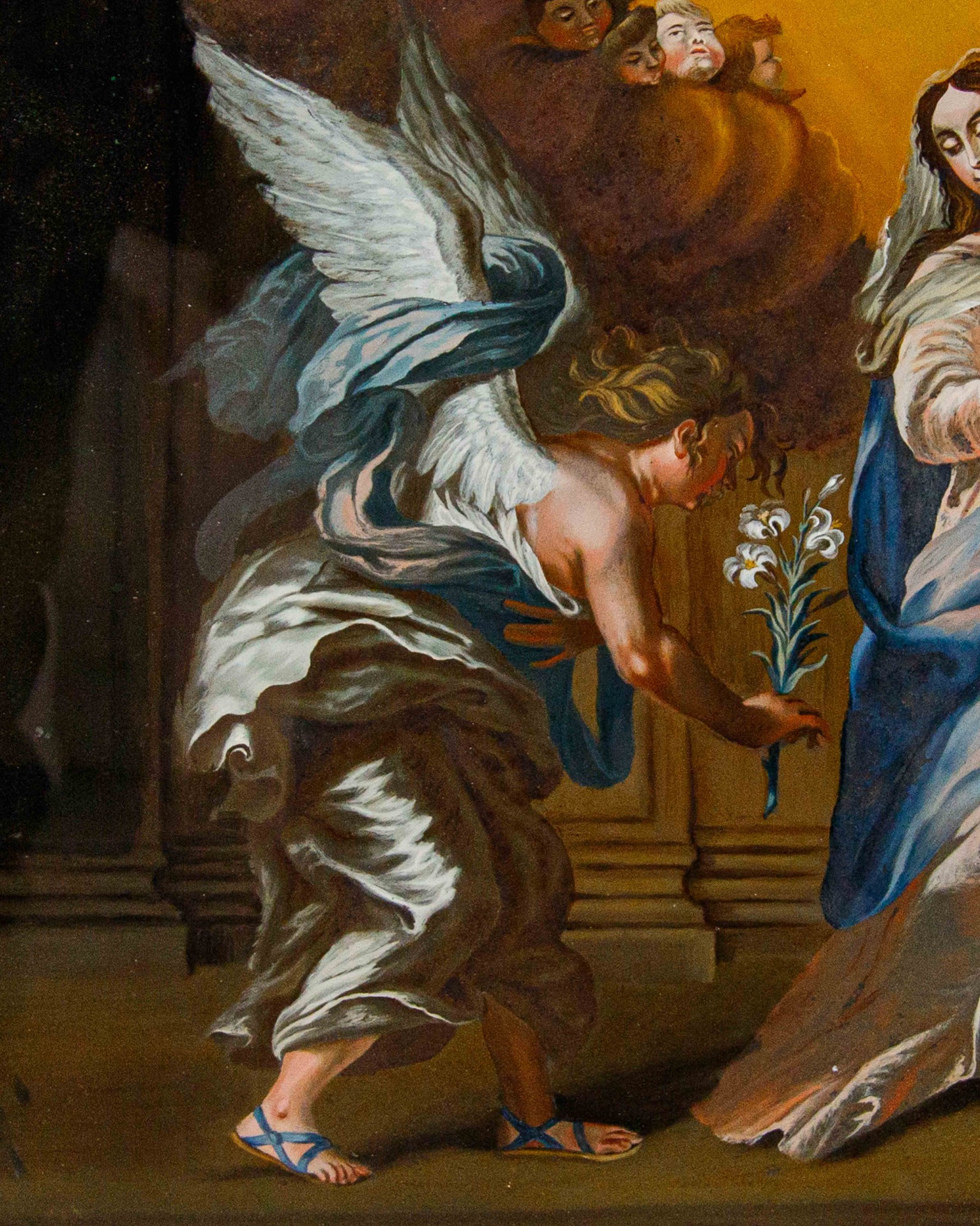 Seguace di Franz Thaddaus Menteler II (1715 - 1794), Svizzera centrale, ca. 1780 Annunciazione Olio su vetro rovesciato, cm 44 x 35 Con cornice, cm 51 x 42 Pubblicato in: Georg Staffelbach: Storia della pittura su vetro di Lucerna dagli inizi ai giorni nostri, Lucerna Con Ars...
