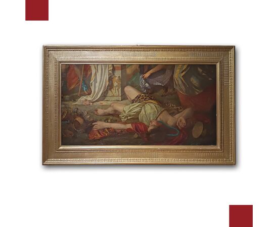 Bel dipinto neoclassico realizzato ad olio su tela e incorniciato in una cornice in legno intagliato e dorato coeva. Il quadro presenta un notevole utilizzo del chiaroscuro e delle ombre e la scena raffigura un baccanale, al cui centro si staglia un giovane svenuto, immerso nell'orgia della festa. Il giovane indossa delle tuniche e una collana con pietre azzurre, mentre teneva in mano una coppa e un’anfora rotta, da cui si versava del vino. Attorno a lui compaiono diversi personaggi, visibili solo per gli arti inferiori, tra cui si notano tuniche e un calzare decorato con stelle; infine, è presente anche una mano. L'ambientazione presenta, sulla parete, una scena di danza che richiama le pitture parietali etrusche, un chiaro segno dell'ispirazione classica dell'artista. Infine in basso, sul bordo destro del dipinto, è visibile la siglatura dell'autore. Si ascrive ad un pittore dell’area italiana del periodo neoclassico, intorno alla seconda metà del XVIII secolo.