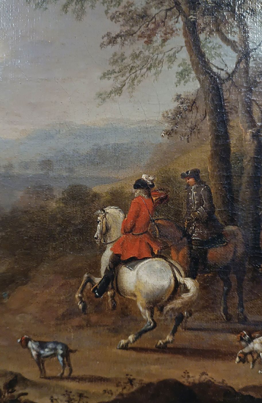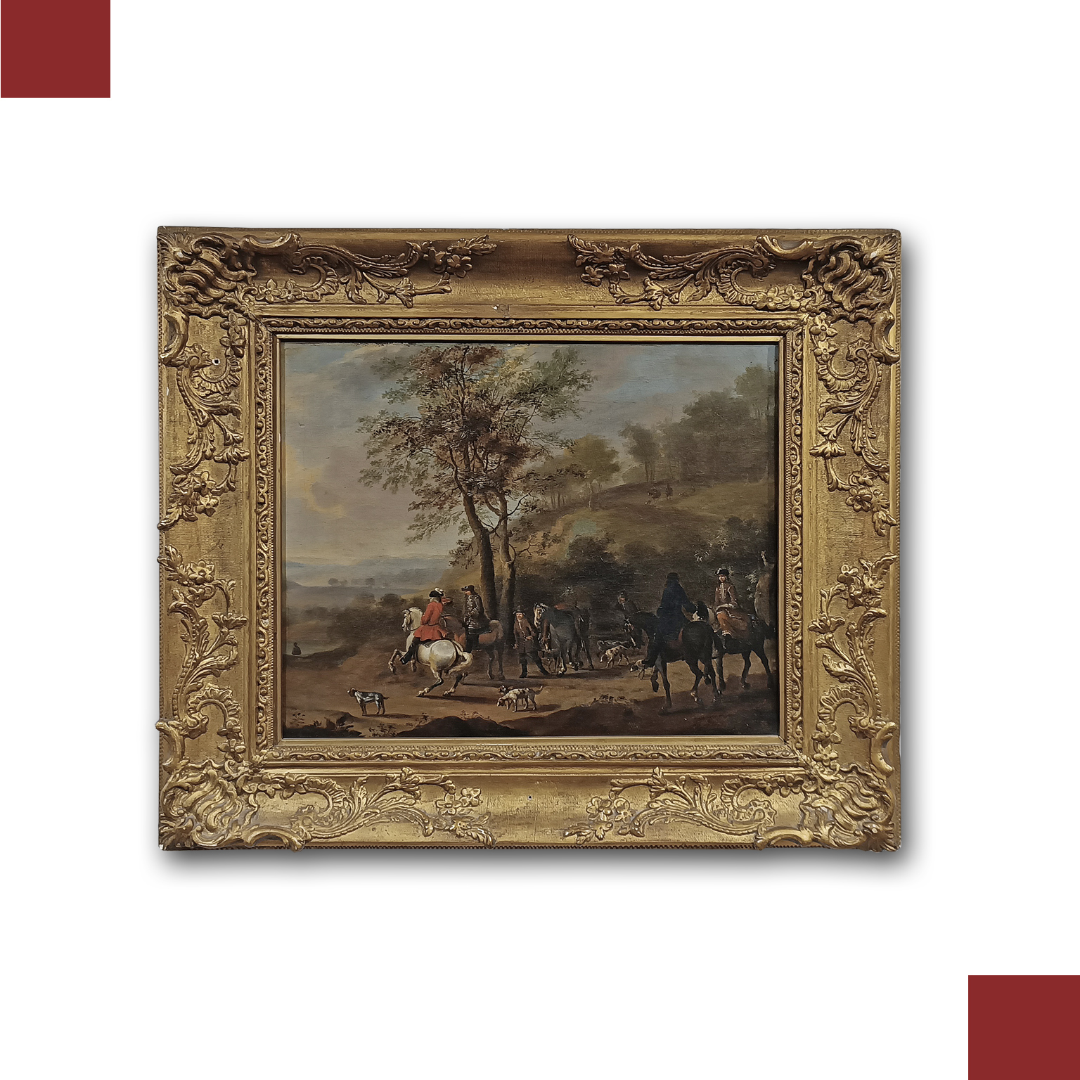 Bel dipinto realizzato ad olio su tela, in prima tela, ed incorniciato da una cornice in legno intagliato e dorato a foglia d’oro. La scena raffigurata rappresenta una partenza di caccia, con figure di cacciatori a cavallo in primo piano e in lontananza, circondati da cani pronti alla caccia. L’ambiente è collinare, e sullo sfondo si intravede un paesaggio naturale che arricchisce la composizione. L’opera si distingue per l’elevata qualità stilistica e pittorica, evidenziando un sapiente uso dei colori, delle ombreggiature e delle sfumature che conferiscono profondità e realismo alla scena. Manifattura ascrivibile alla Scuola Inglese della metà del XVIII secolo.