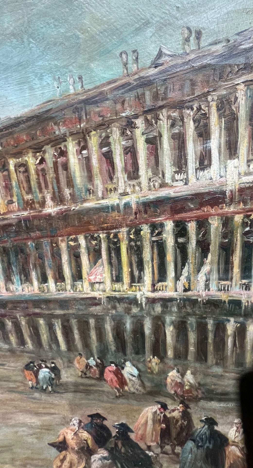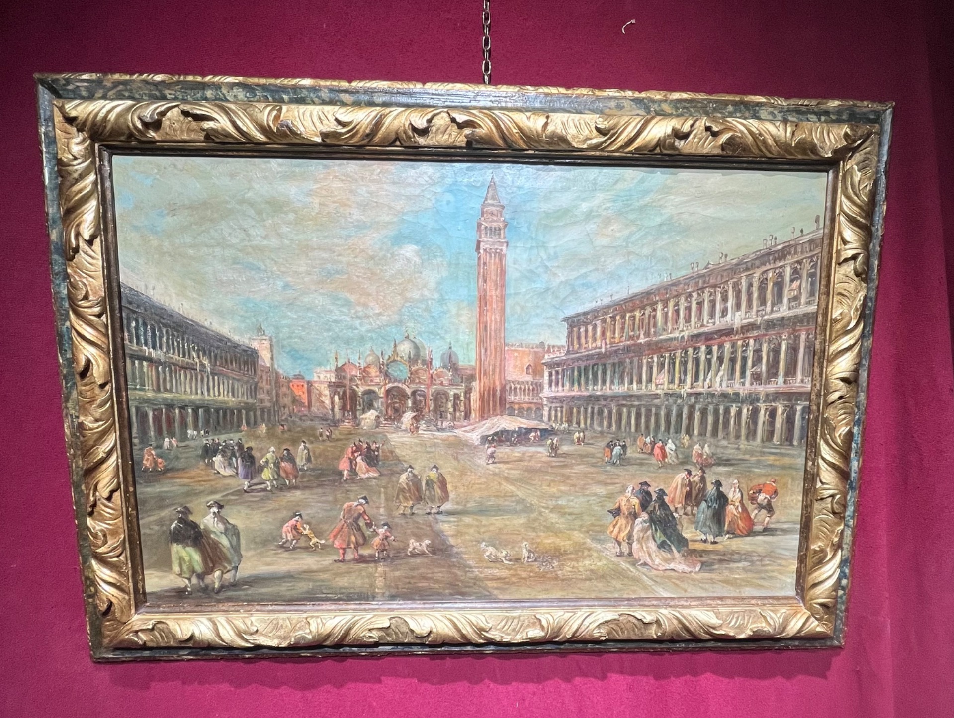 Importante veduta di Piazza San Marco . Scuola Guardesca. Sec XVIII '. Misure : 100 x 70 cornice coeva . 83 x 53 tela . Corredato da certificato di autenticità in base alla legge n 1062 art 2