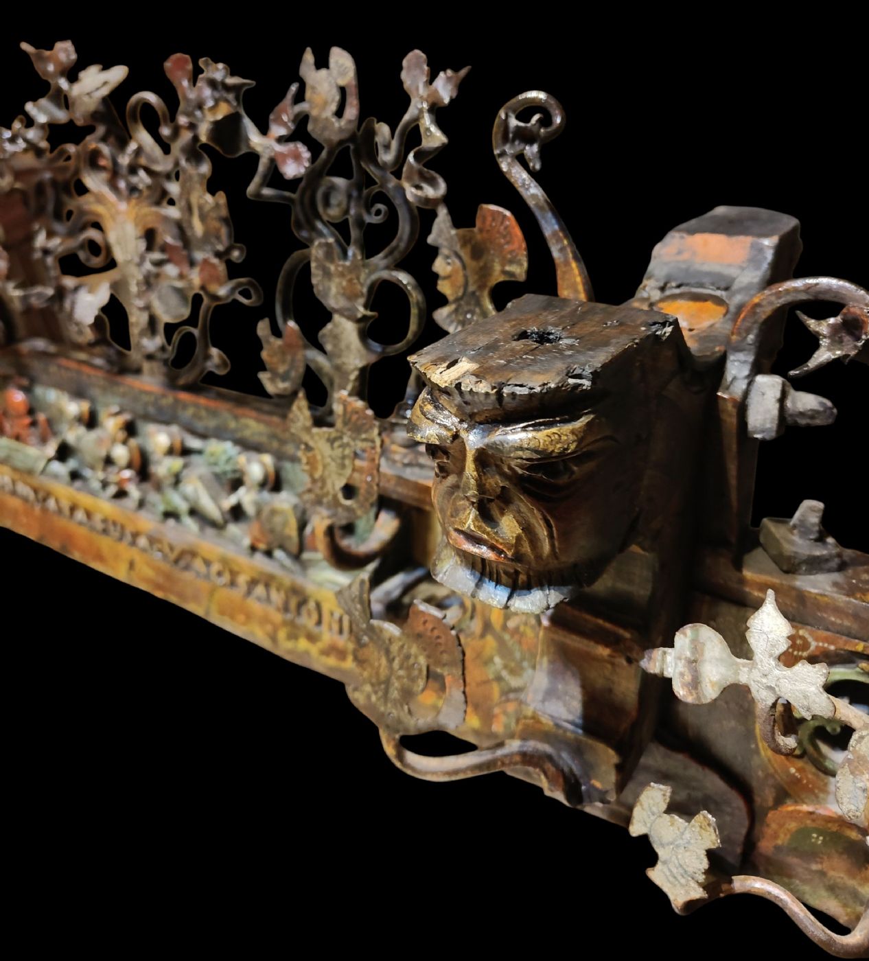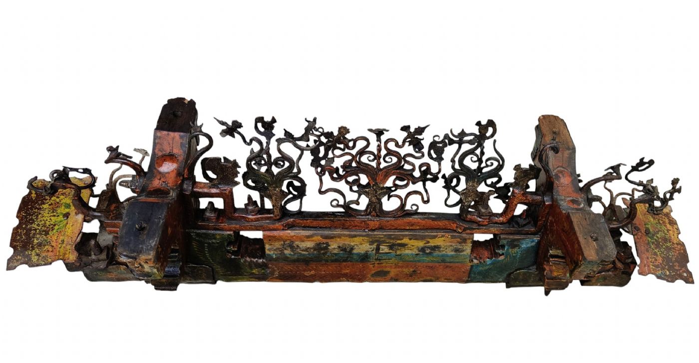 Questo cassafuso (elemento decorativo che collega le 2 ruote posteriori del carro) è di eccellente qualità scultorica e conserva la quasi totalità della policromia originale (molto raro). E' dipinta una data solo parzialmente leggibile (5 maggio sembrerebbe 1931 o 34). Bella la decorazione anche del lato posteriore.
