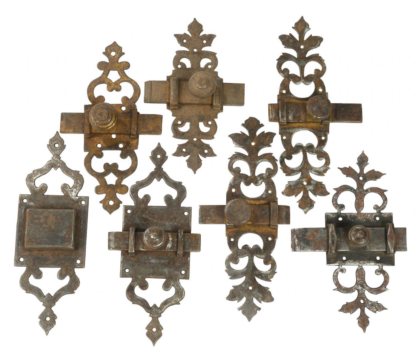Catenacci in ferro forgiato per la chiusura di porte, finestre o mobili. Grandi dimensioni. 6 Pezzi "maschi" ed 1 "femmina". Disponibili singolarmente (100 €) o in gruppo. Altezza da 20 a 27 cm