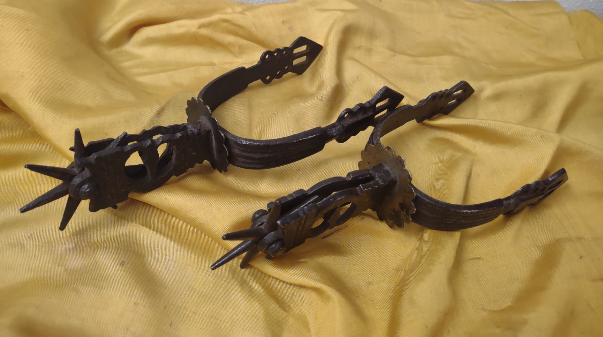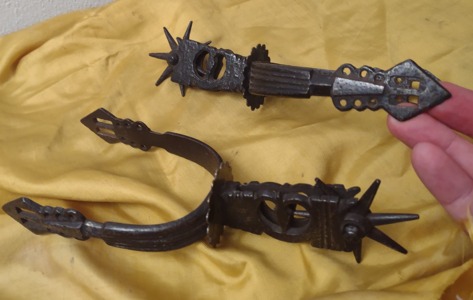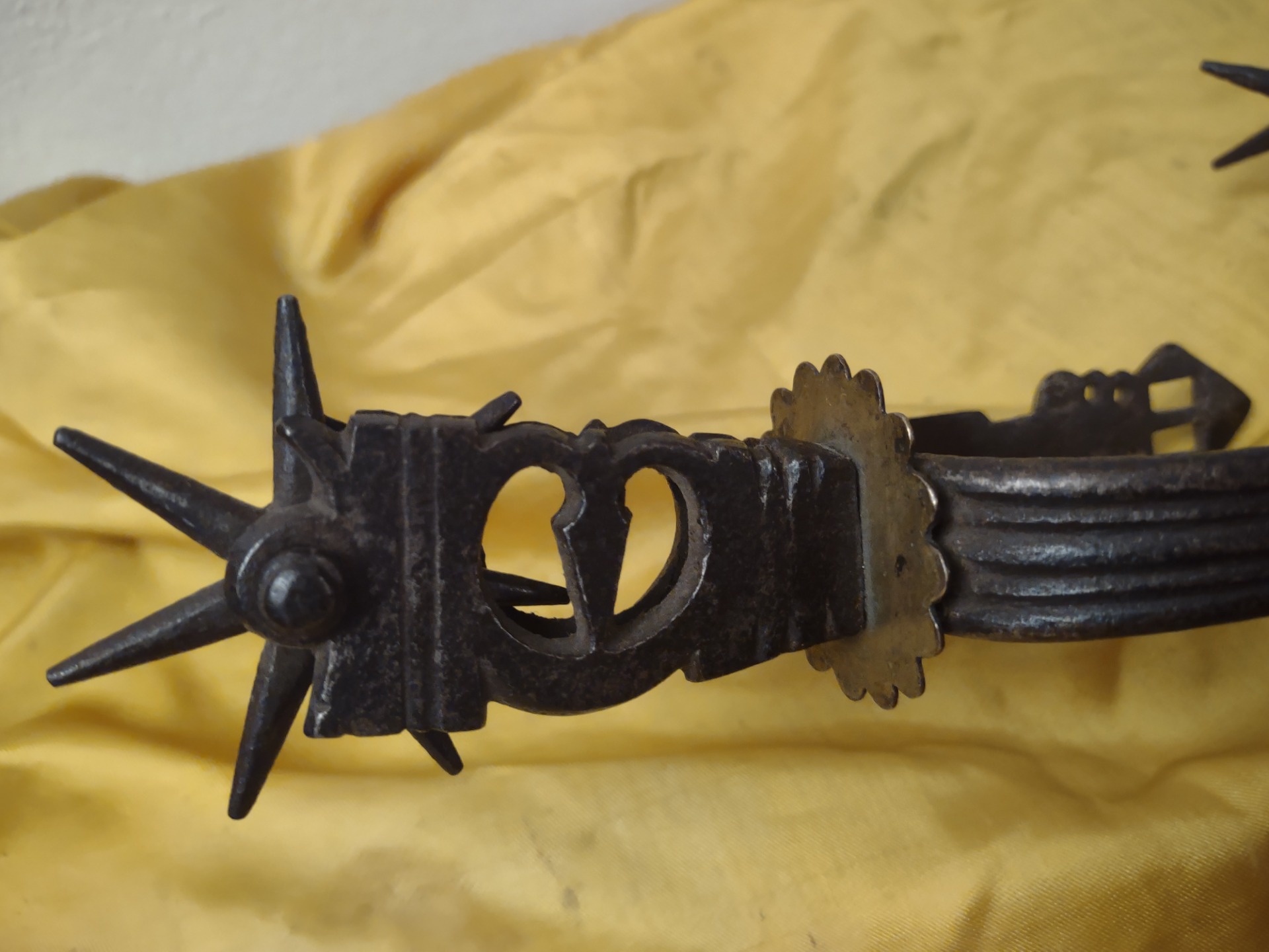 Bella coppia di speroni in ferro forgiato, bella patina ed ottime condizioni. Rosetta in ottone. Probabilmente provenienza da Argentina. Dimensioni lunghezza 20, larghezza 8