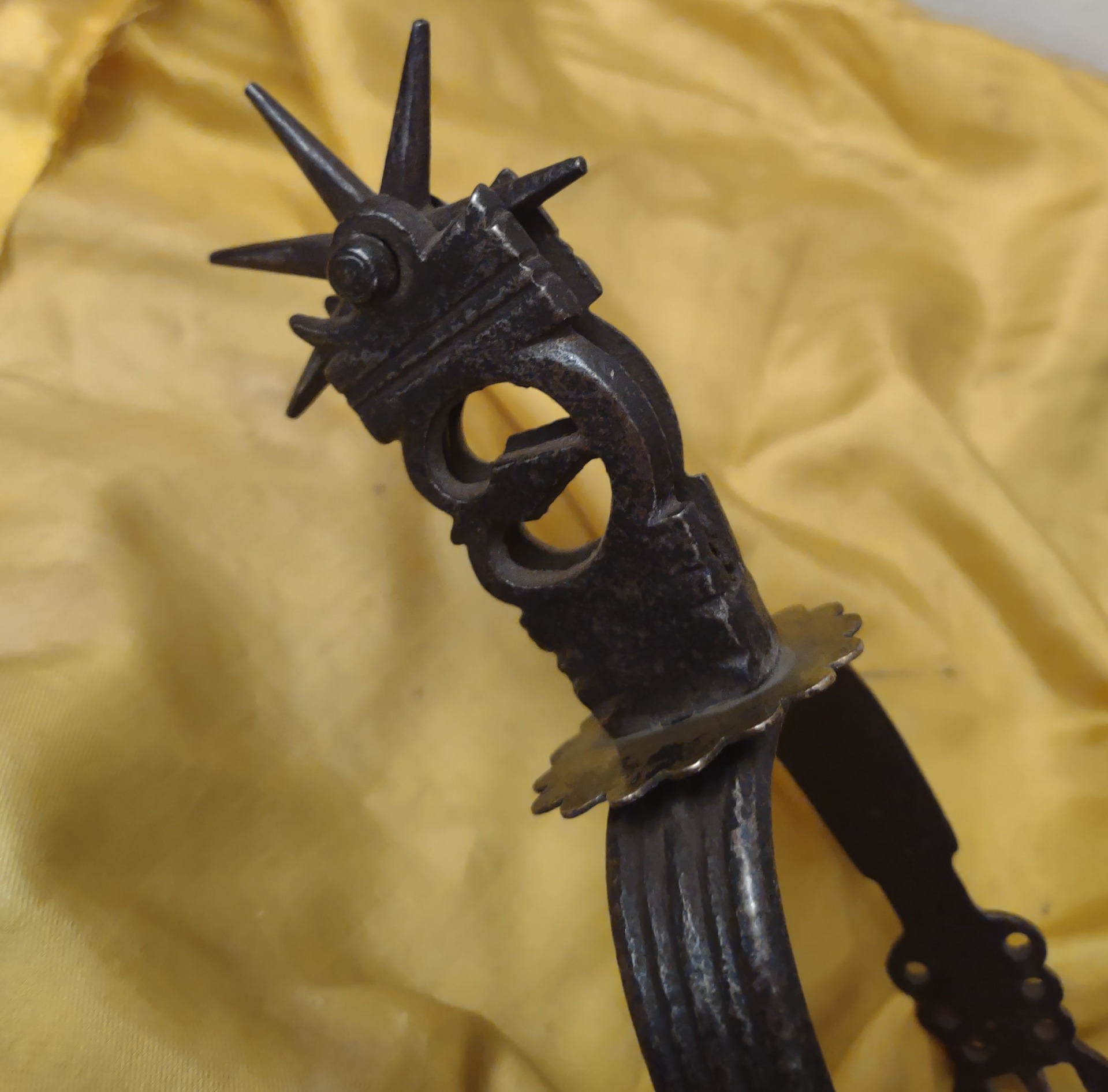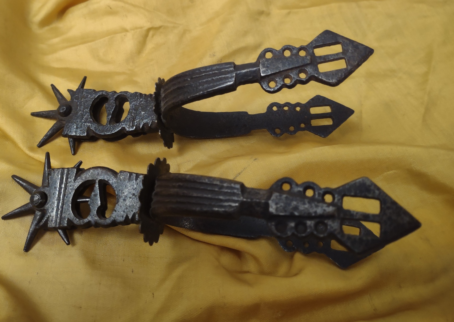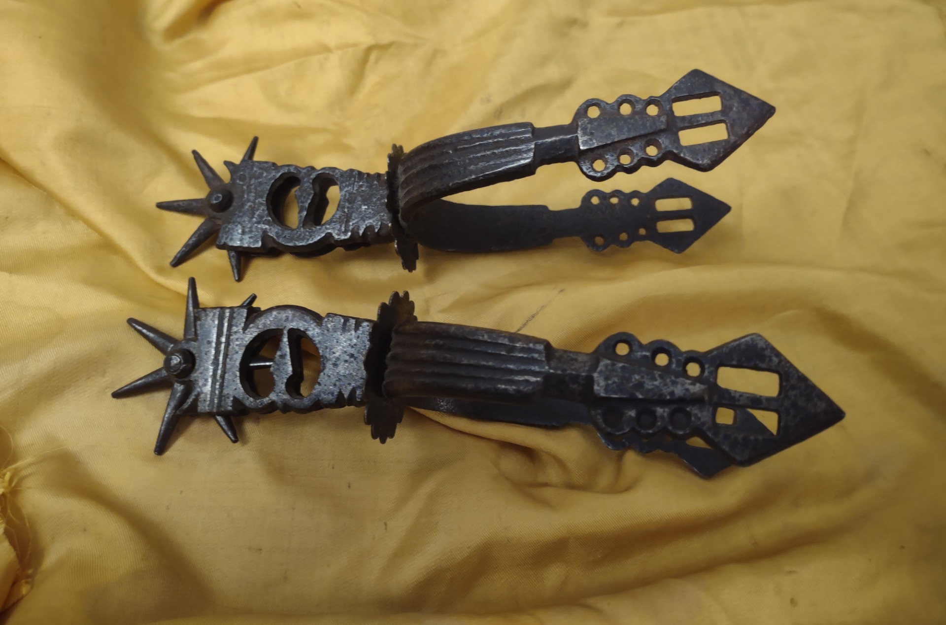 Bella coppia di speroni in ferro forgiato, bella patina ed ottime condizioni. Rosetta in ottone. Probabilmente provenienza da Argentina. Dimensioni lunghezza 20, larghezza 8