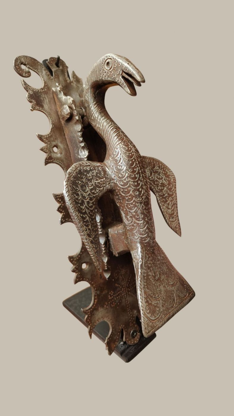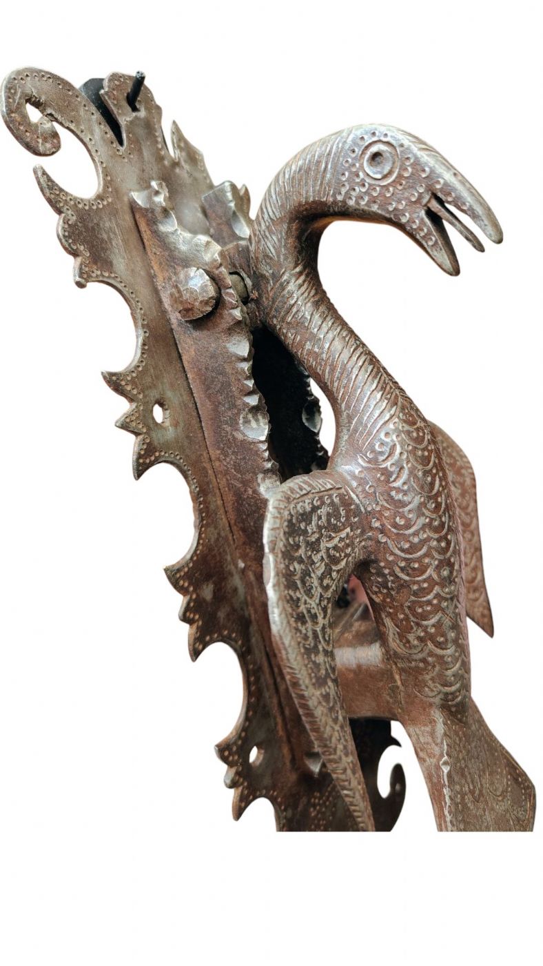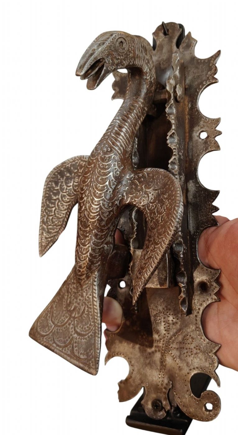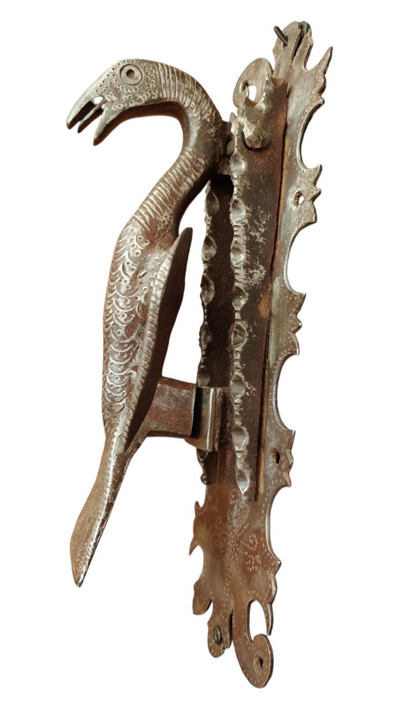 Importante battiporta in ferro forgiato ed inciso a forma di colomba, dotato di piastra originale (visibili 2 piccole mancanze alle estremità).Altezza battente 19,5 cm, altezza piastra 27 cm. Epoca: fine XVI- inizio XVII secolo