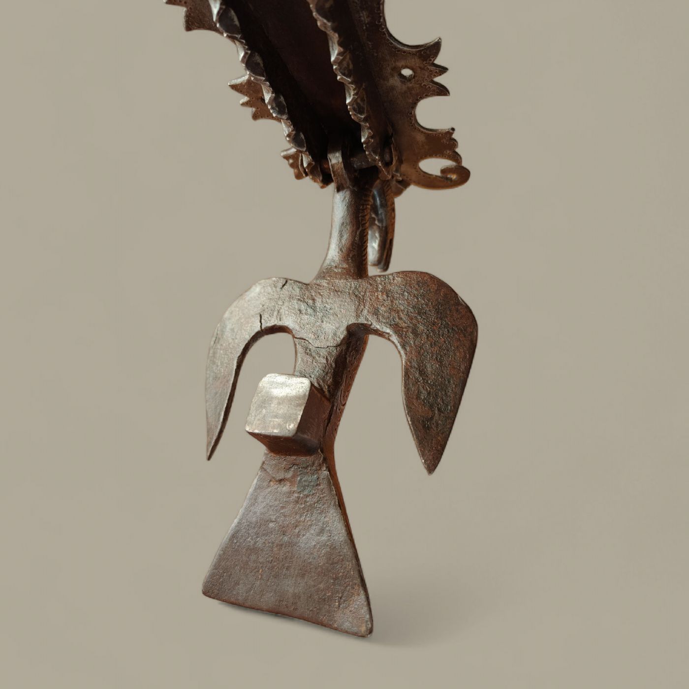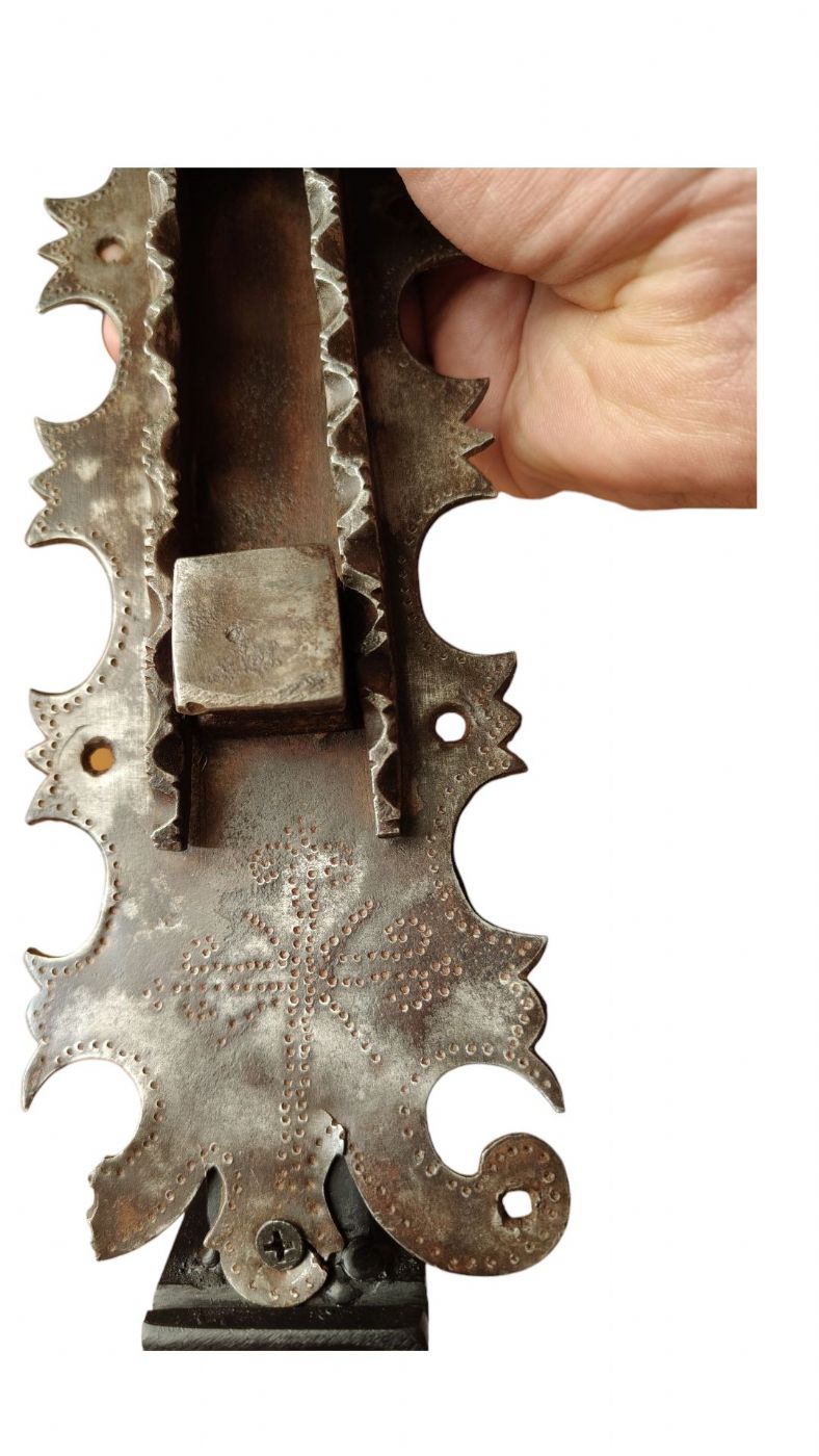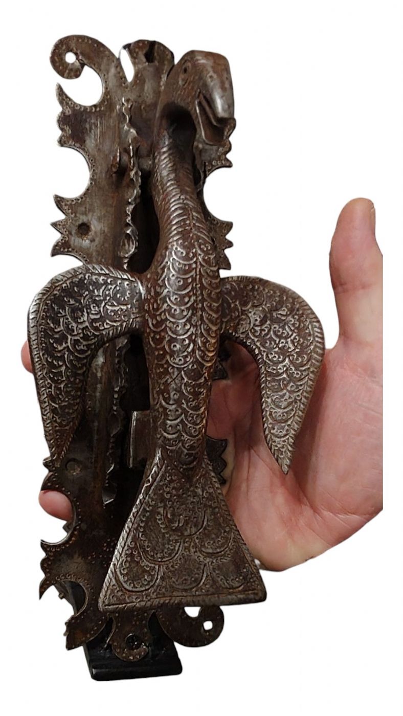 Importante battiporta in ferro forgiato ed inciso a forma di colomba, dotato di piastra originale (visibili 2 piccole mancanze alle estremità).Altezza battente 19,5 cm, altezza piastra 27 cm. Epoca: fine XVI- inizio XVII secolo