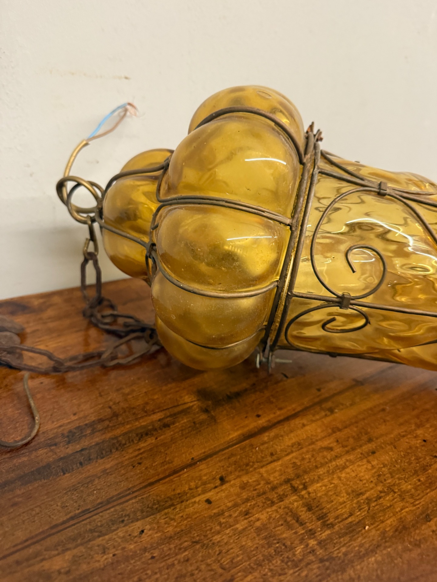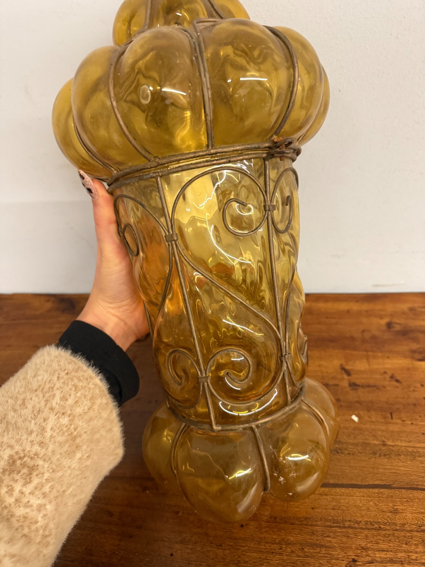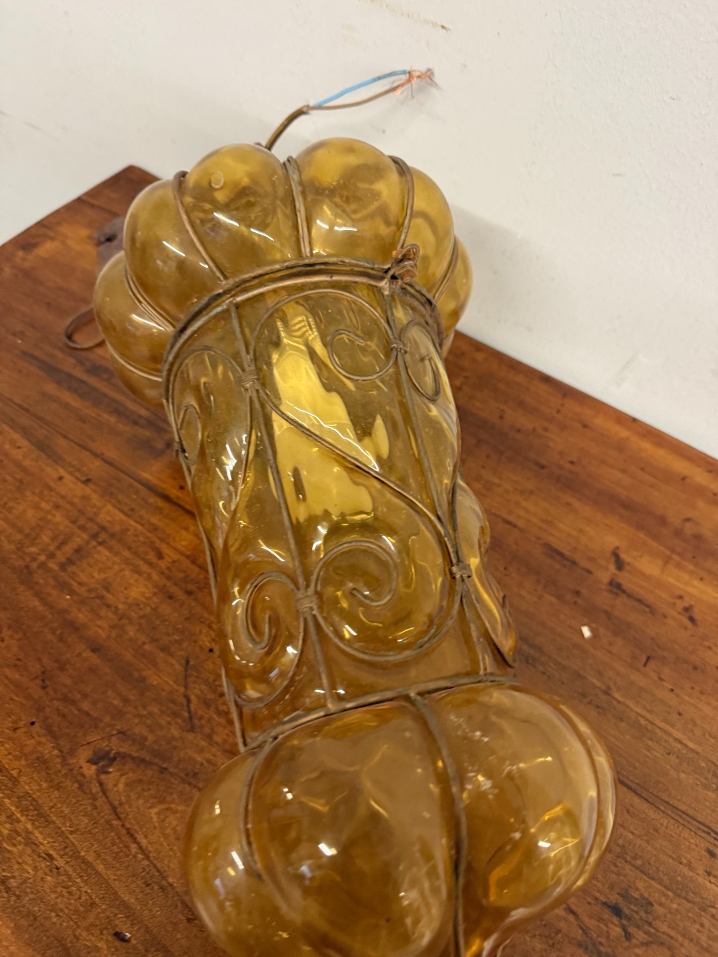 Antica lanterna in vetro di Murano, soffiata a mano, e in ferro battuto, gialla, fine'800, 48x30cm. Ottimo stato.