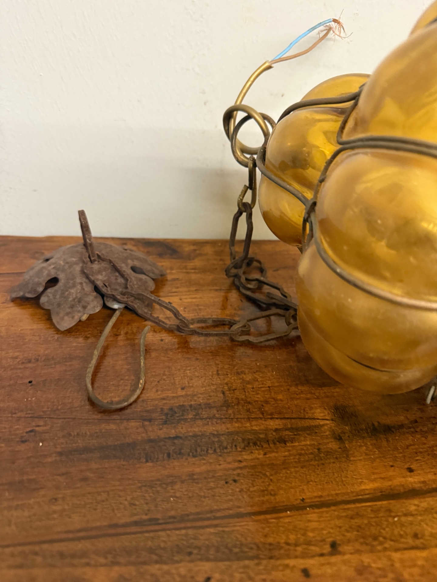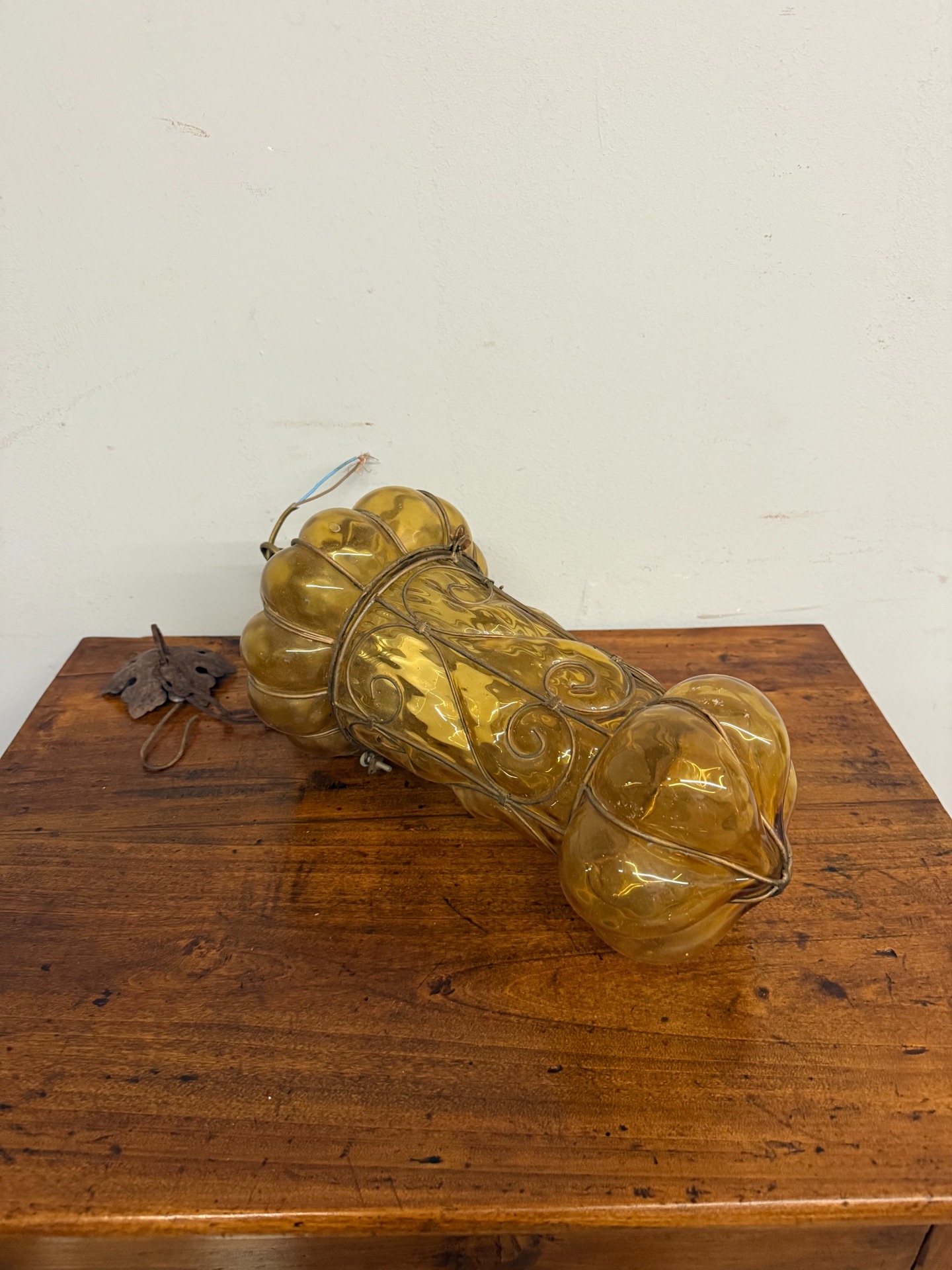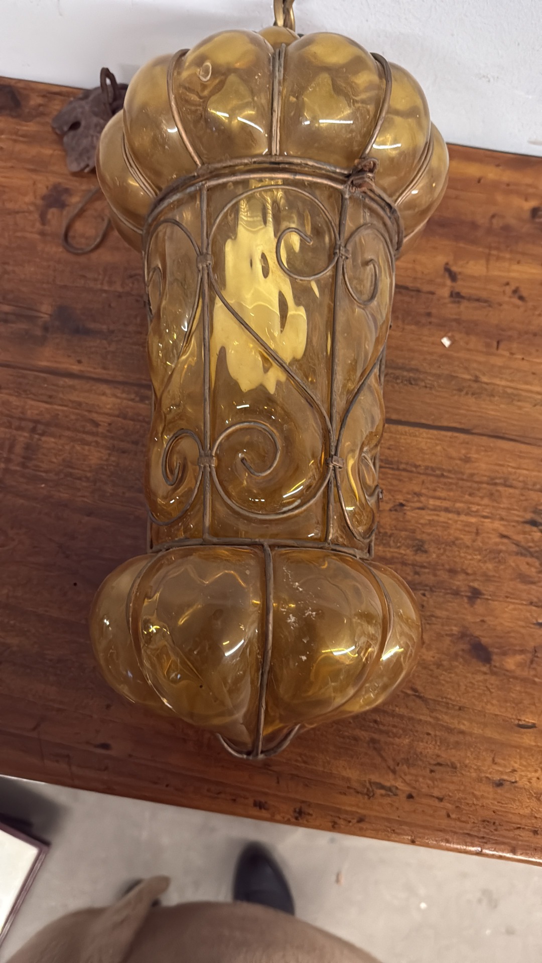 Antica lanterna in vetro di Murano, soffiata a mano, e in ferro battuto, gialla, fine'800, 48x30cm. Ottimo stato.