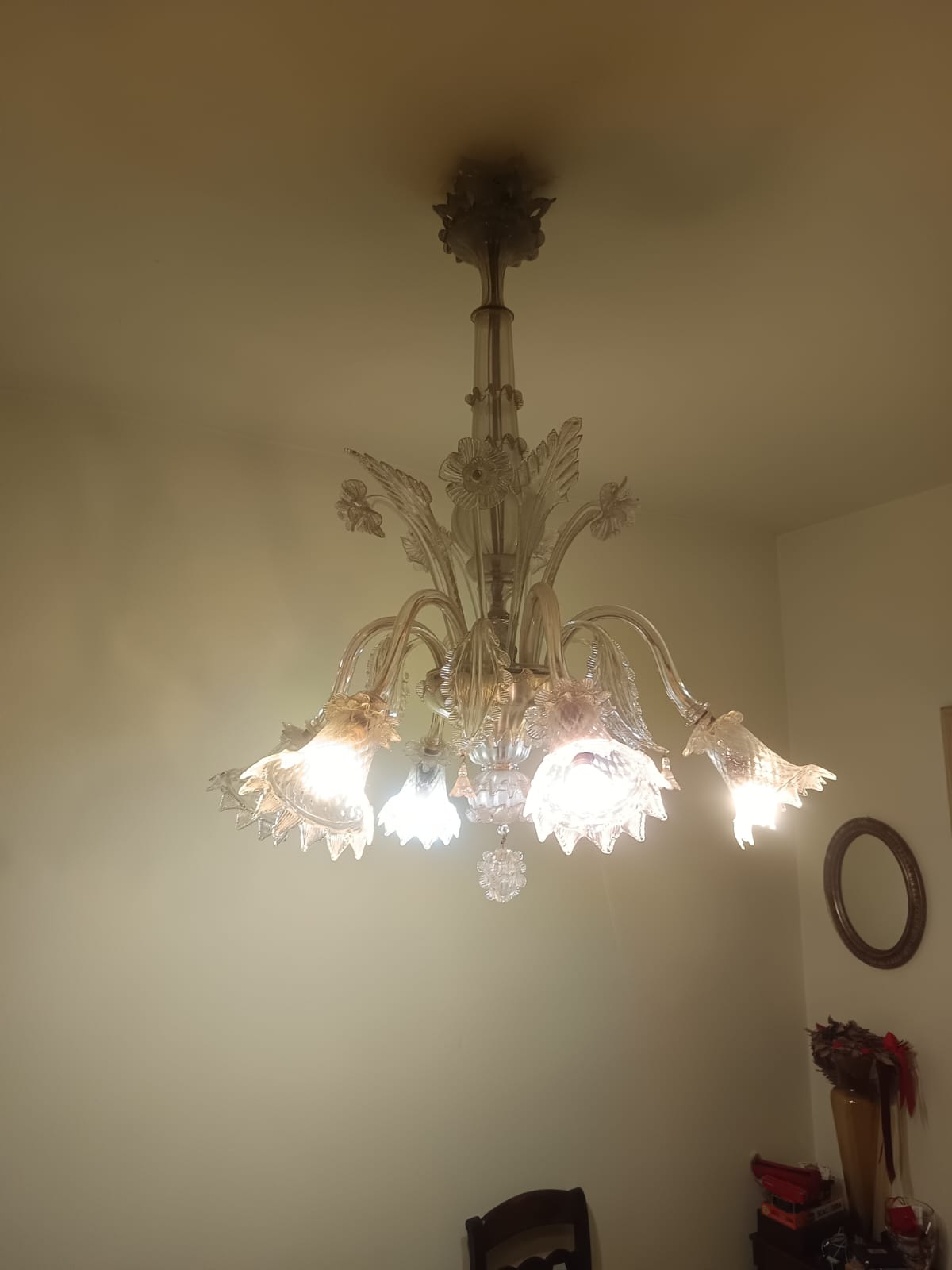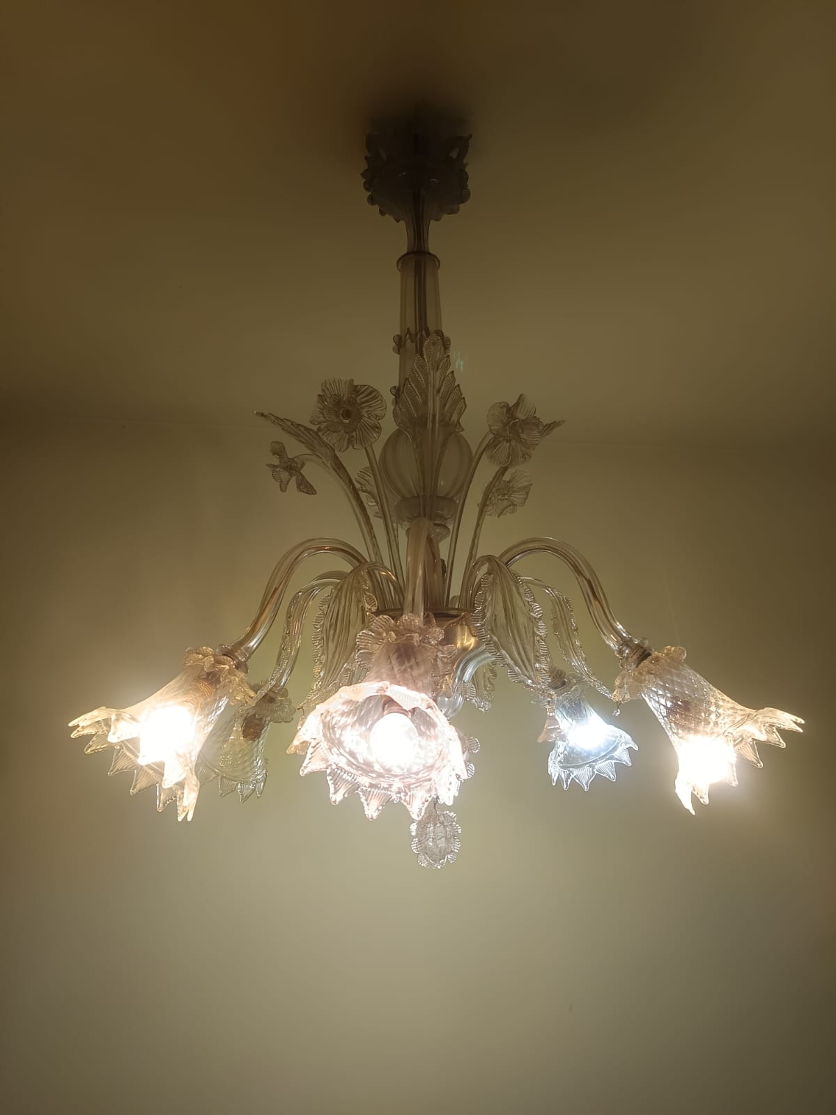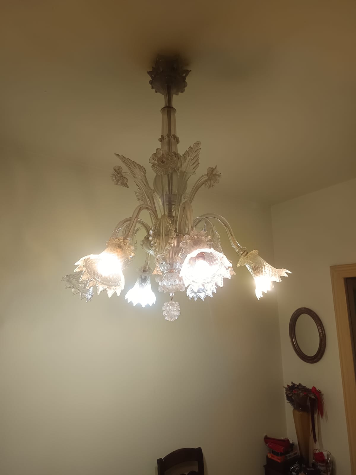 Lampadario anni 30 in vetro di Murano a sei luci. Piccoli difetti e qualche piccola sbeccatura che a lampadario montato non si vedono.