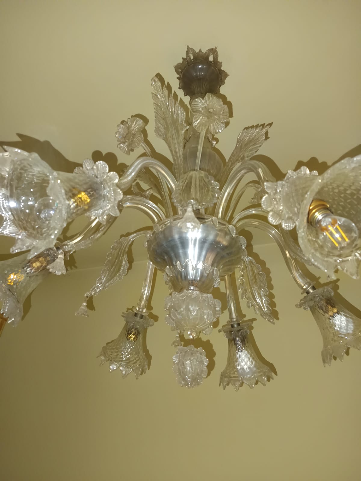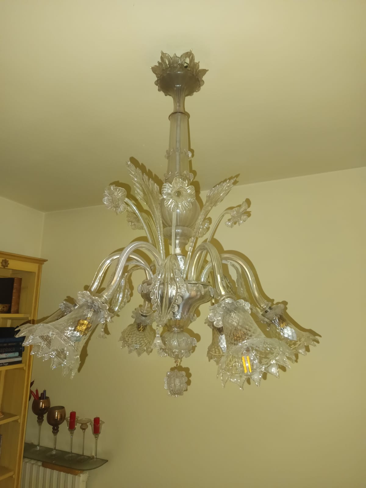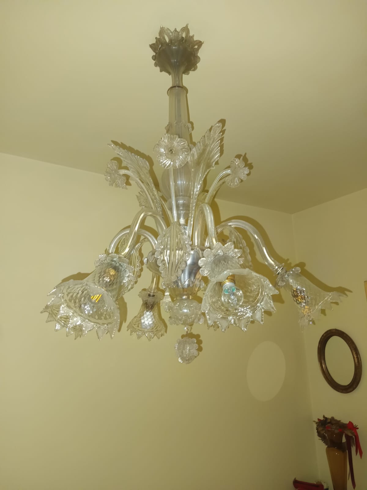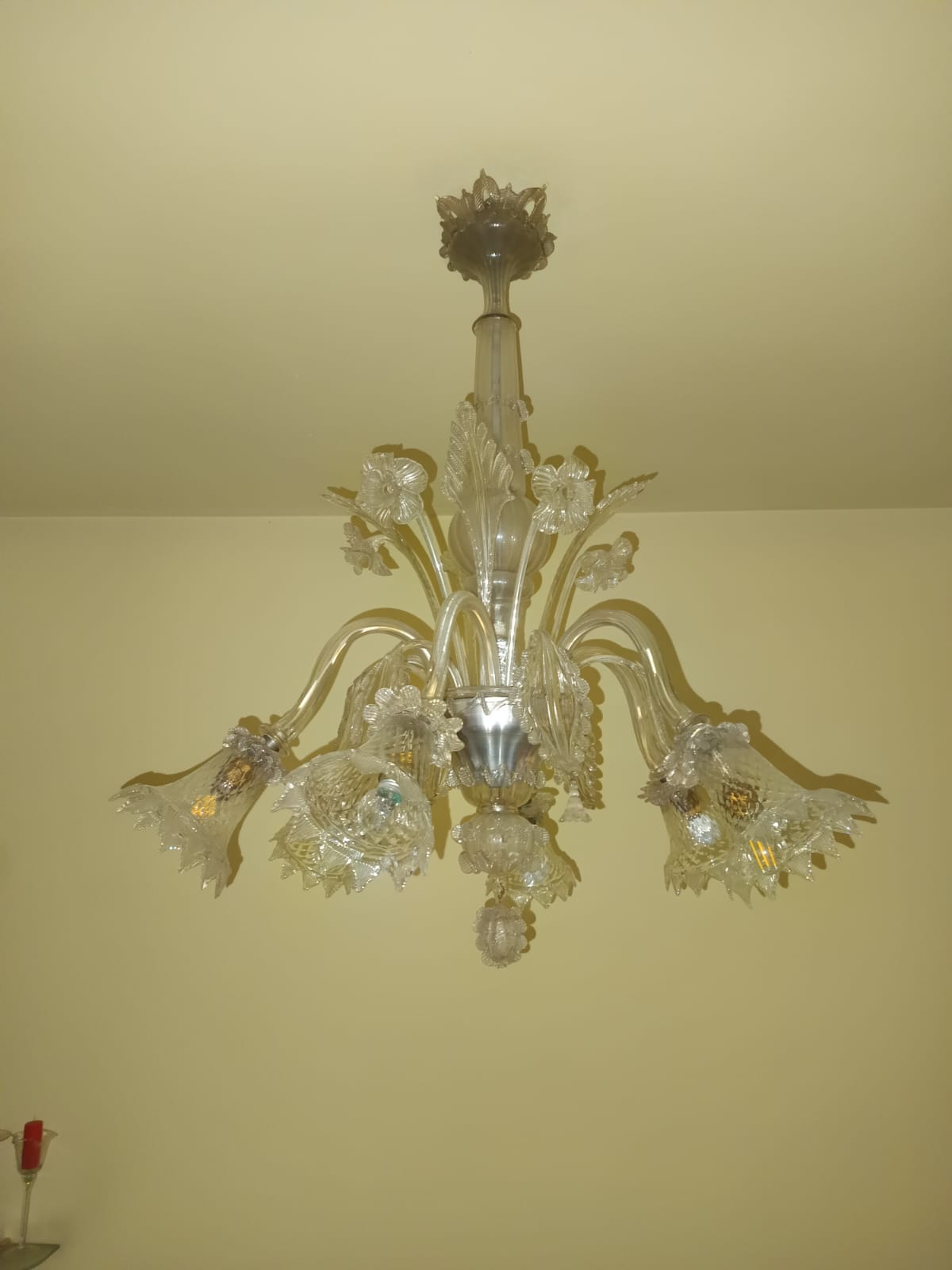 Lampadario anni 30 in vetro di Murano a sei luci. Piccoli difetti e qualche piccola sbeccatura che a lampadario montato non si vedono.