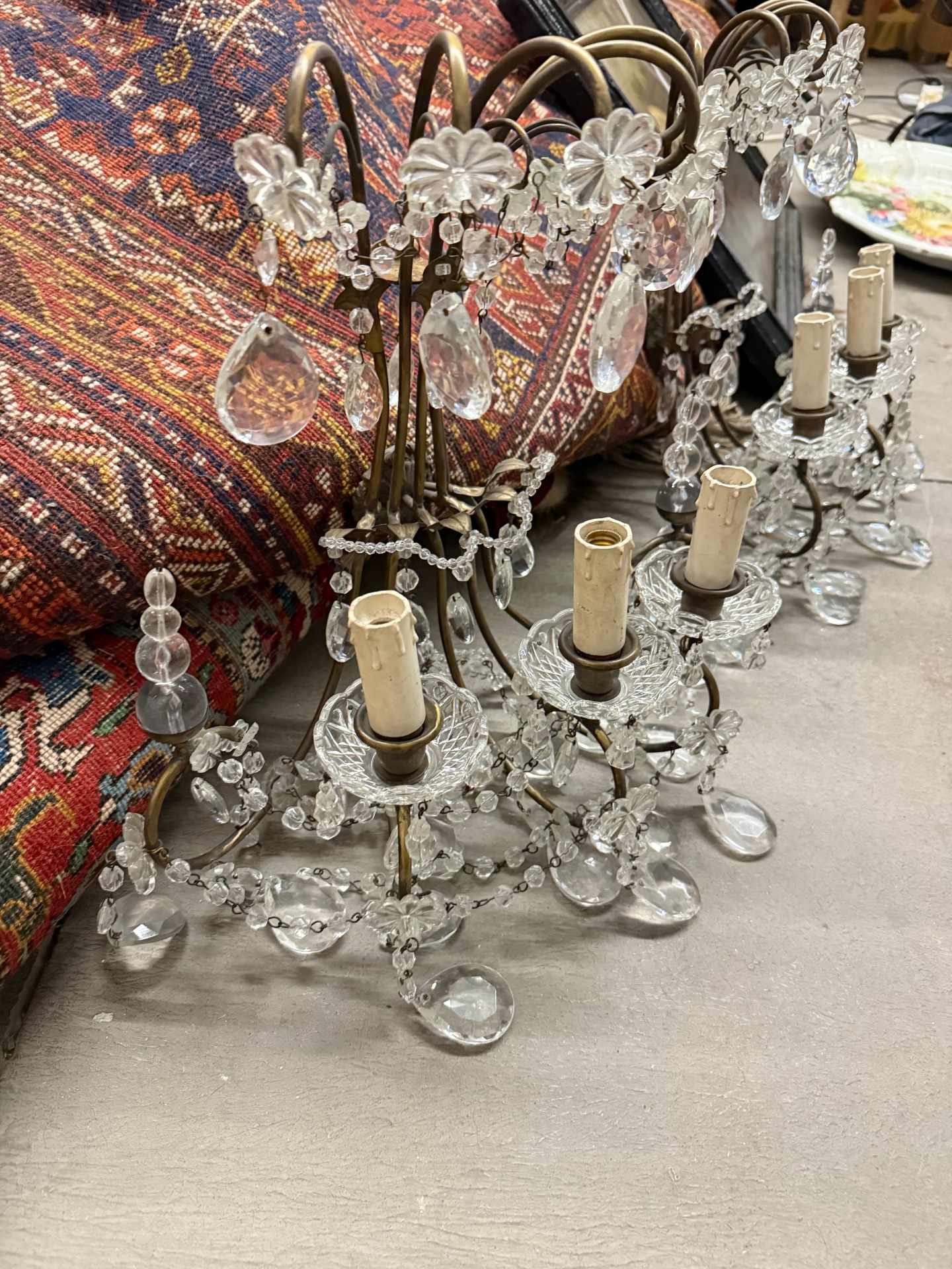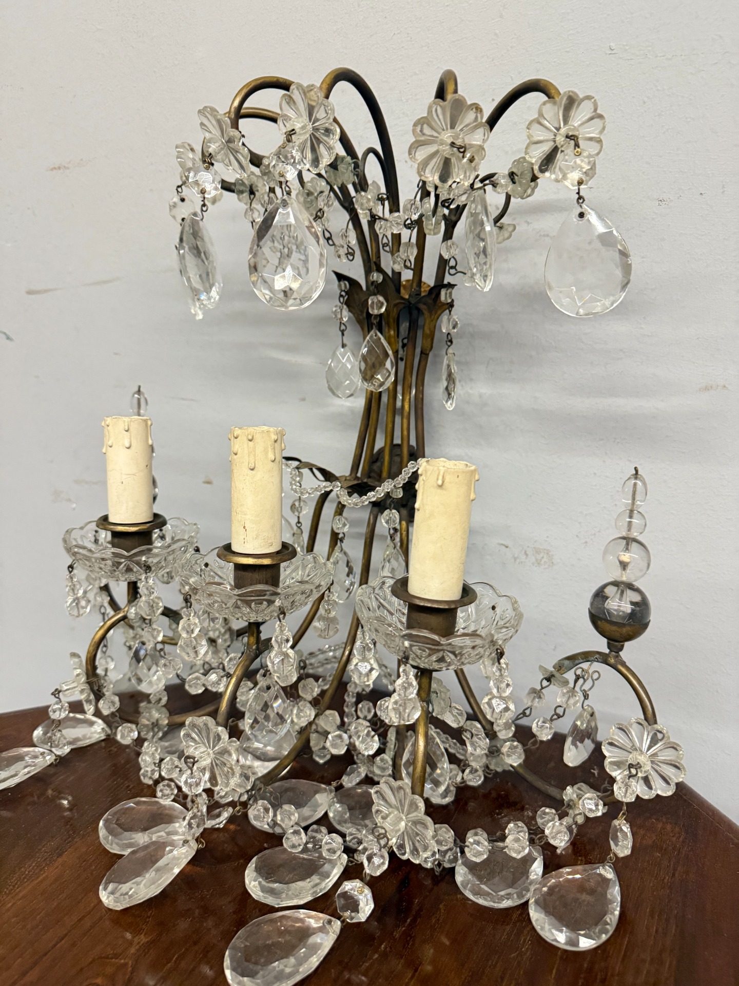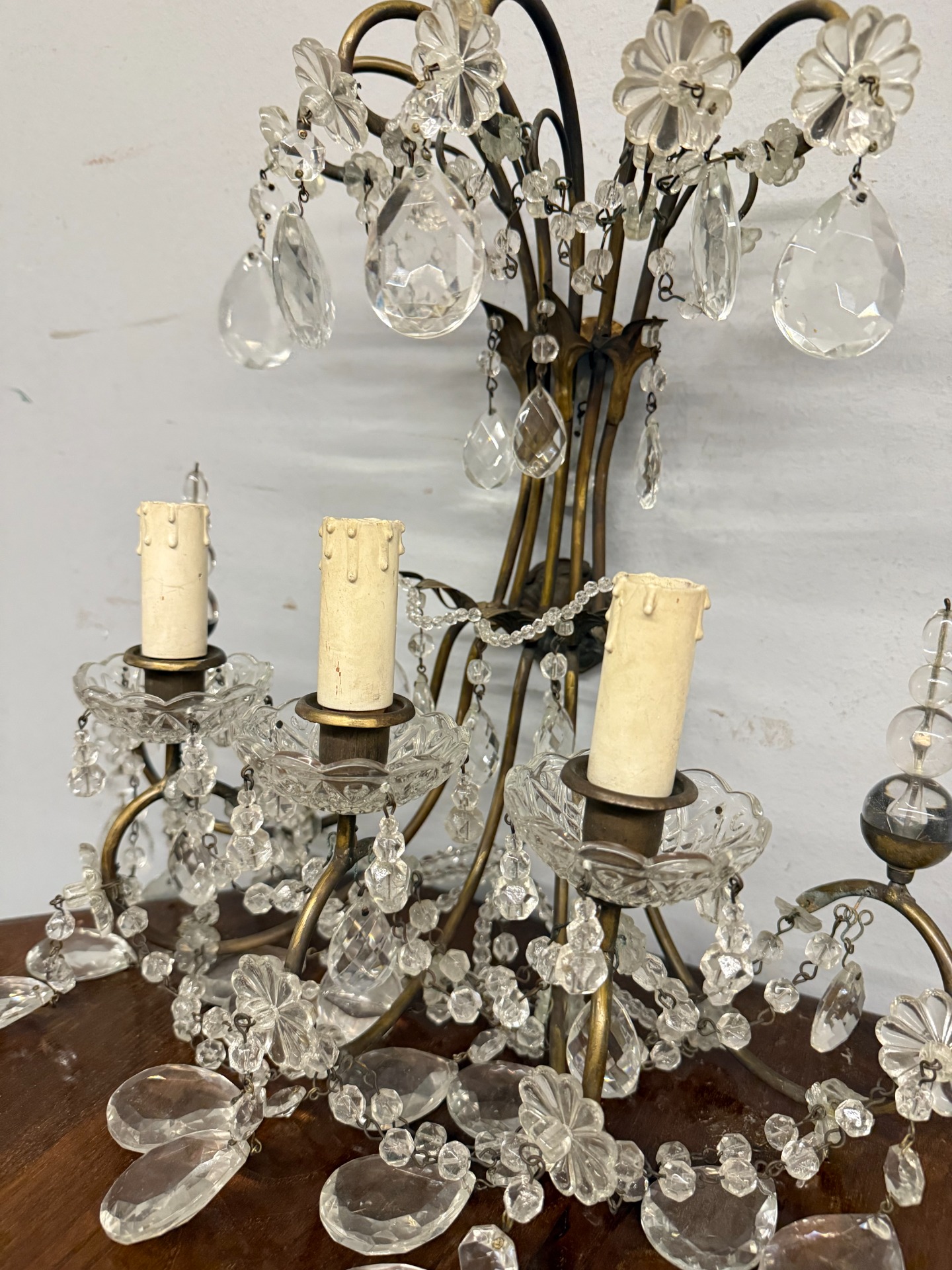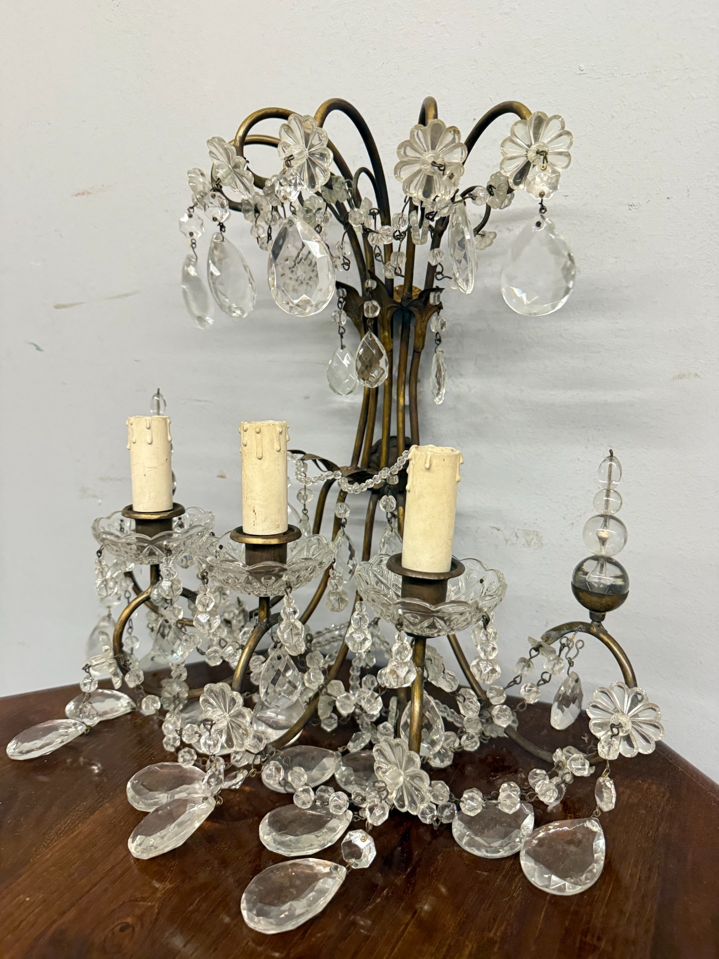Antica coppia di appliques '900 a tre luci con gocce di cristallo 40x40x20cm