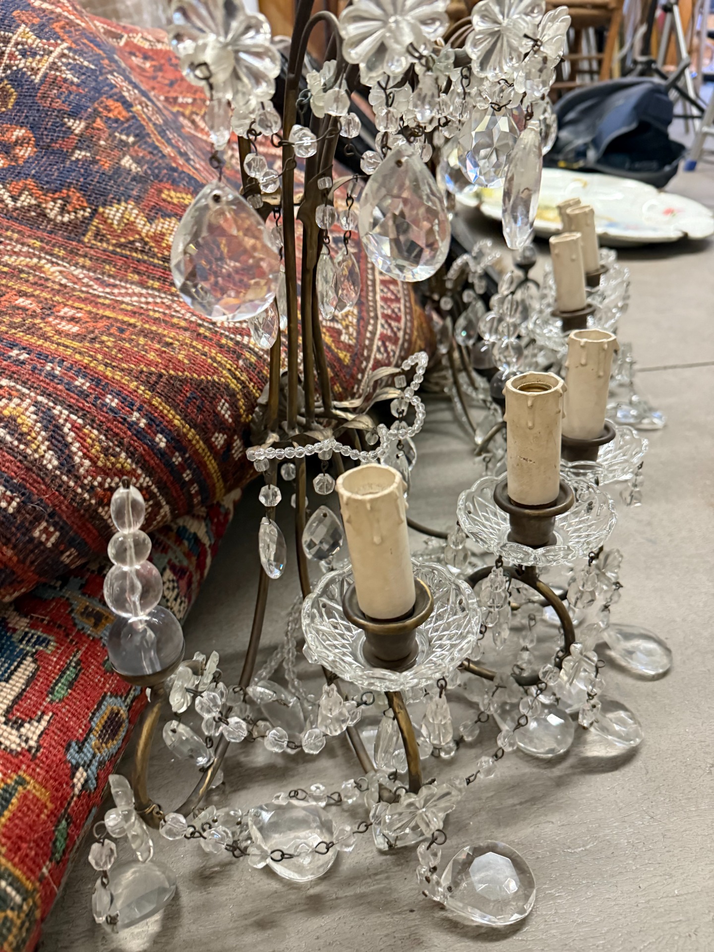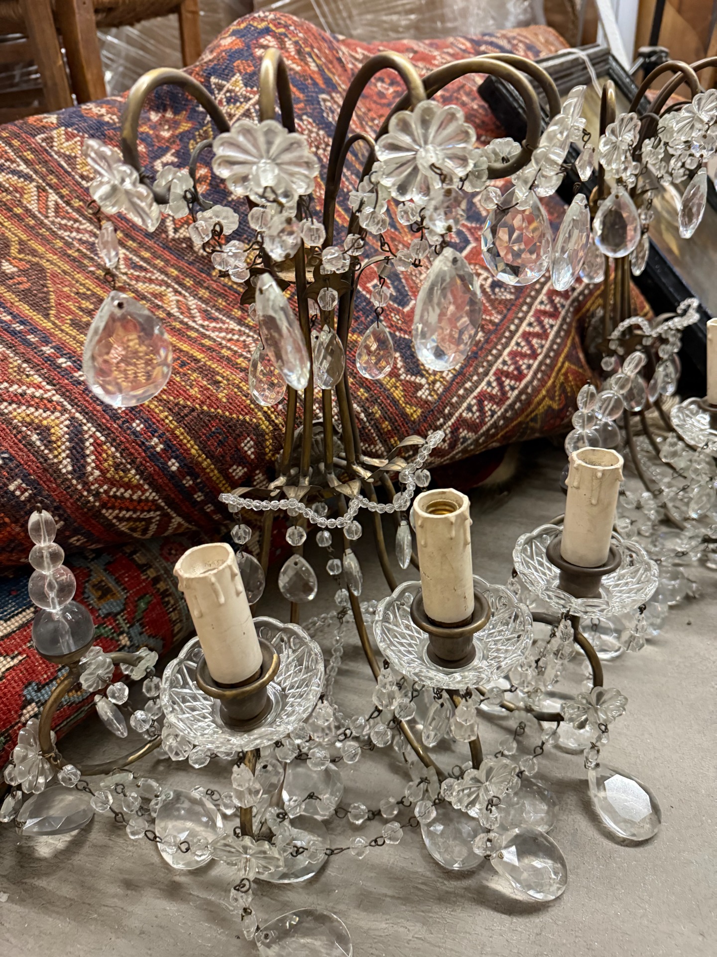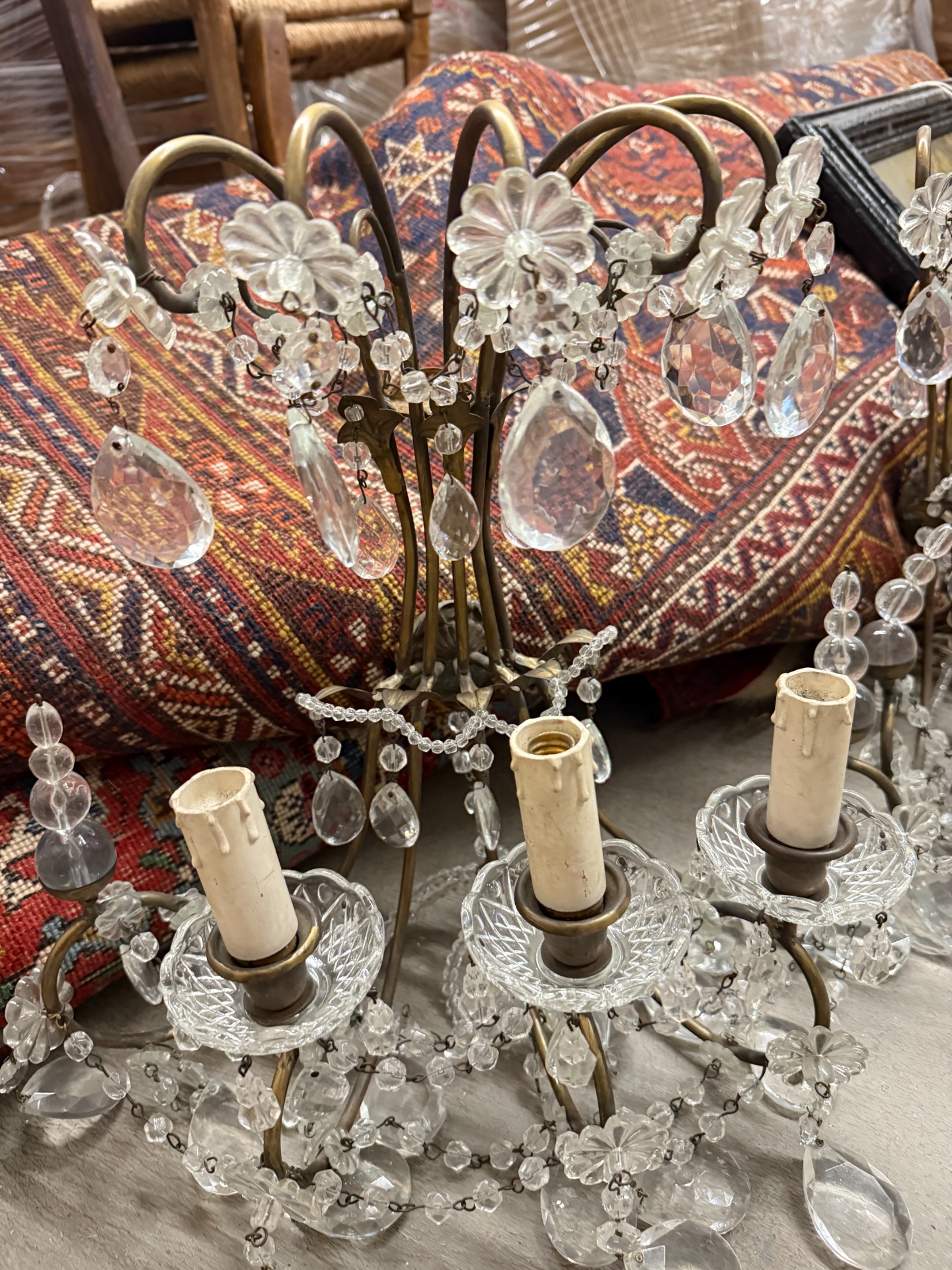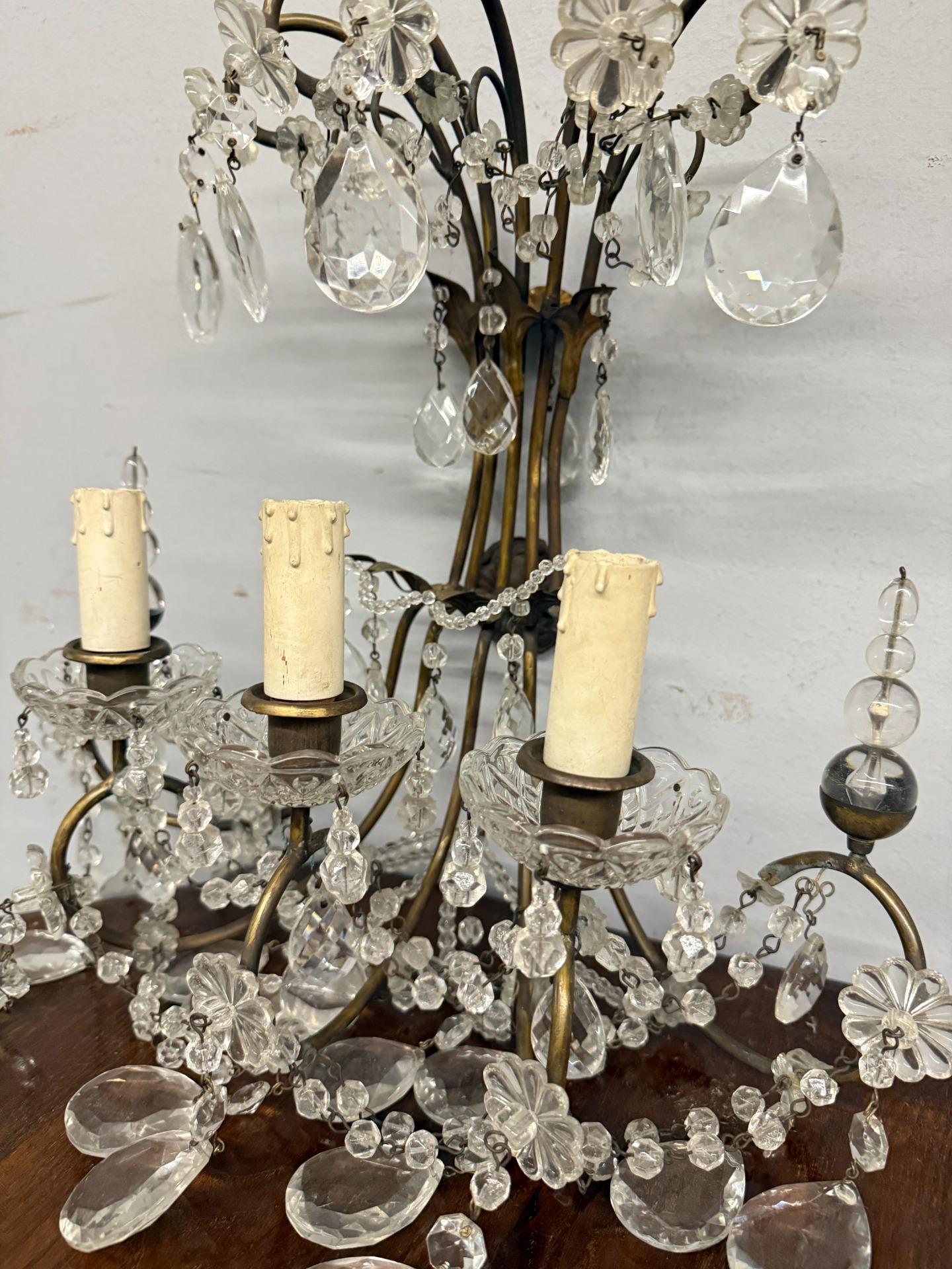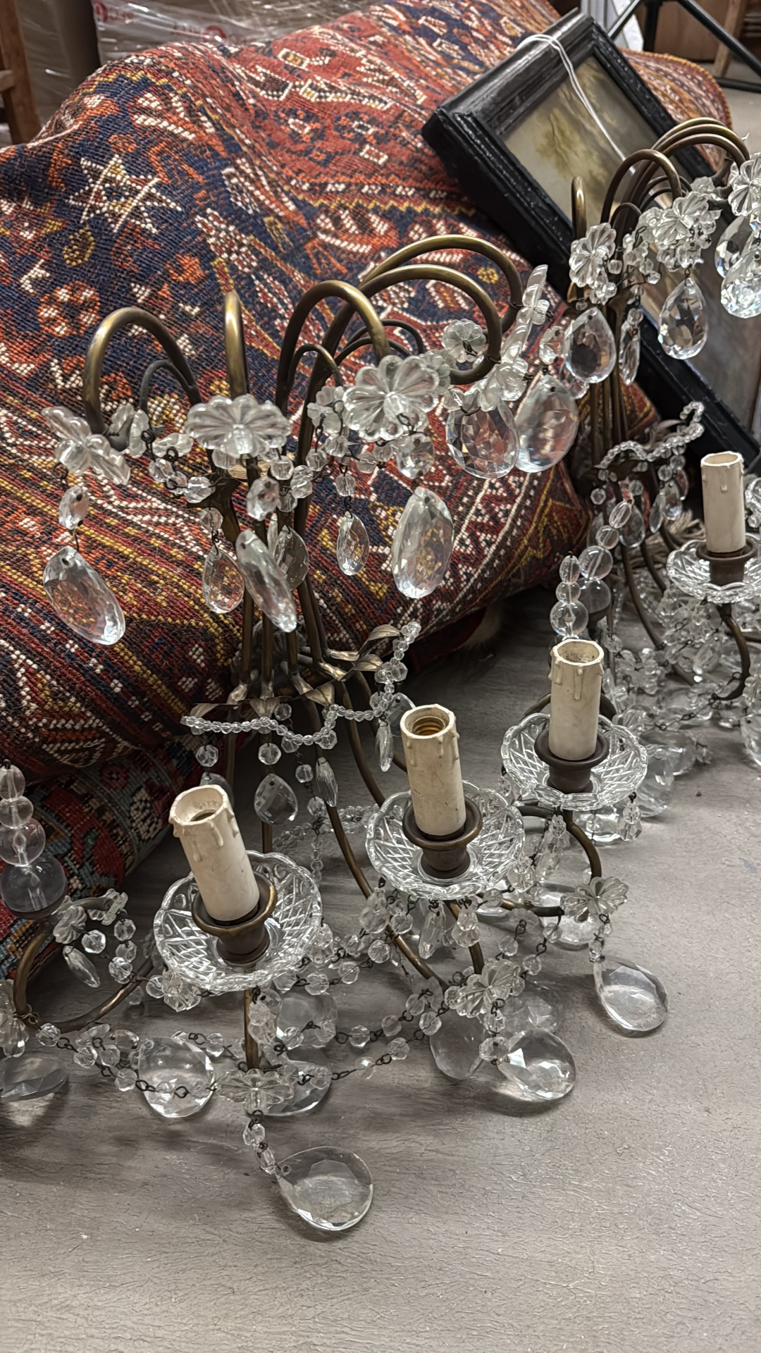 Antica coppia di appliques '900 a tre luci con gocce di cristallo 40x40x20cm