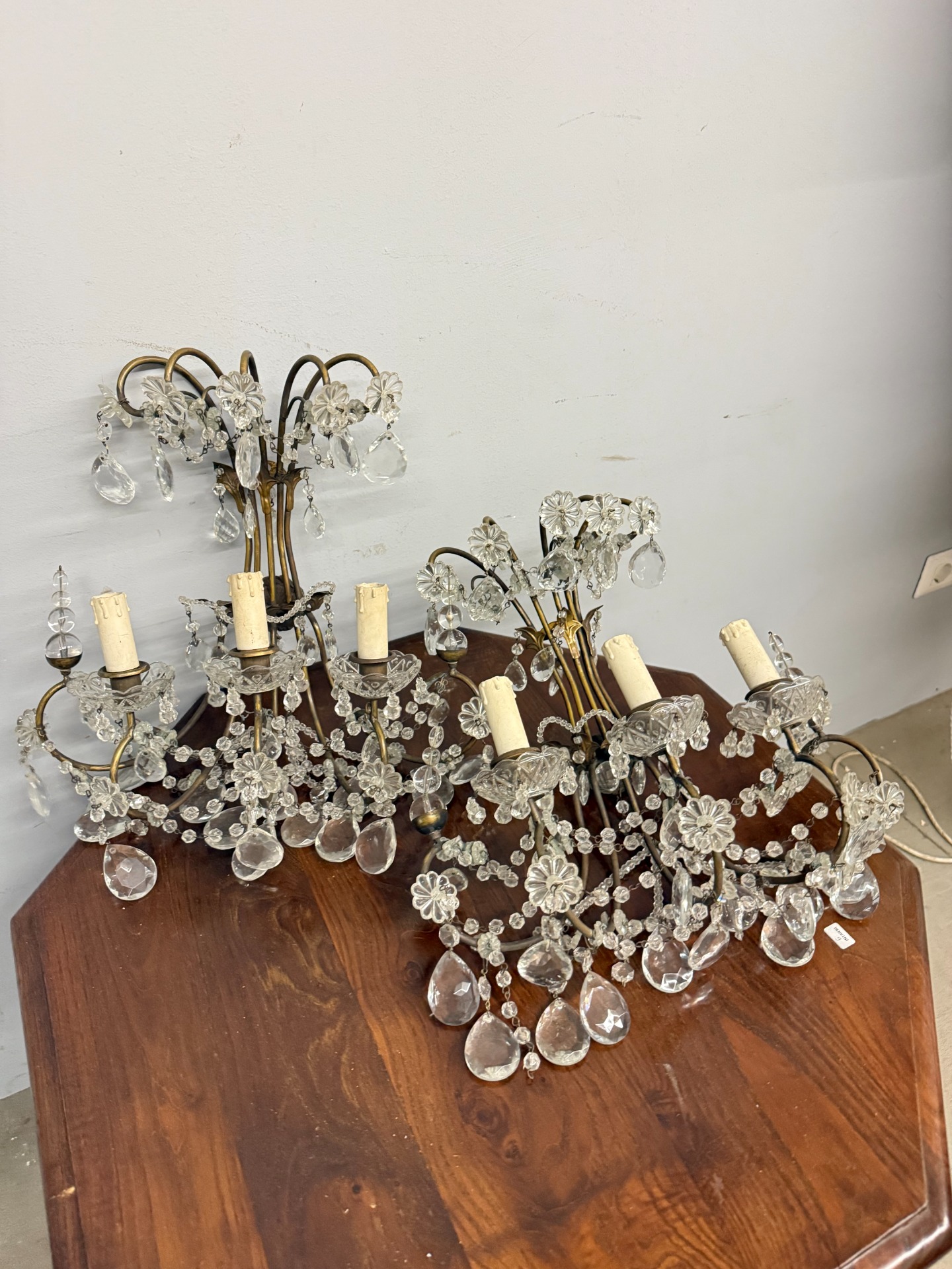 Antica coppia di appliques primi '900 a tre luci con gocce di cristallo molto belle ed elettrificate, mis 40x40x20cm. Buono stato di conservazione.