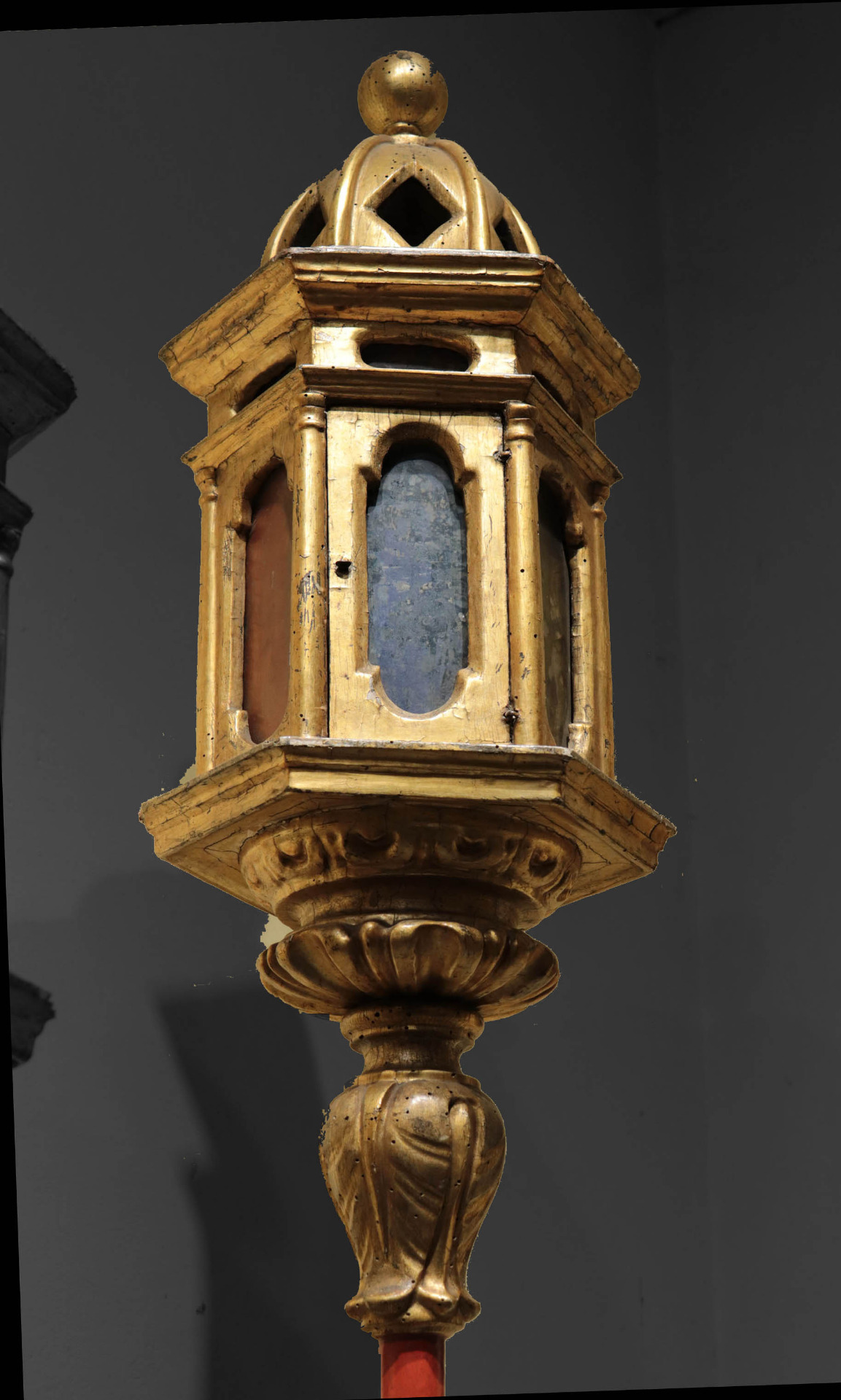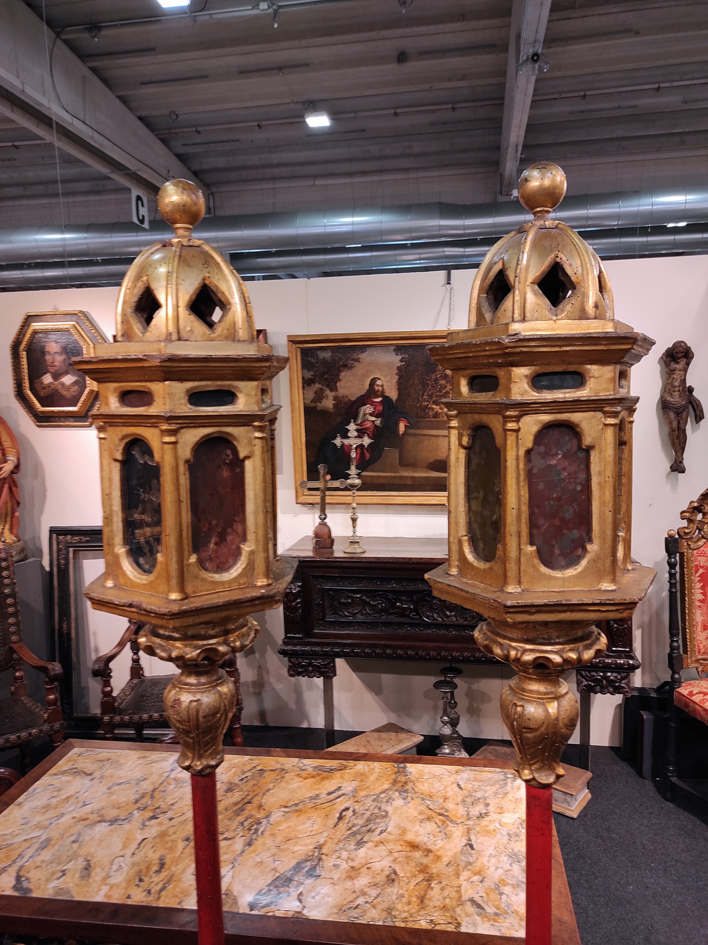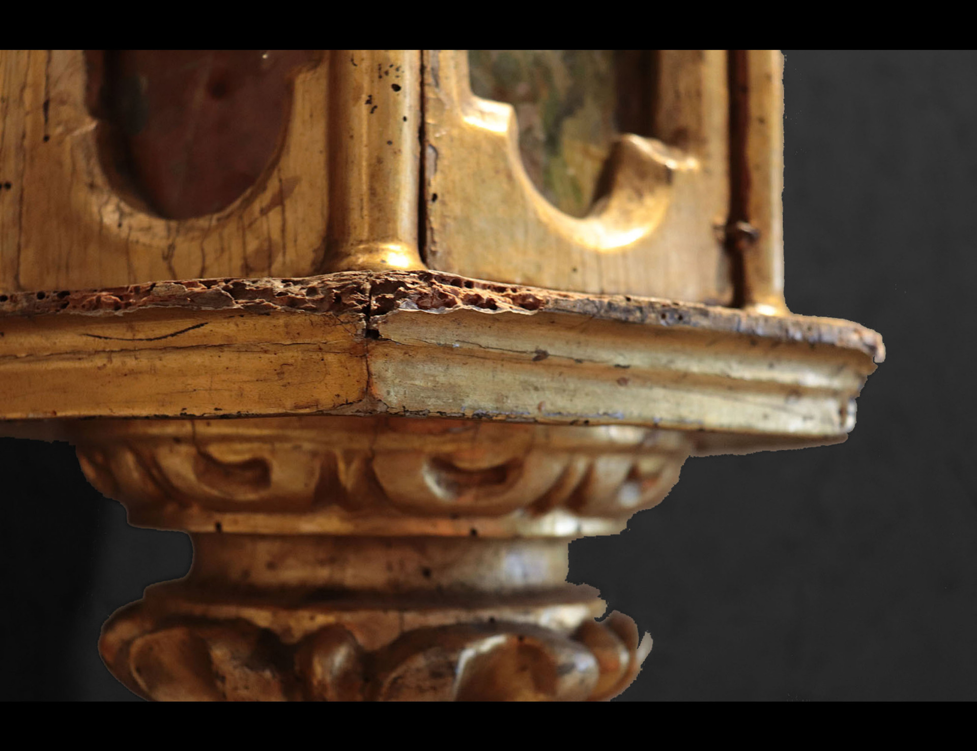 Coppia di lampioni in legno dorato a tempietto con colonne e sportellino apribile sormontate da cupola , poggianti su due piedistalli moderni in acciaio. Segni di usura dovuti dal tempo, ma che non ne intaccano la bellezza.