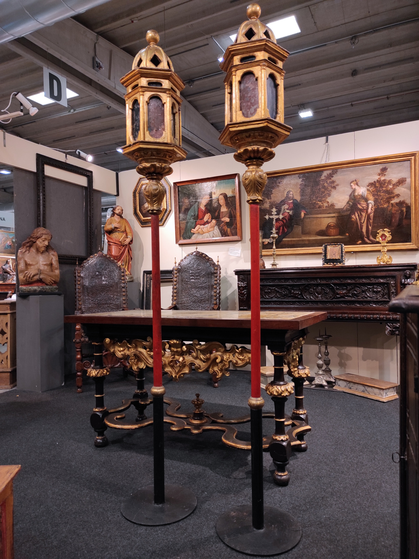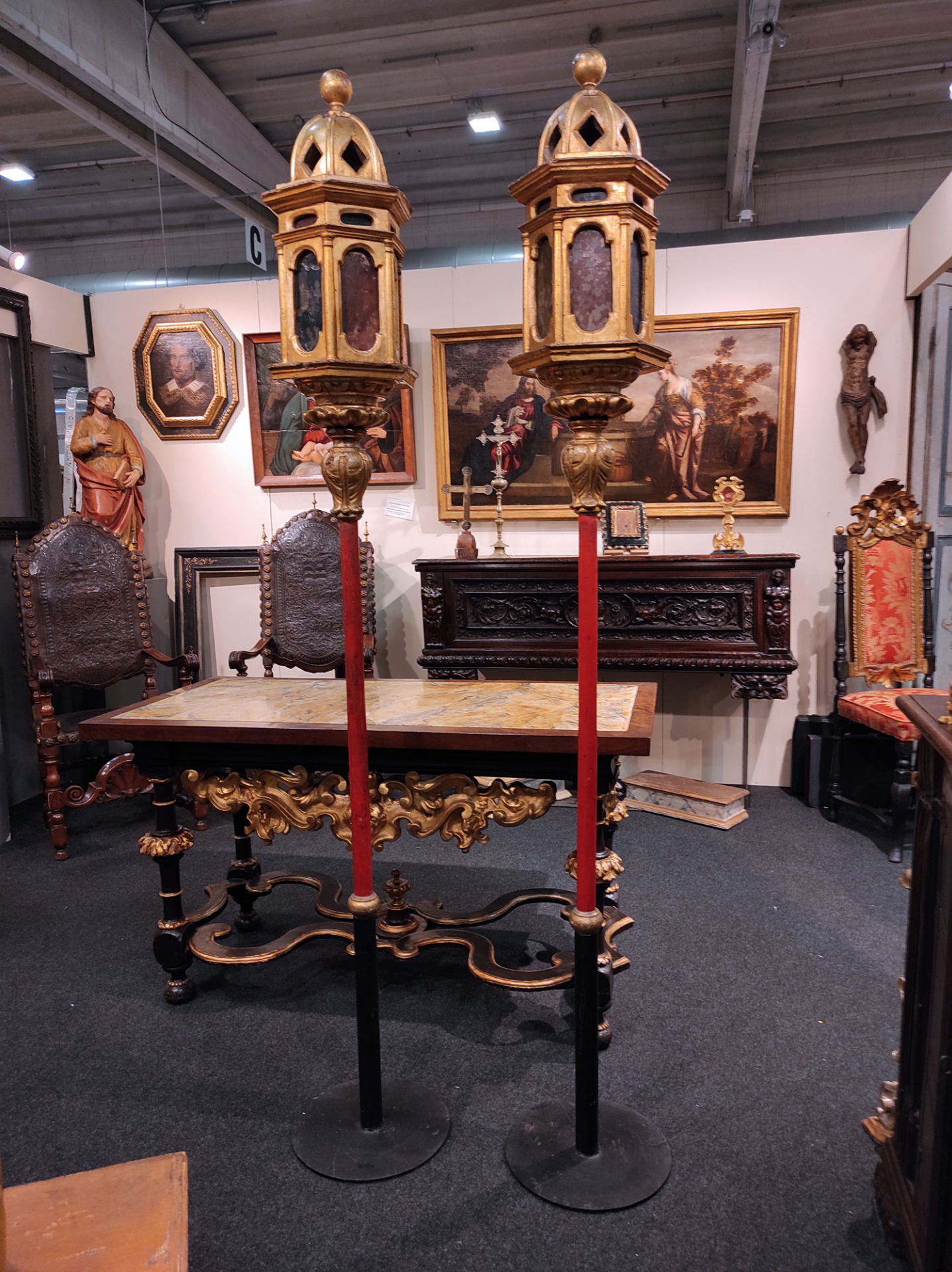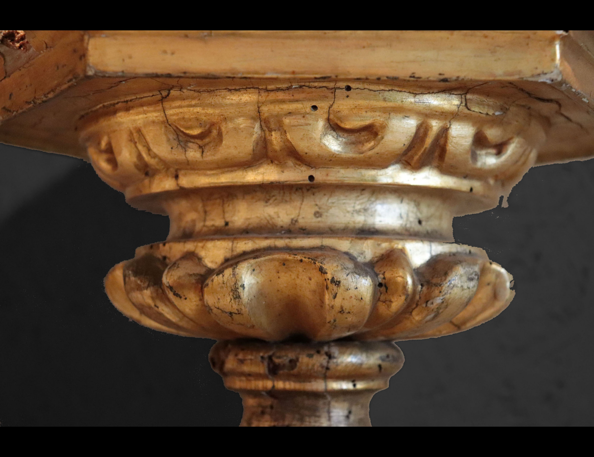 Coppia di lampioni in legno dorato a tempietto con colonne e sportellino apribile sormontate da cupola , poggianti su due piedistalli moderni in acciaio. Segni di usura dovuti dal tempo, ma che non ne intaccano la bellezza.