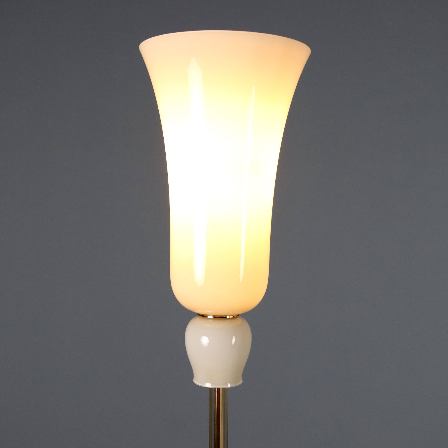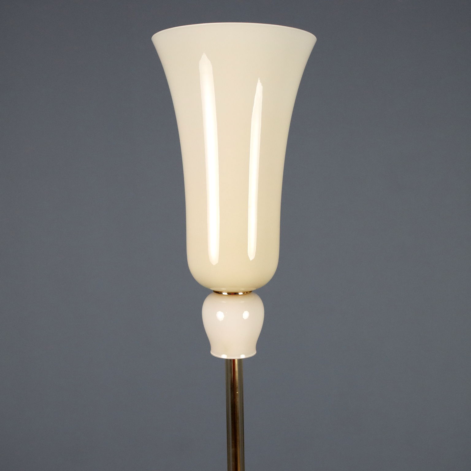 Elegante lampada da terra che richiama le forme degli anni '30 come suggerito dal nome con base in metallo, stelo e diffusore in vetro paglierino. Non monta lampade LED, 1 lampadina con attacco E27 max 250 watt.