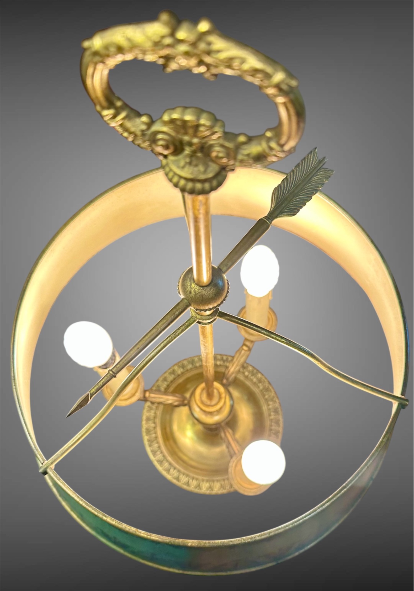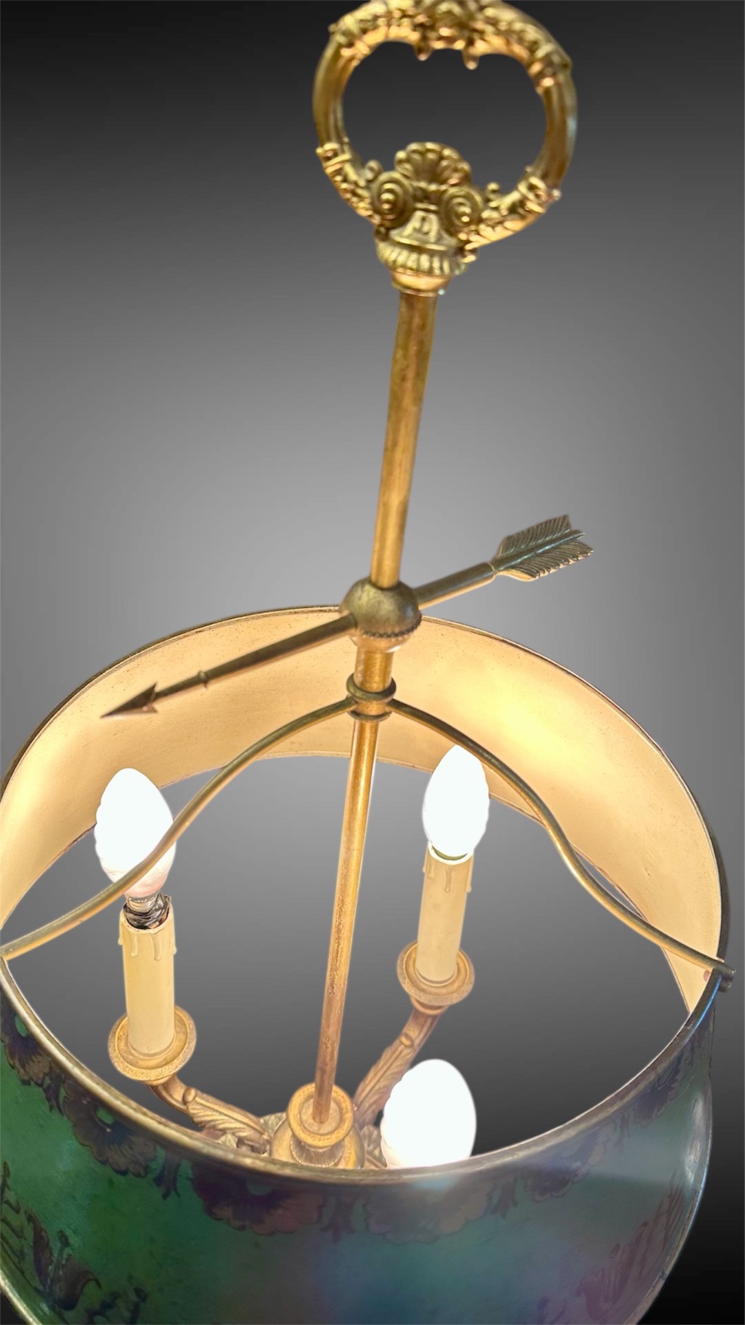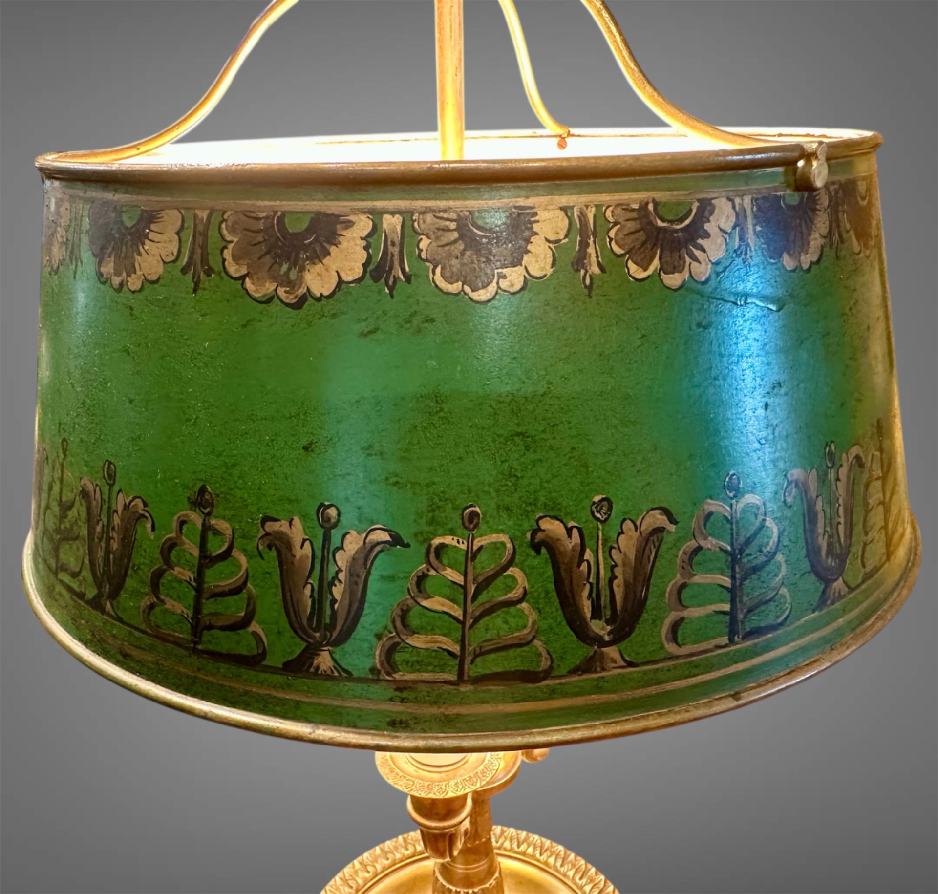 Il paralume originale in metallo verniciato verde è decorato con motivi floreali e fogliacei dorati, tipici dello stile Impero.