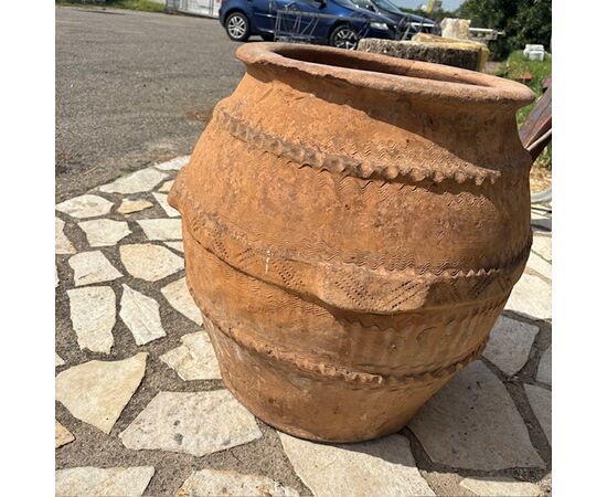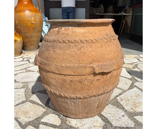 Antico grande orcio vaso terracotta da esterno XVIII sec . Molto bello con lavorazione a rilievo . Altezza cm 60 . Diametro bocca superiore cm 42 . Stato molto buono .