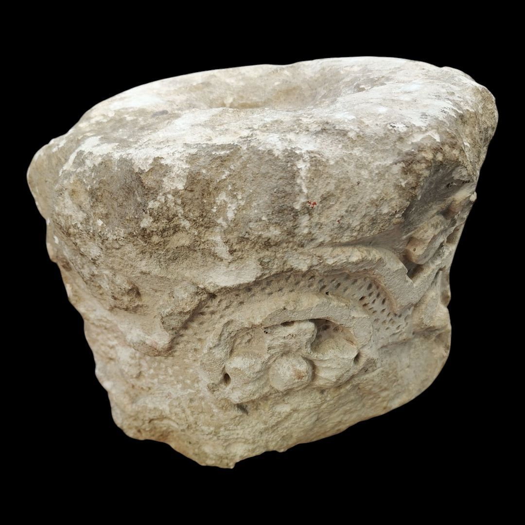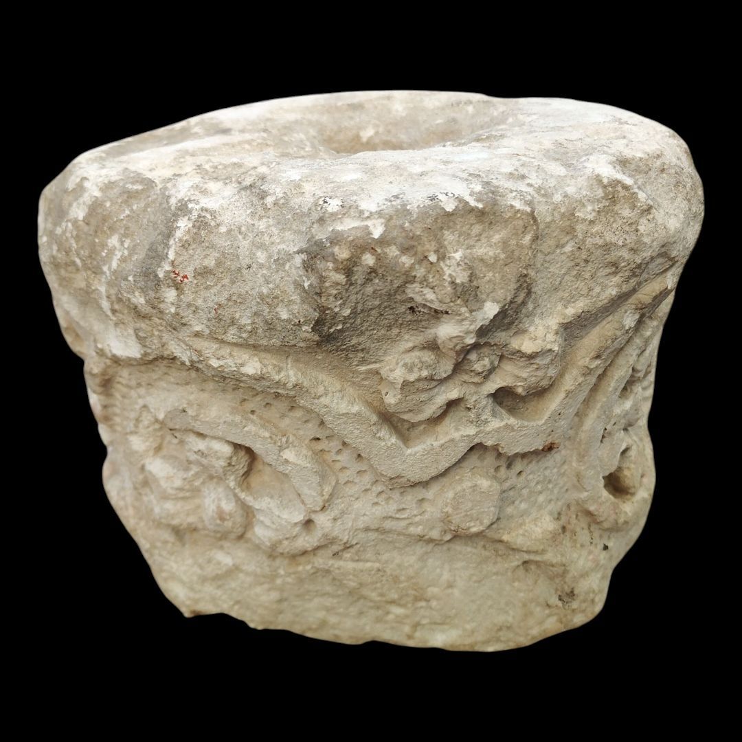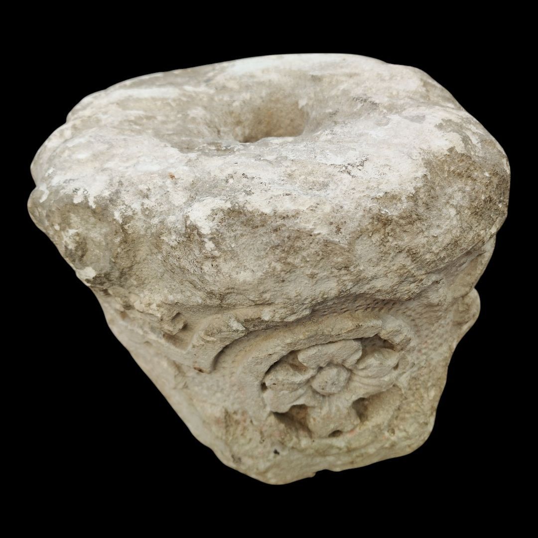 Raffinato capitello romanico in pietra decorato con rose camune.Evidenti segni di usura. Diametro massimo 24 cm Altezza 18